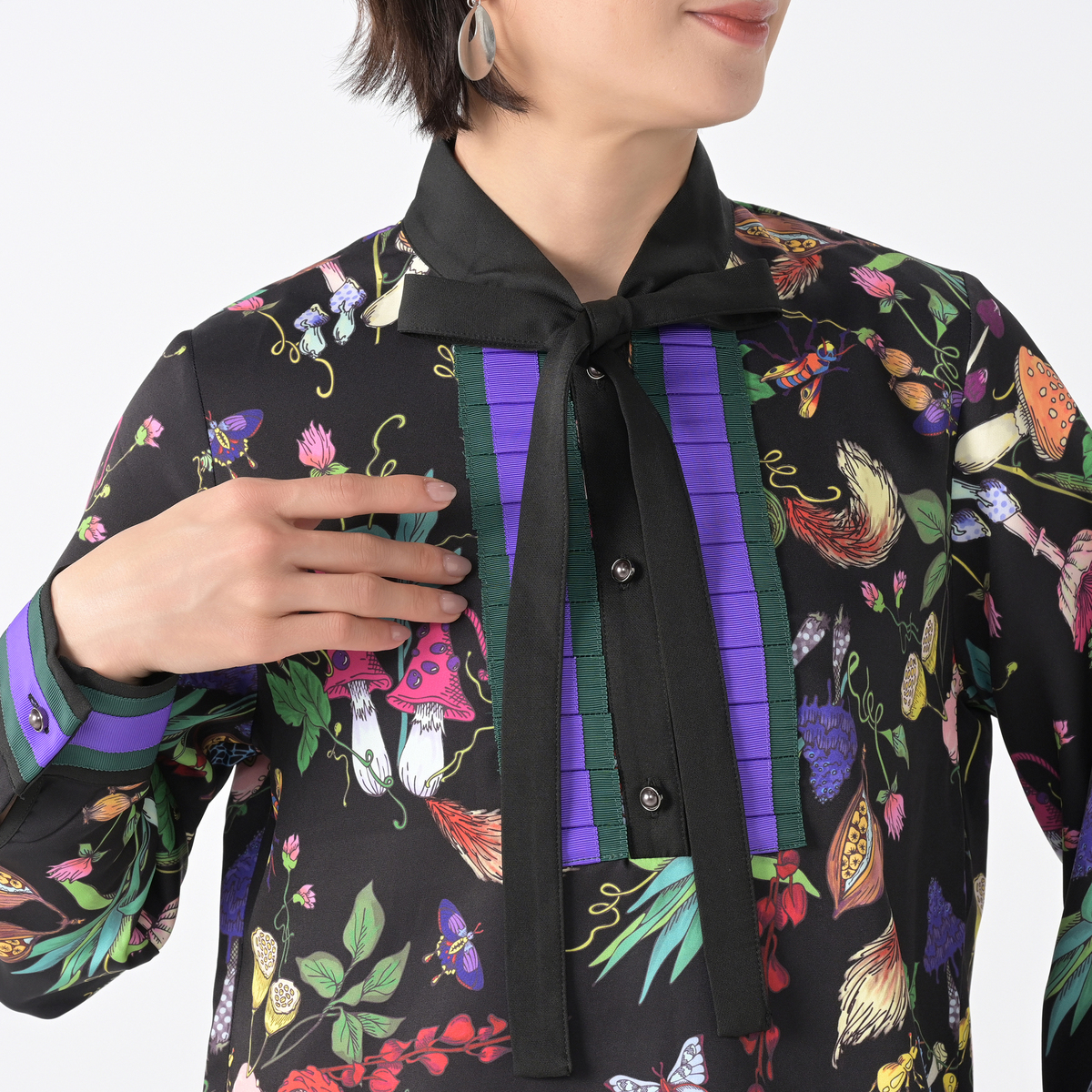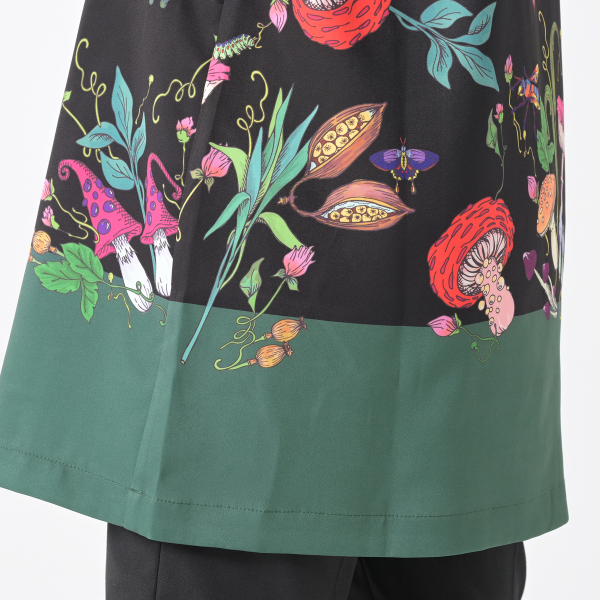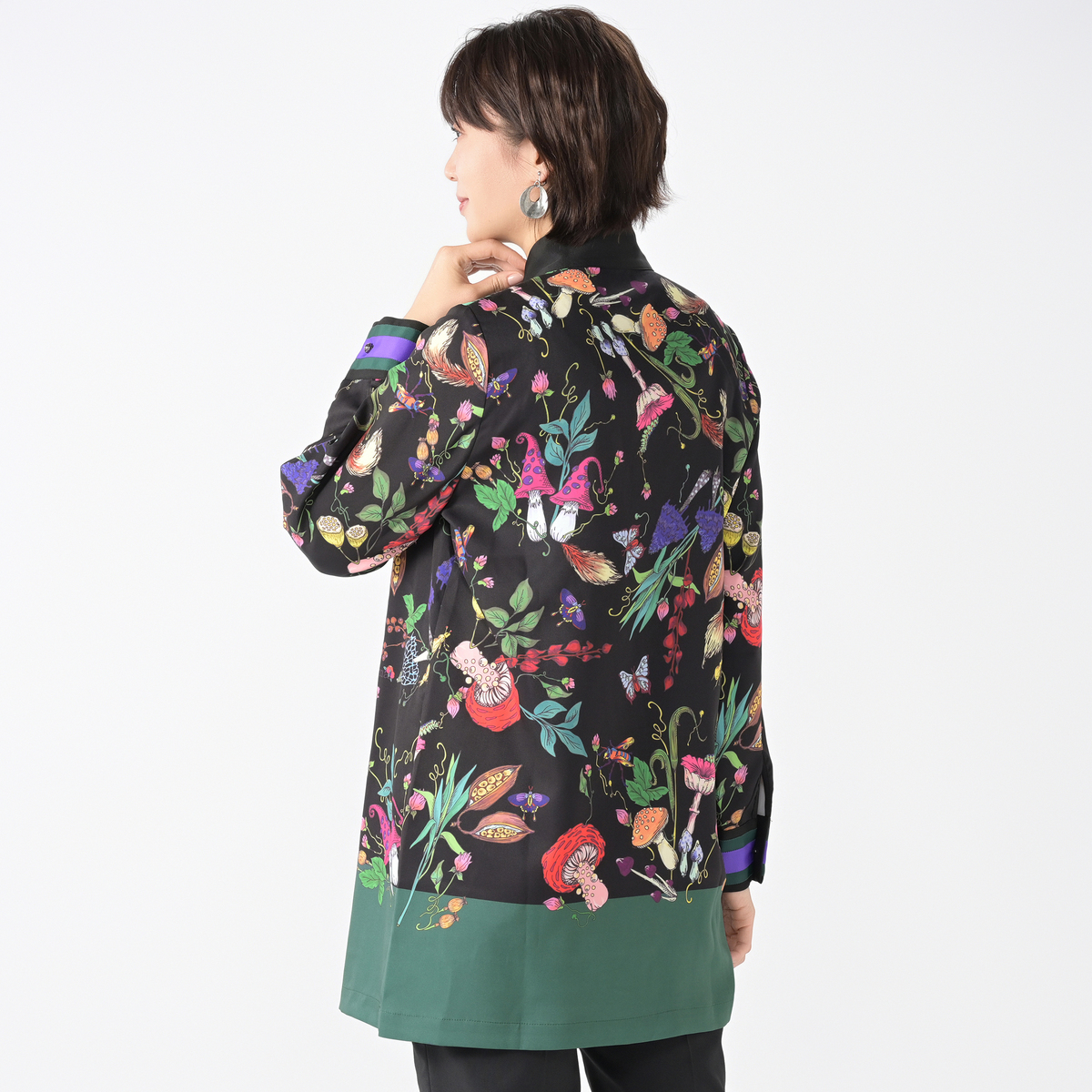 きのこや昆虫をモチーフにしたパネルプリントを全面にあしらったロングブラウスです。繊細な筆のタッチを、インクジェットプリントで近くで見ても楽しめるように仕上げています