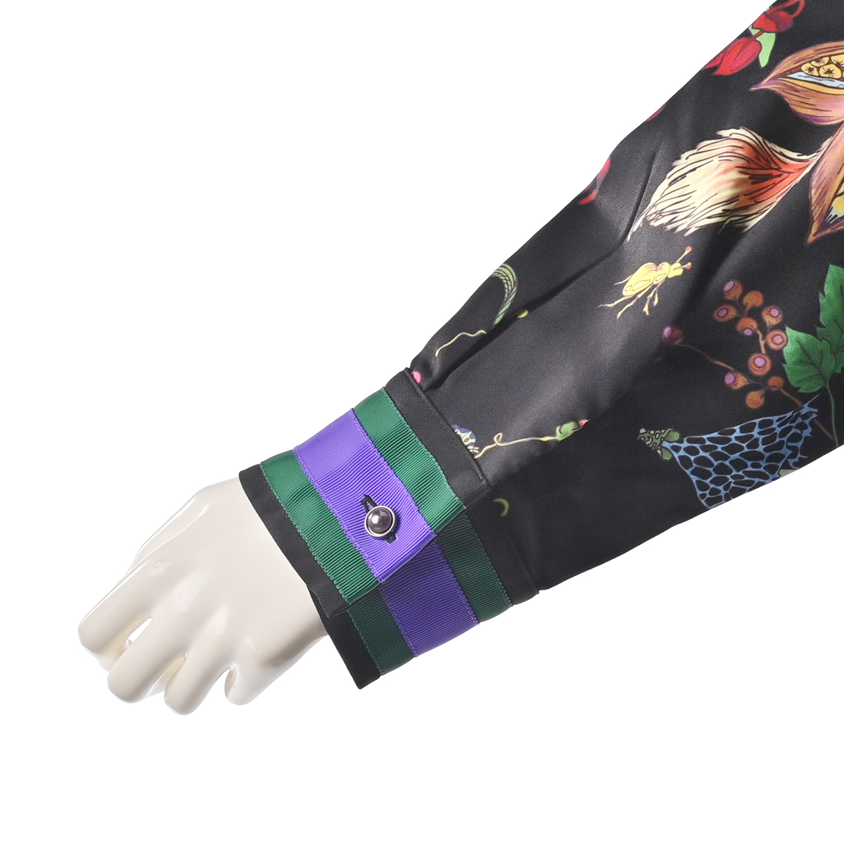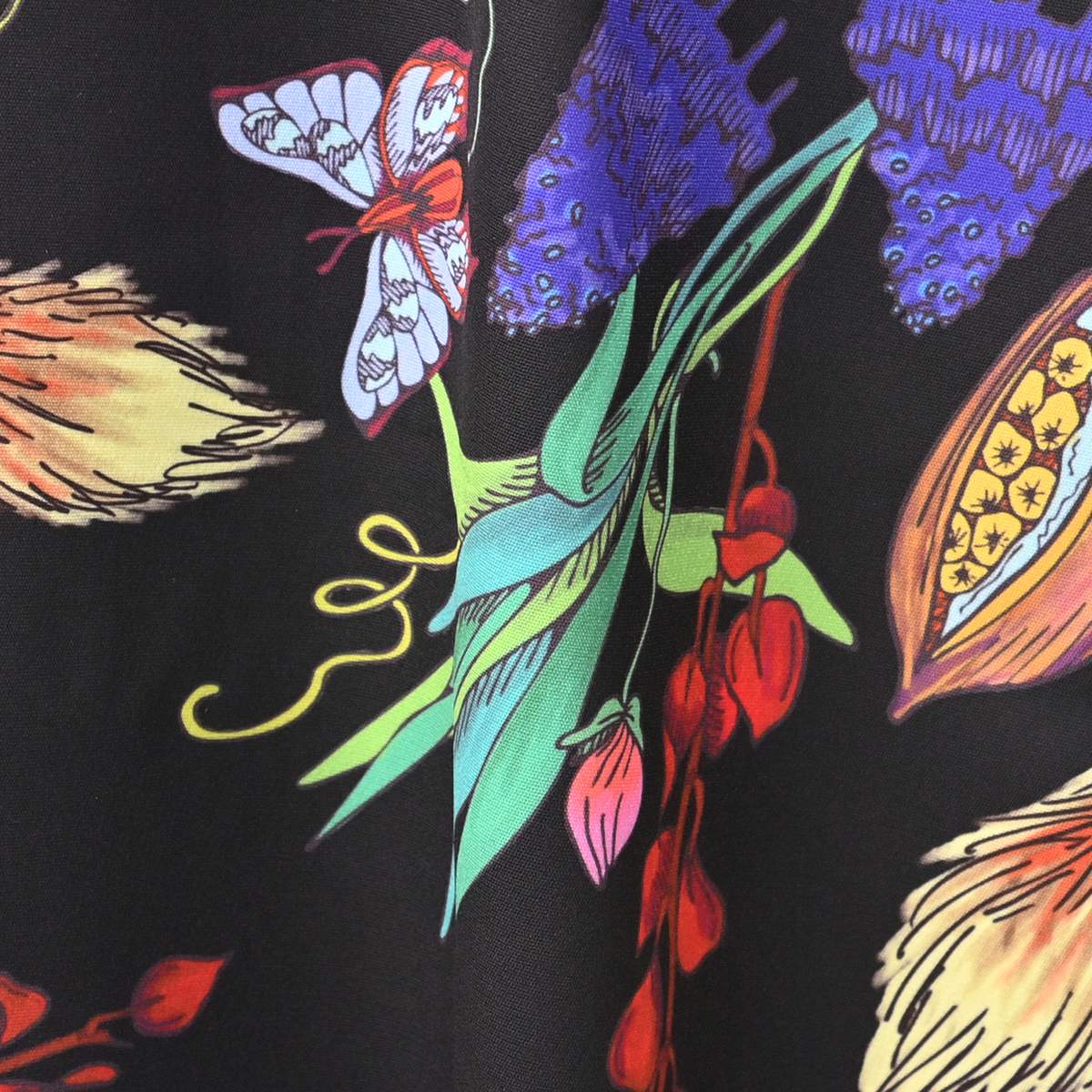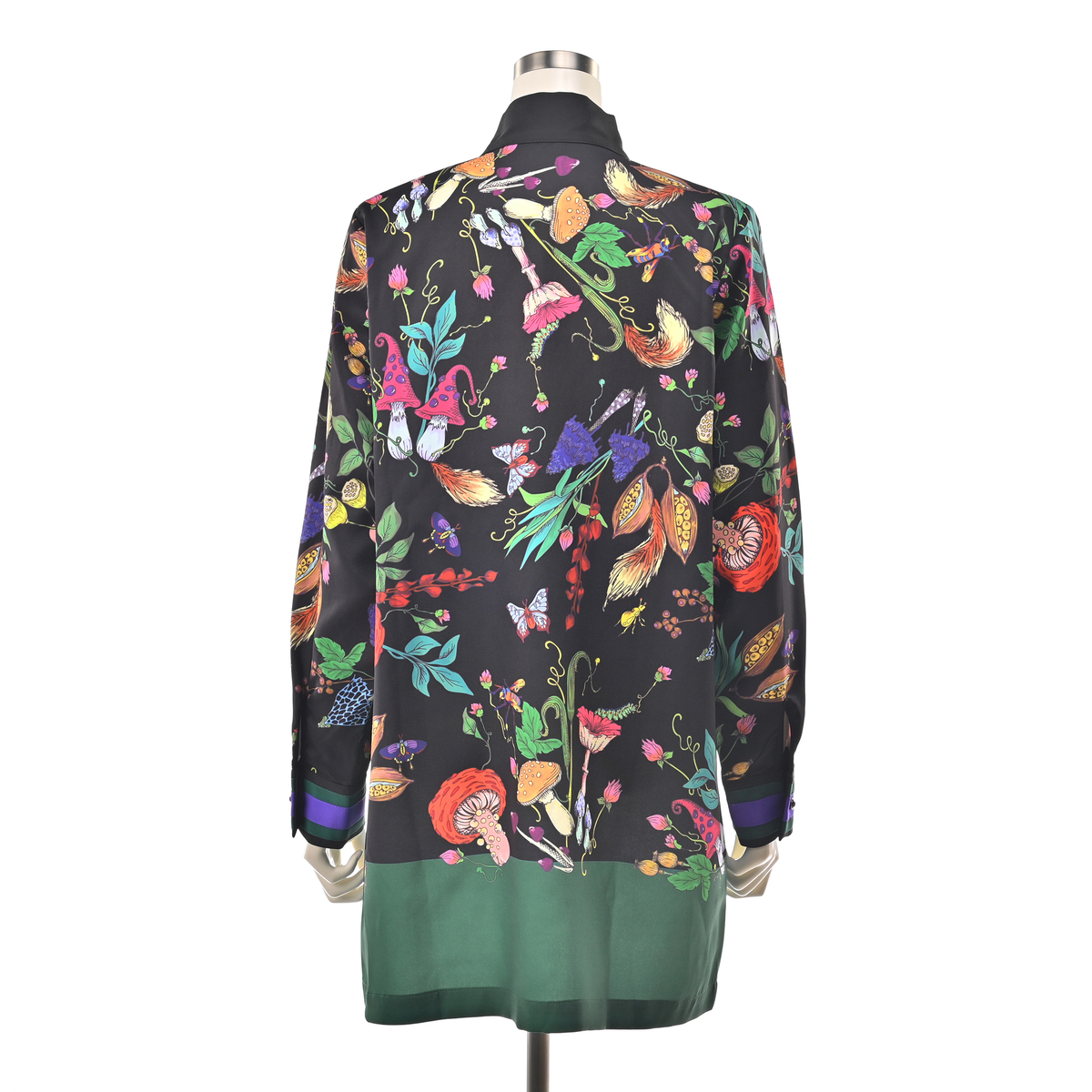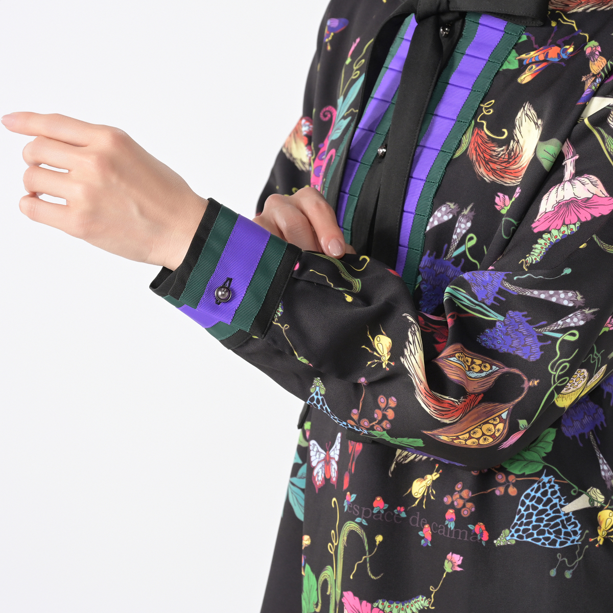 きのこや昆虫をモチーフにしたパネルプリントを全面にあしらったロングブラウスです。繊細な筆のタッチを、インクジェットプリントで近くで見ても楽しめるように仕上げています