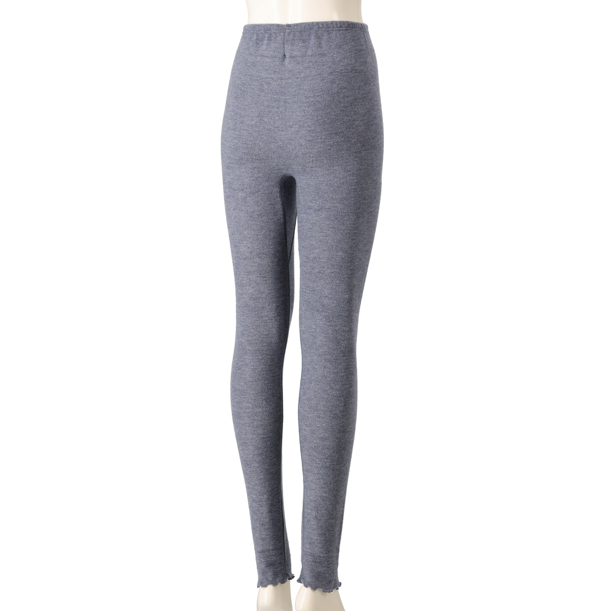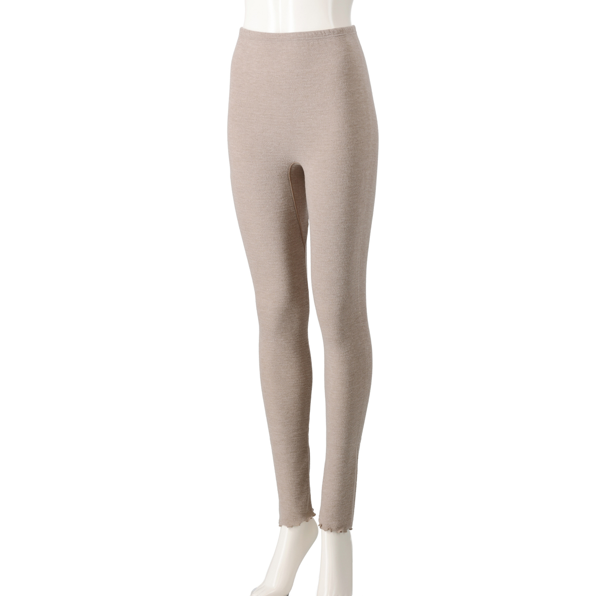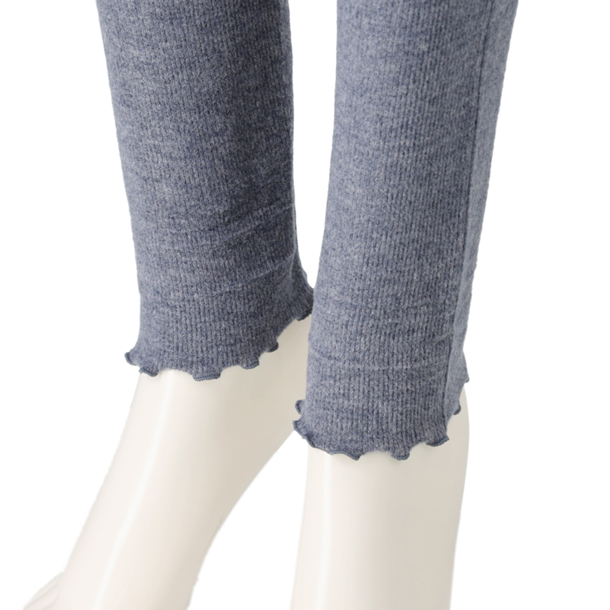 旭化成の吸湿発熱素材サーモギアを使用したレギンス。袋編み2重組織の起毛素材でボリューム感があり、起毛の毛足が空気をふんわりと抱き込んで暖かです。裾はフリル感が可愛いメロー仕上げでさりげなくおしゃれに仕上げました