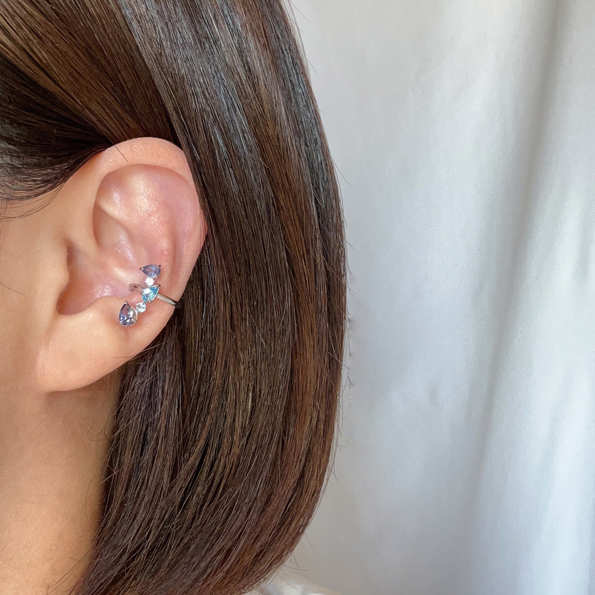 マルチカラーの天然石を耳のラインに沿って縦長にあしらった片耳用のイヤーカフ。シルバーカラー(ブルー系の石)、ゴールドカラー(ピンク系の石)の2色からお選び頂けます