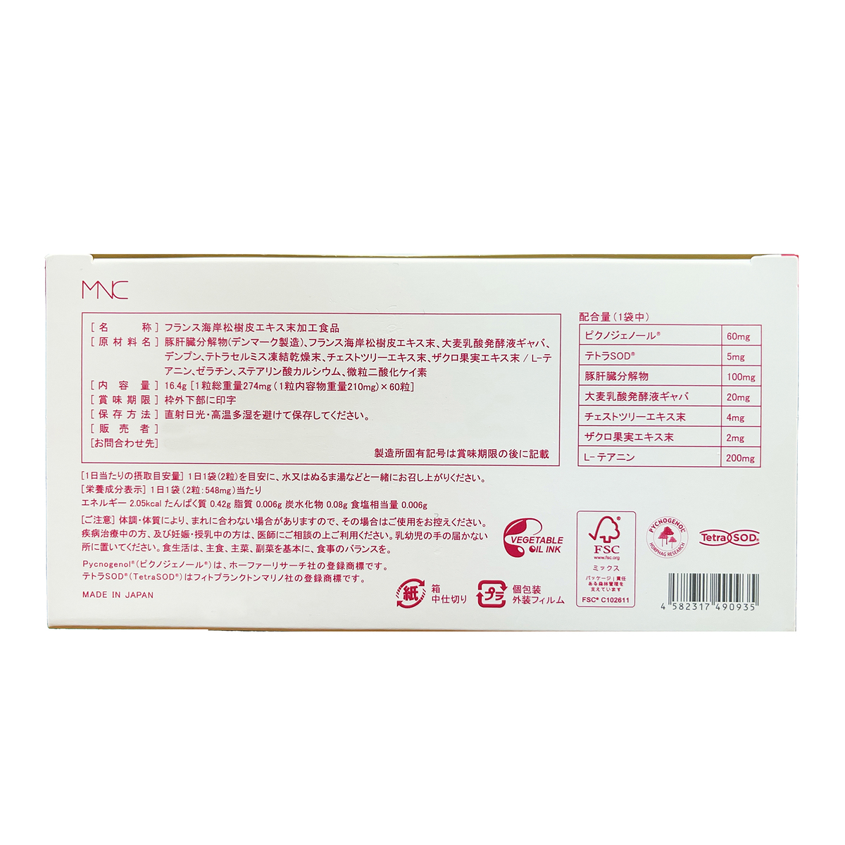[アレルギー物質特定原材料8品目] なし [内容量] 60粒(30袋) [目安量] 1日1袋(2粒) [お召し上がり方] 水又はぬるま湯などと一緒にお召し上がりください [保存方法] 直射日光・高温多湿を避けて保存してください [注意事項] ※疾病治療中の方、及び妊娠・授乳中の方は、医師にご相談の上ご利用ください ※体調・体質により、まれに合わない場合がありますので、その場合はご使用をお控えください ※乳幼児の手の届かないところに保管してください ※食生活は、主食、主菜、副菜を基本に、食事のバランスを [原料原産地] 豚肝臓分解物(デンマーク製造) [原産国] 日本 [原材料] 豚肝臓分解物(デンマーク製造)、フランス海岸松樹皮エキス末、大麦乳酸発酵液ギャバ、デンプン、テトラセルミス凍結乾燥末、チェストツリーエキス末、ザクロ果実エキス末 / L-テアニン、ゼラチン、ステアリン酸カルシウム、微粒二酸化ケイ素