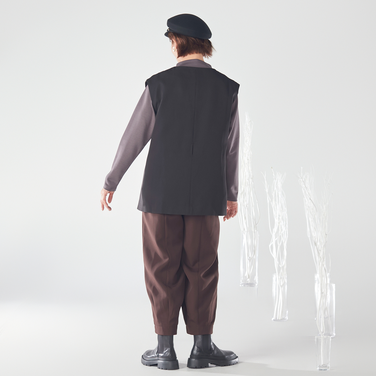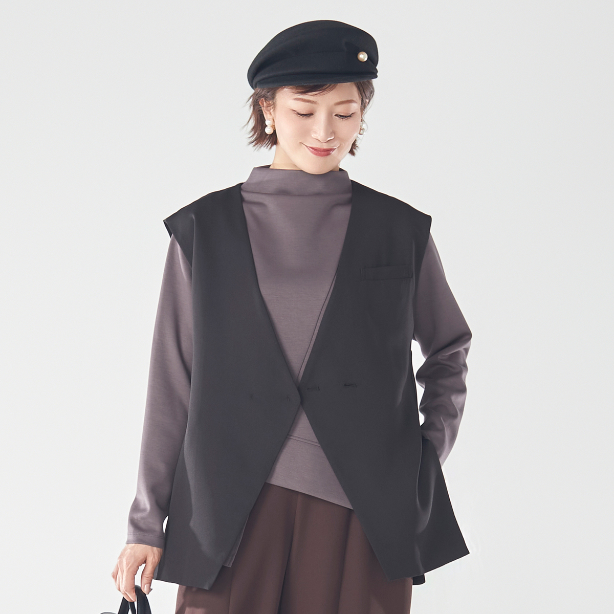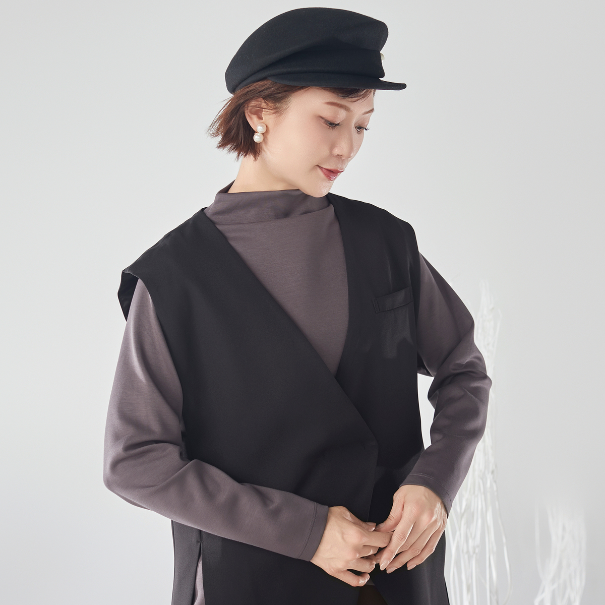 裾に変化をつけたデザインが目を引くVネックジレ。着回しがしやすく、シンプルながらも洗練された印象を与え、普段のコーディネートを格上げしてくれます