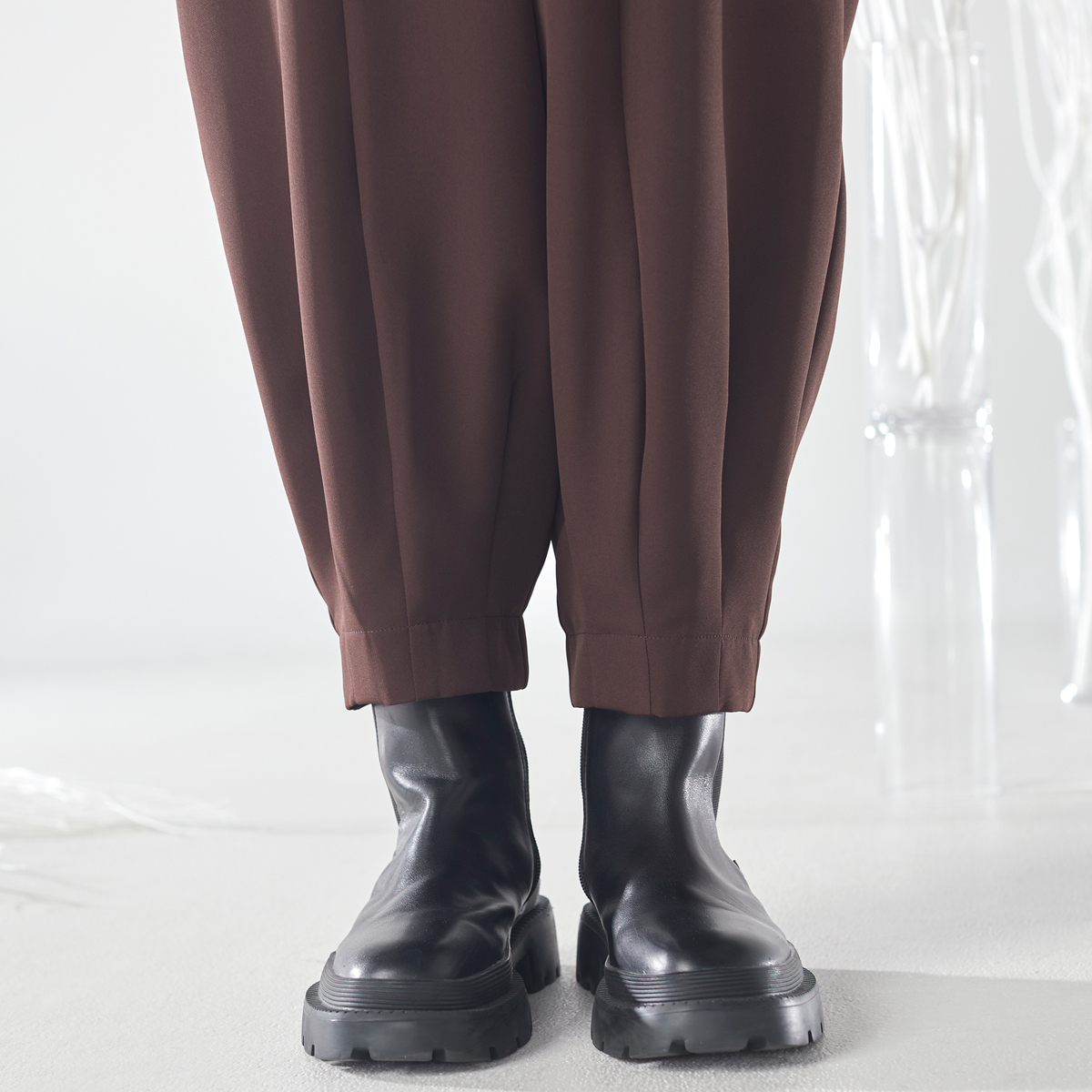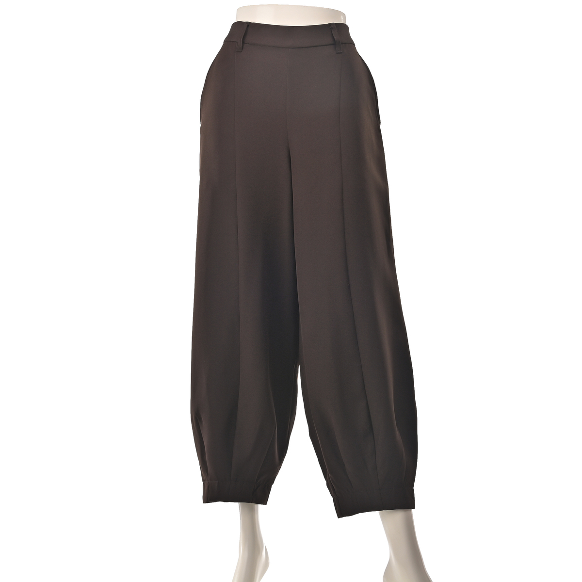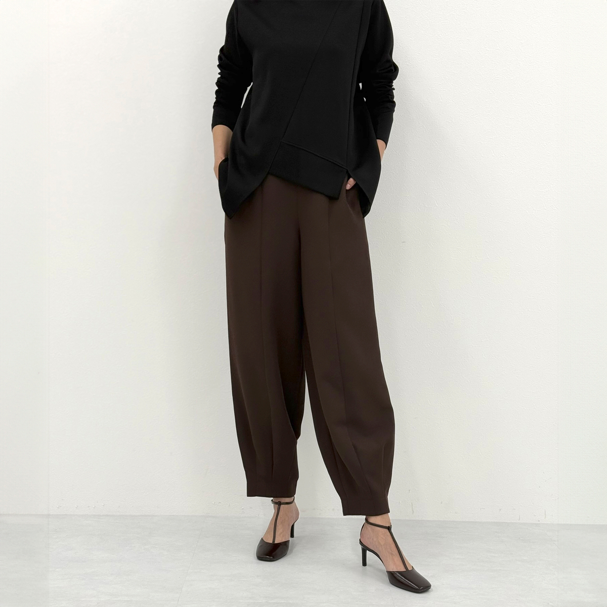 裾口のダーツ使いでシルエットにメリハリを持たせたワイドパンツ。フロントの剥ぎが脚をすっきり見せ、スタイルアップ効果も期待できるデザインです