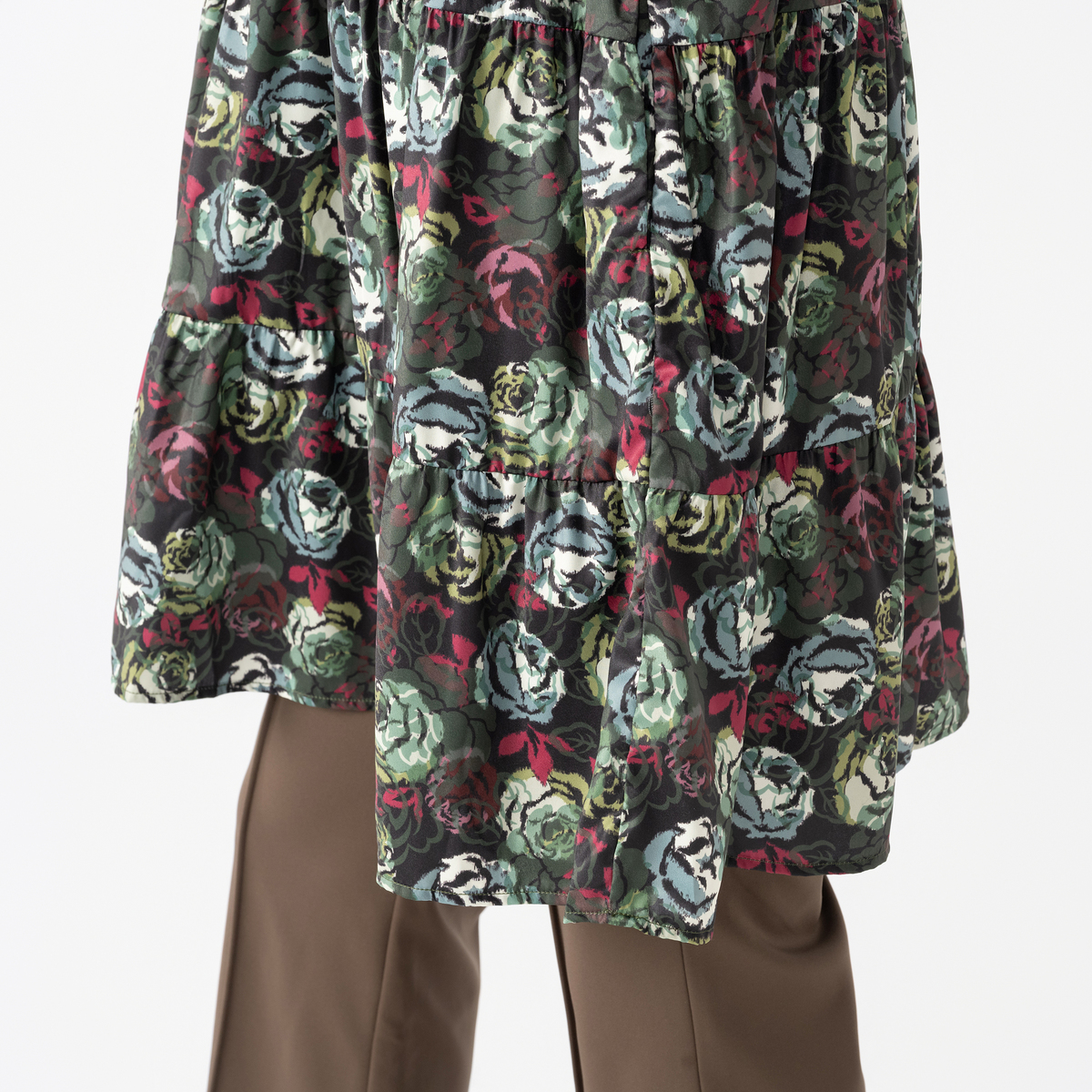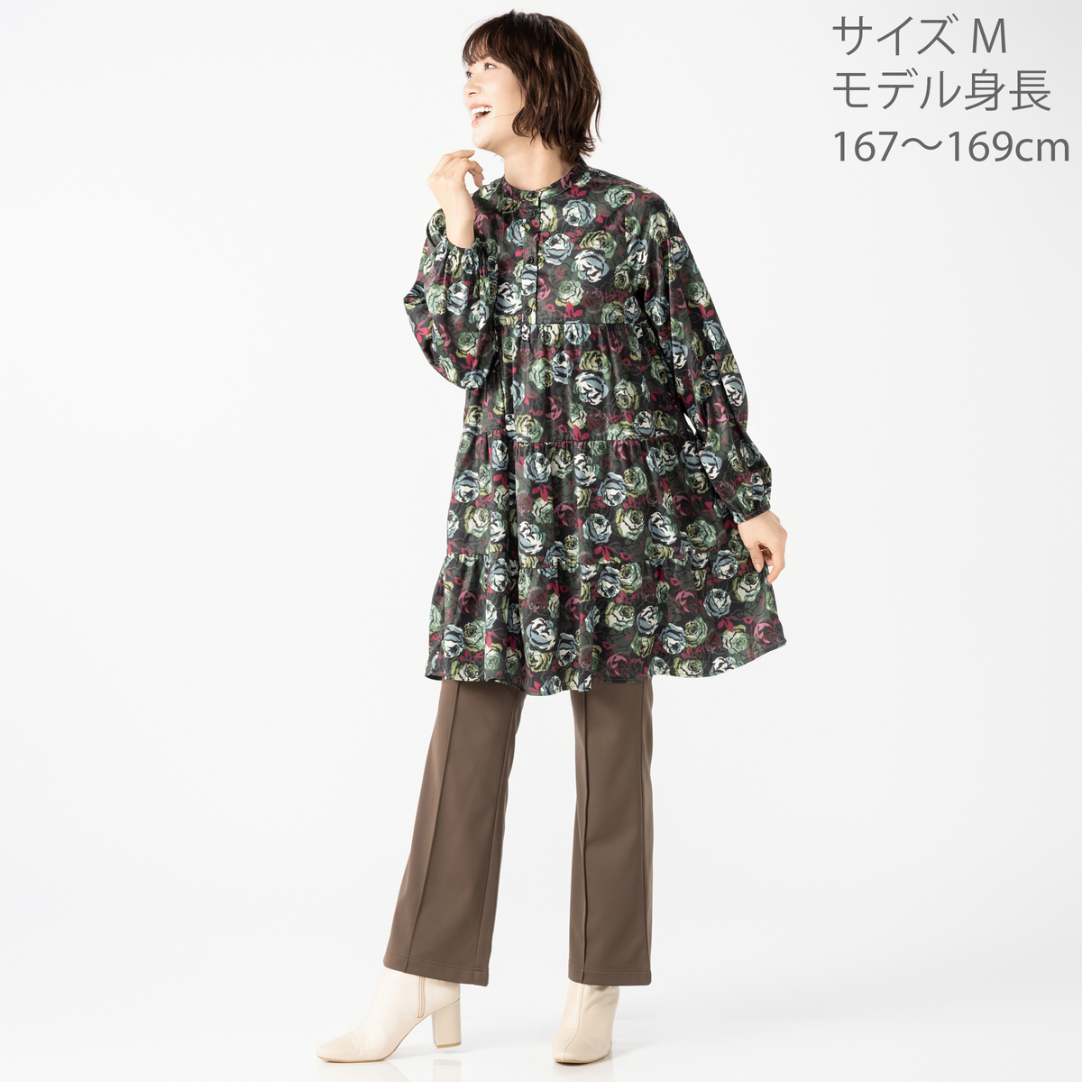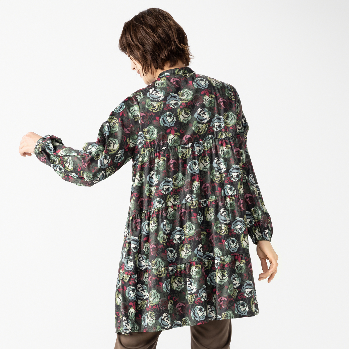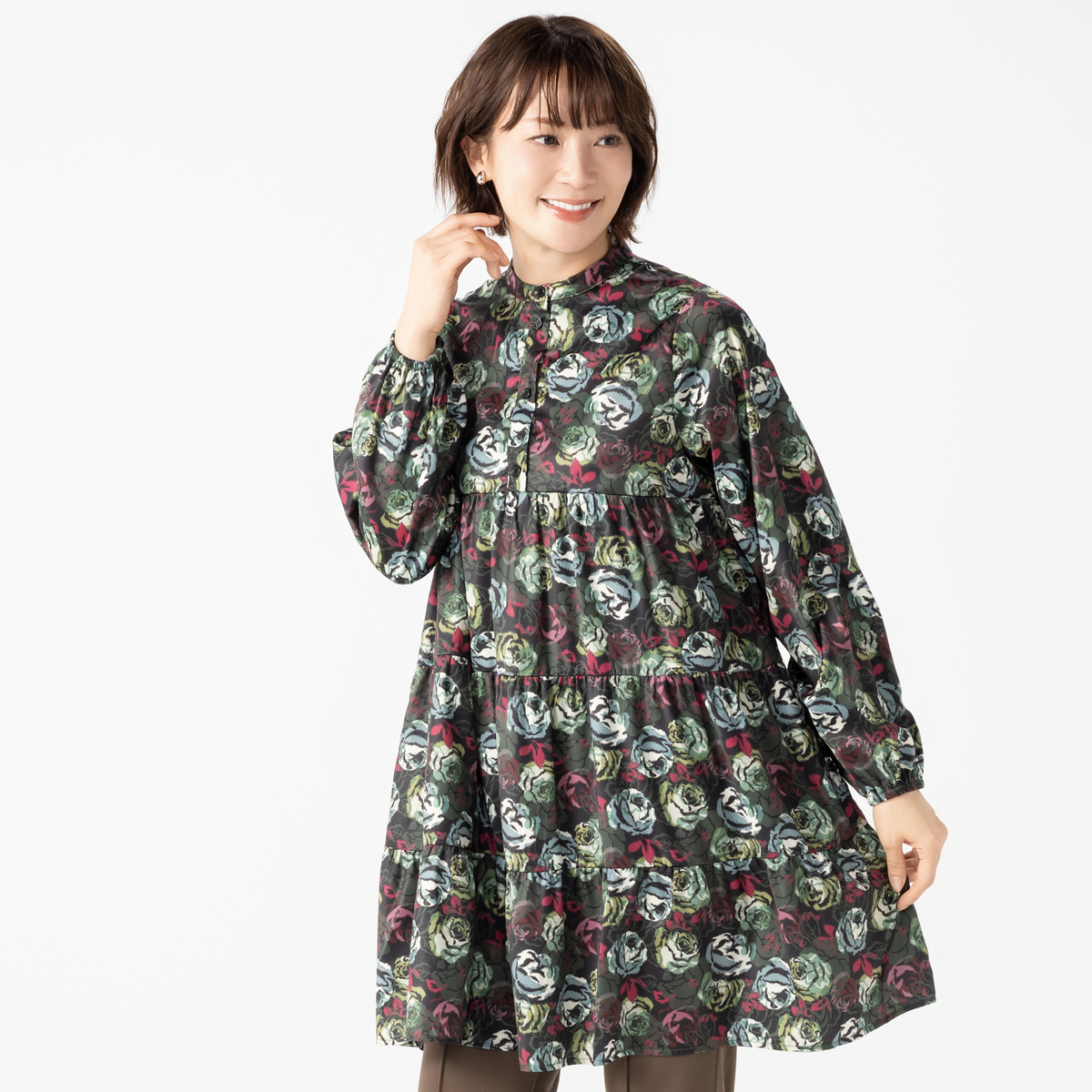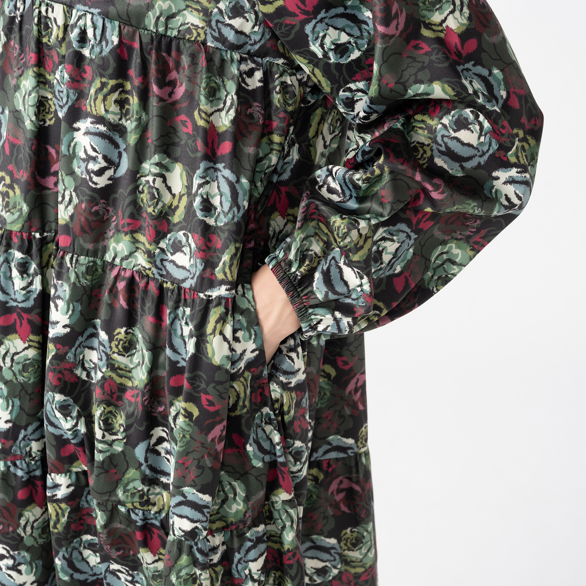 アンティークフラワー柄が印象的なティアードワンピースです。クリスマスローズからイメージを膨らませてモダンアート風に。広がりすぎない3段切替のティアードで、大人のきれいめな着こなしを叶えます