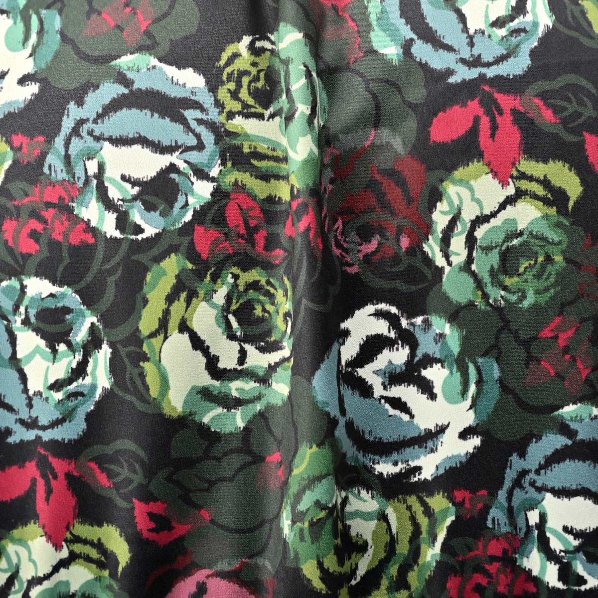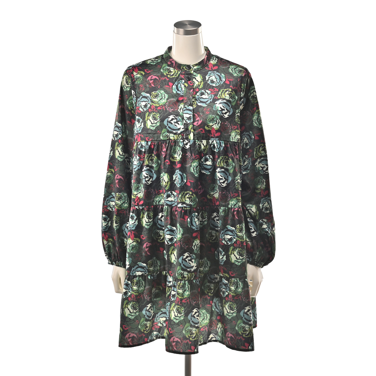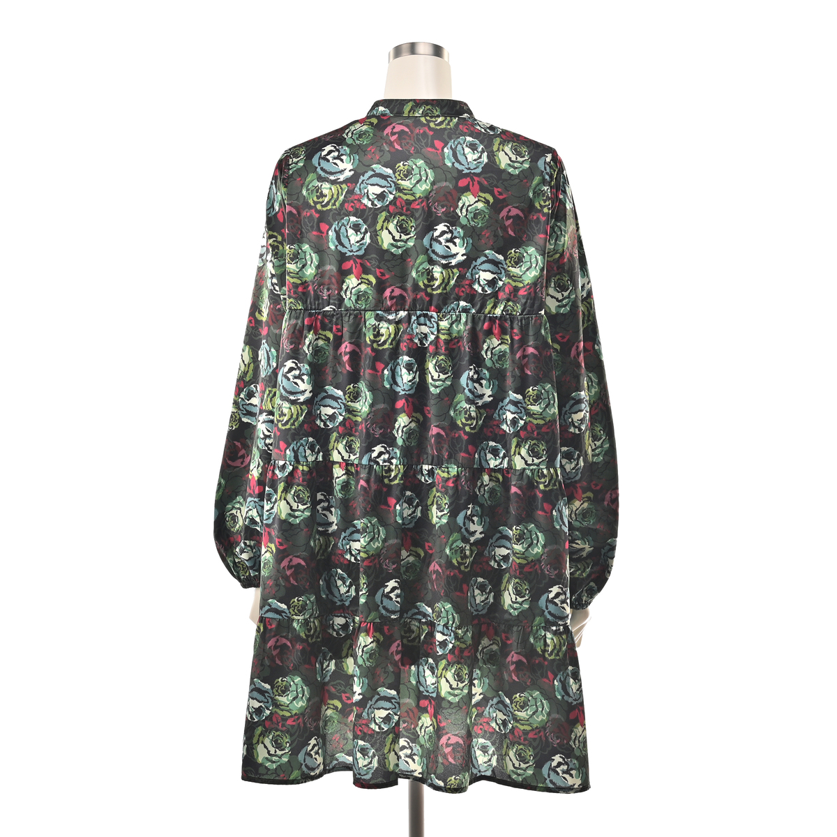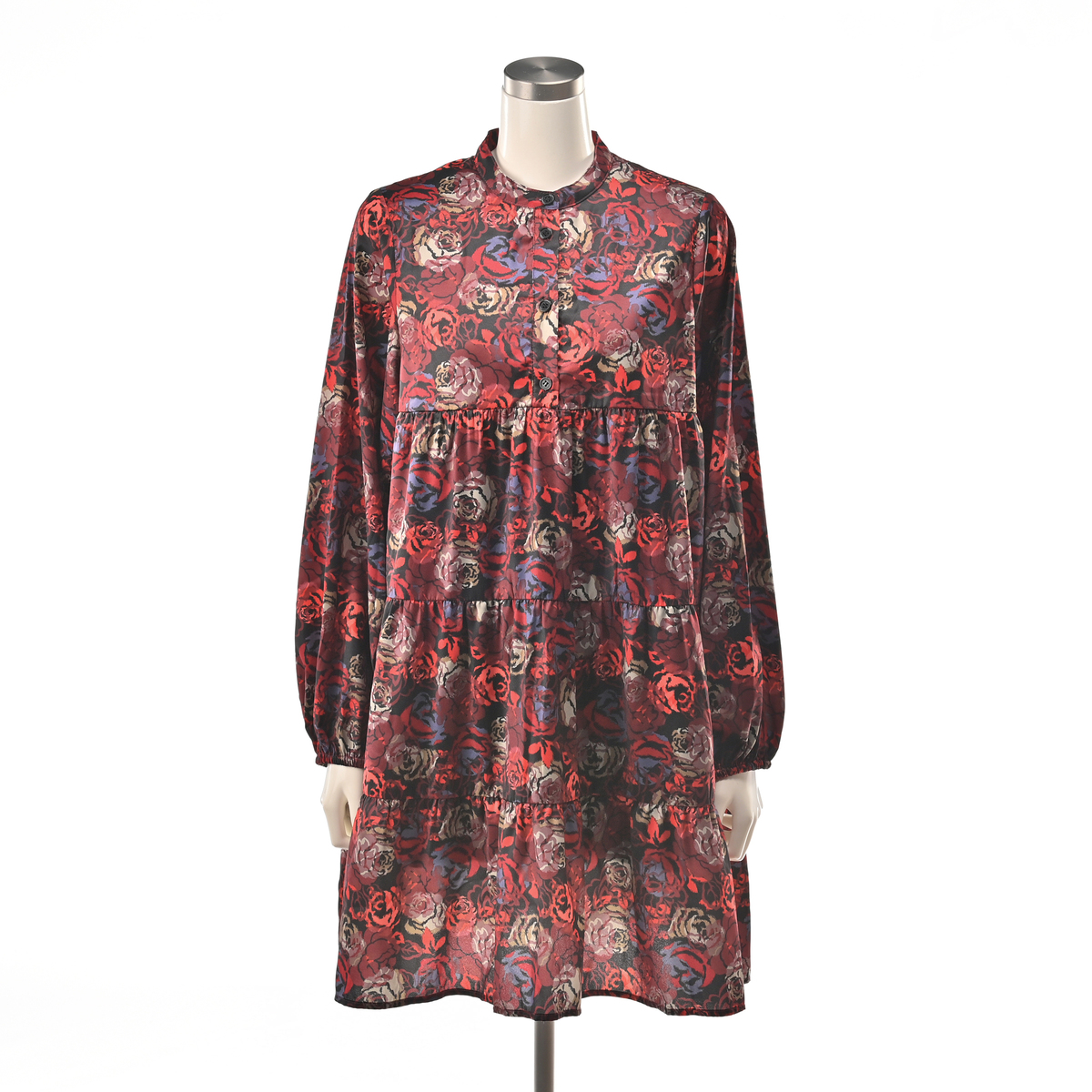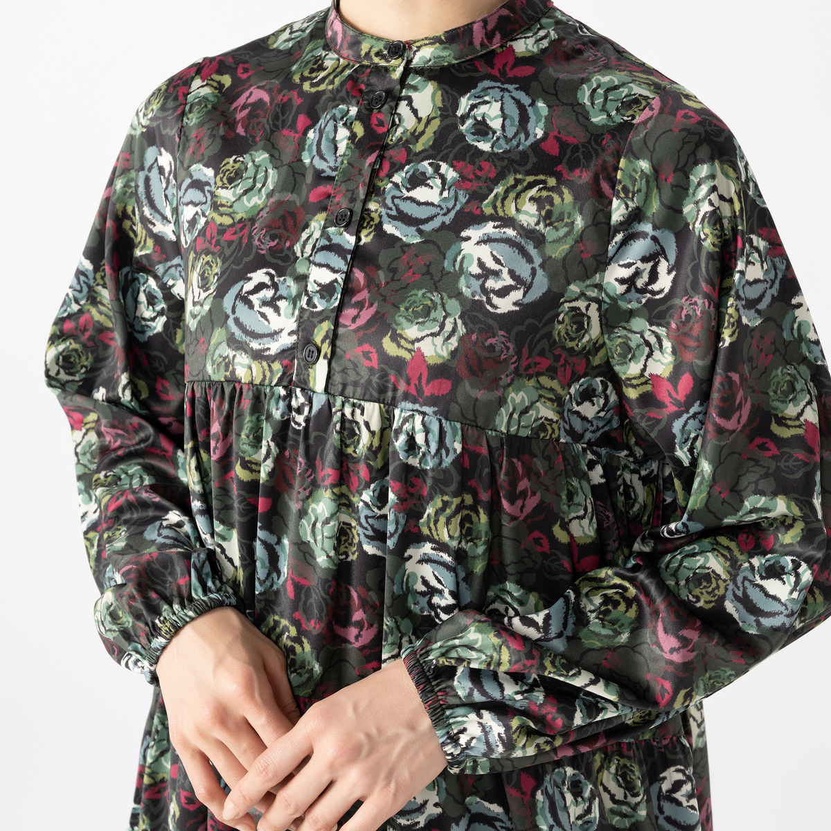 アンティークフラワー柄が印象的なティアードワンピースです。クリスマスローズからイメージを膨らませてモダンアート風に。広がりすぎない3段切替のティアードで、大人のきれいめな着こなしを叶えます