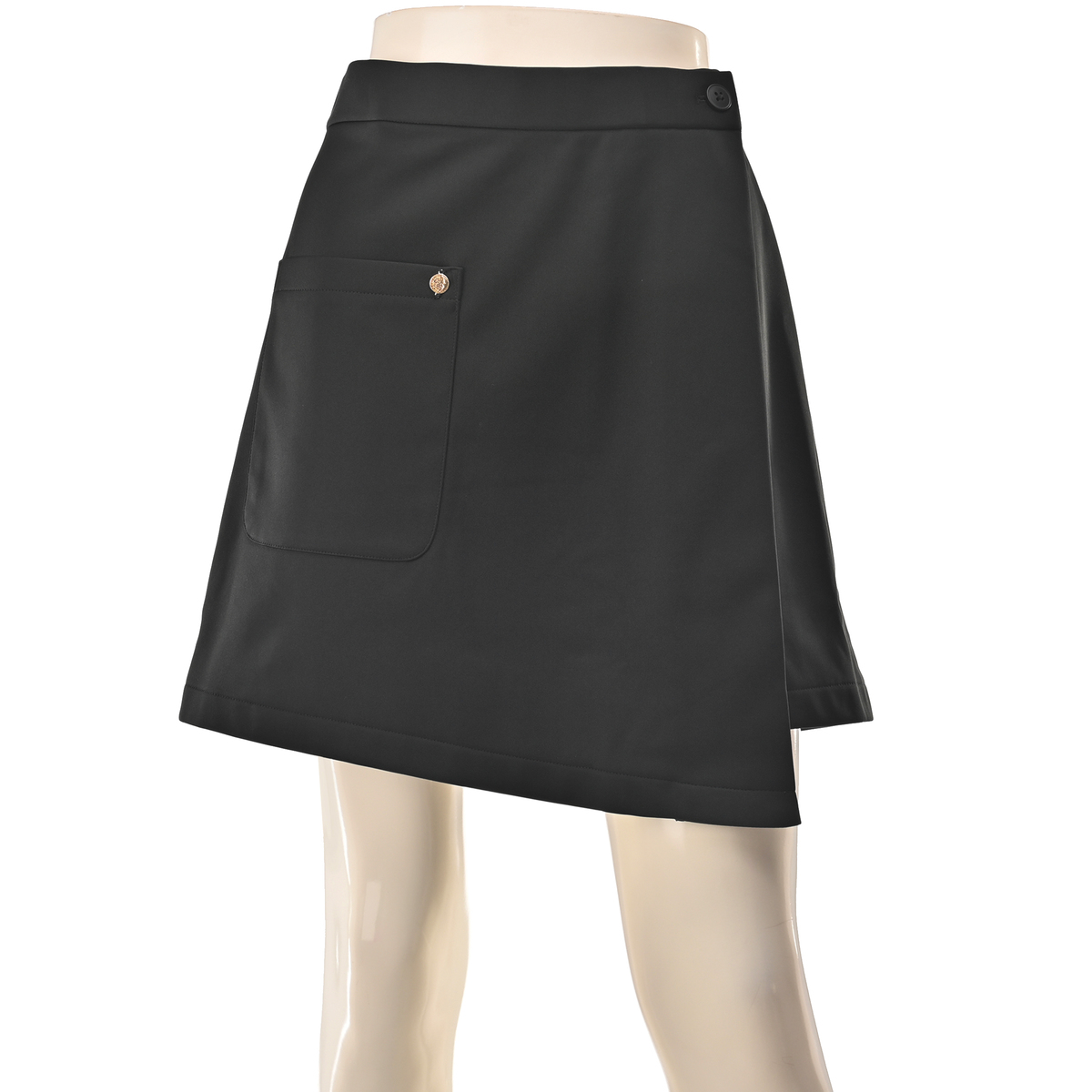 ウエストボタンと内ボタンでサイズ調整できるデザイン。前ボタンは1つで足さばきがよく、動きやすさを重視しました。上前端を少し長くしたアシンメトリーな仕立てで、甘すぎないシンプルなシルエットに仕上げています
