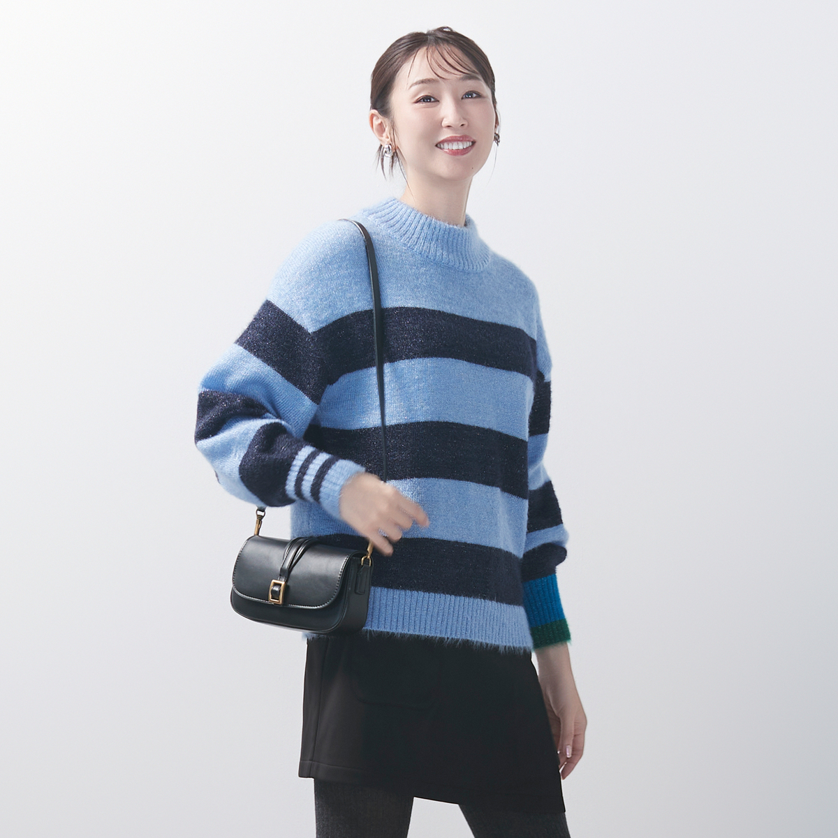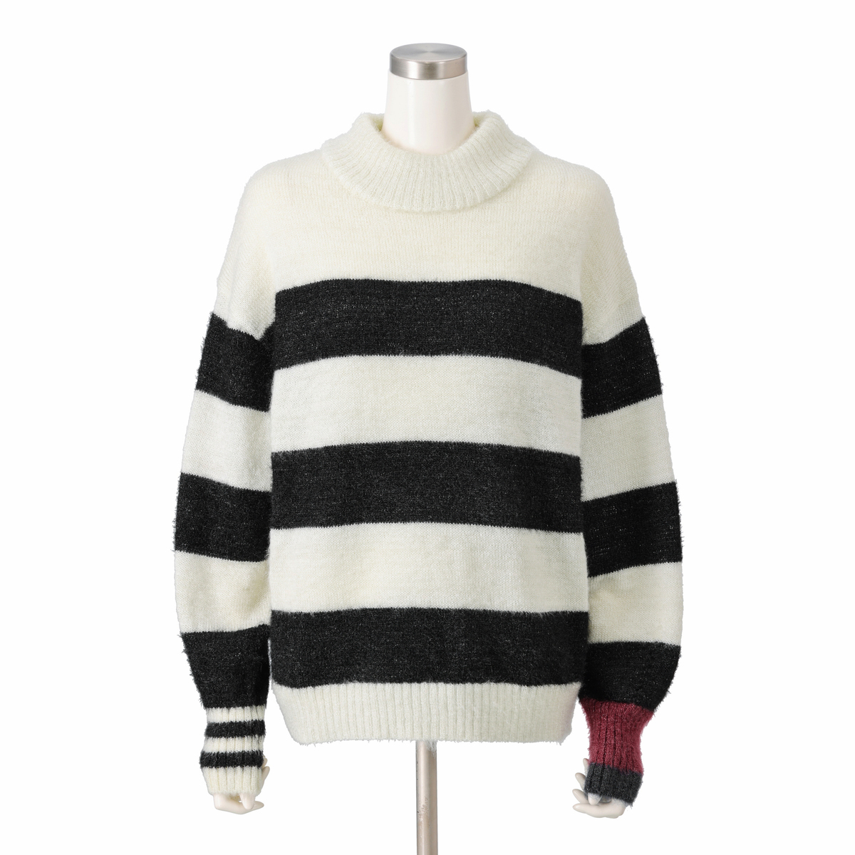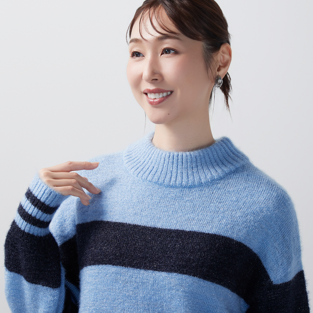 ラメ糸と太めのシャギー調糸を組合せたニット。ふんわりとした柔らかさがあり、ボーダー位置にこだわったデザインが華やかさを引き立てます。カジュアルな天竺編みにアート感を添え、コーディネートの主役になる一枚です