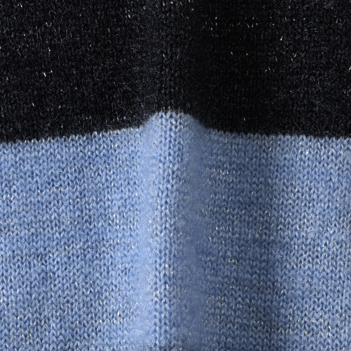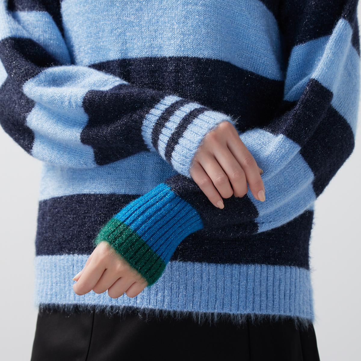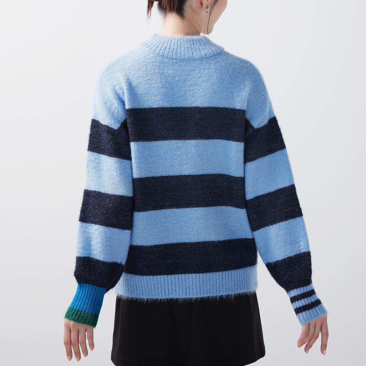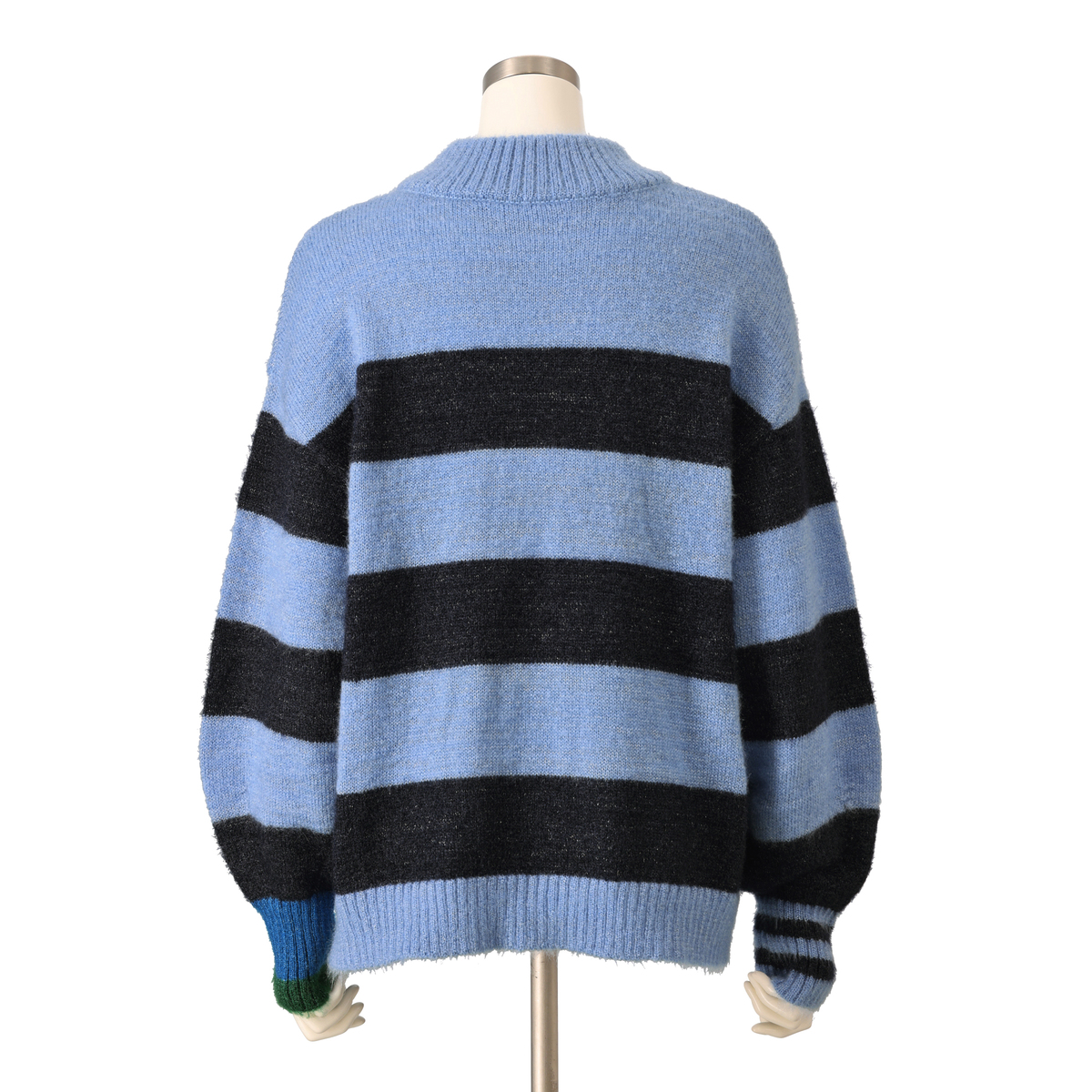 ラメ糸と太めのシャギー調糸を組合せたニット。ふんわりとした柔らかさがあり、ボーダー位置にこだわったデザインが華やかさを引き立てます。カジュアルな天竺編みにアート感を添え、コーディネートの主役になる一枚です