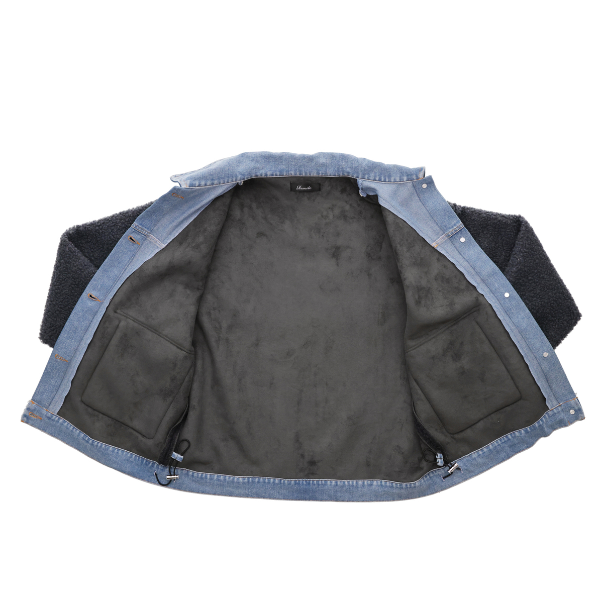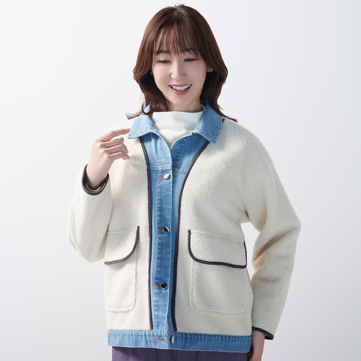 前中心、襟、裾切り替え部分にデニムを使用。ボアの前端や裾、ポケット周りにはスエードテープを施し、アクセントをプラスしました