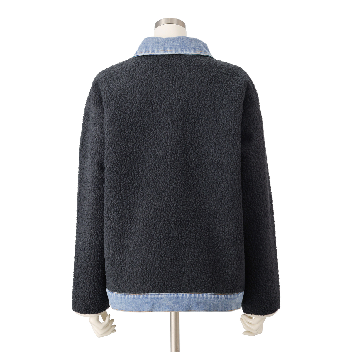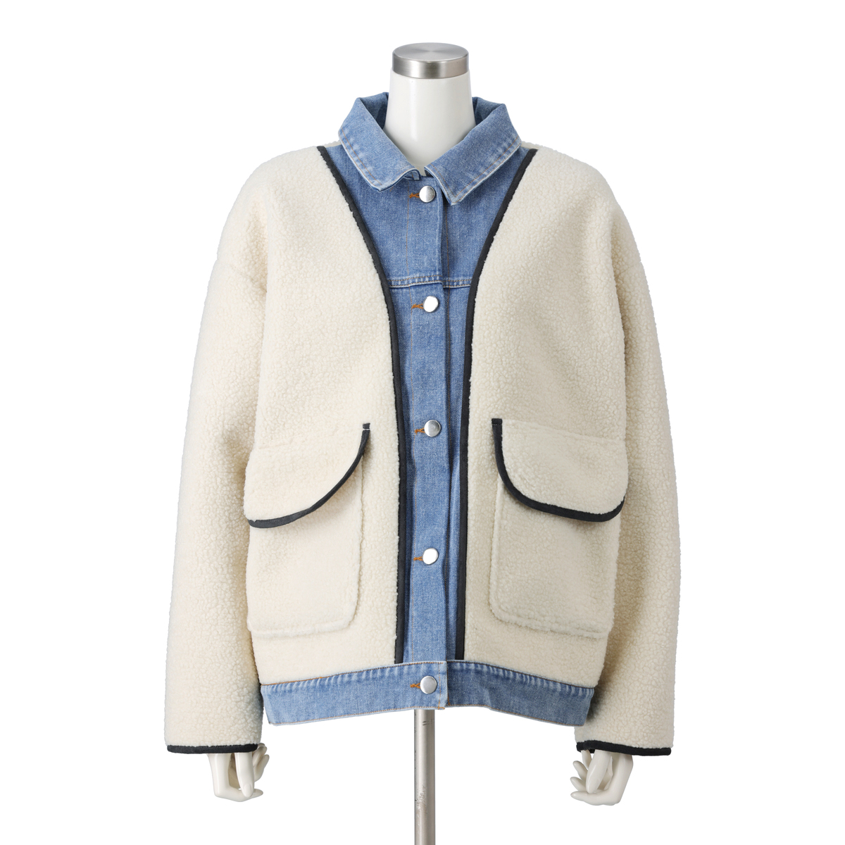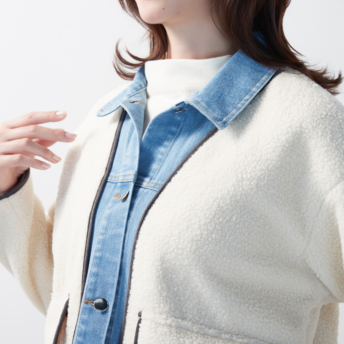 ボアとフェイクスエードのボンディング生地に、ミドルオンスのデニムをドッキングしたブルゾン。異素材のコントラストがコーデのポイントになってくれます