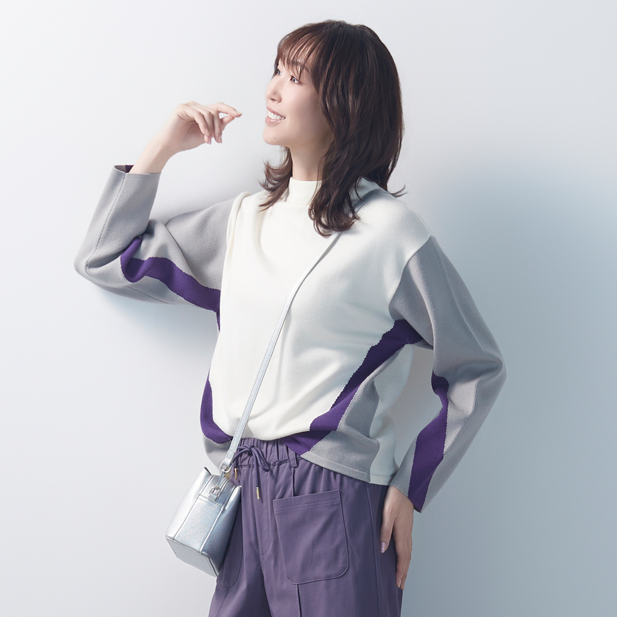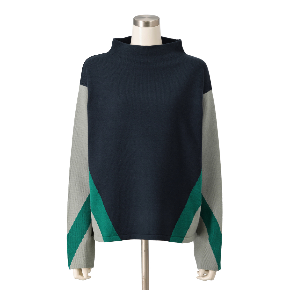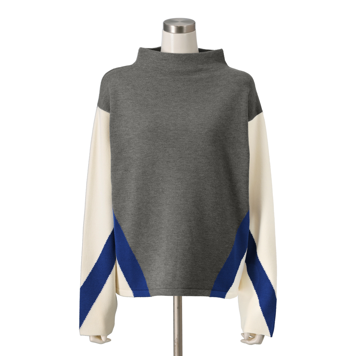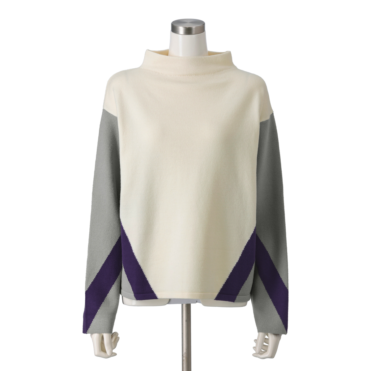ボトルネックタイプのニットプルオーバー。斜めに入った配色ラインが、視覚的に細見せ効果を演出。裾に向かって流れるデザインが、さりげなくコーディネートに新鮮さをプラスします