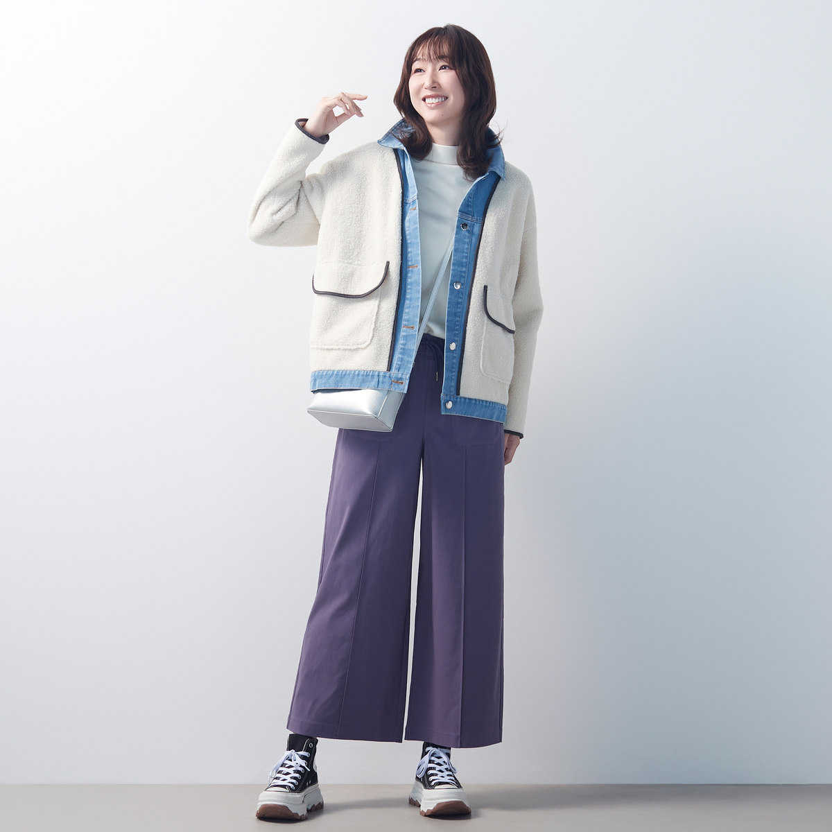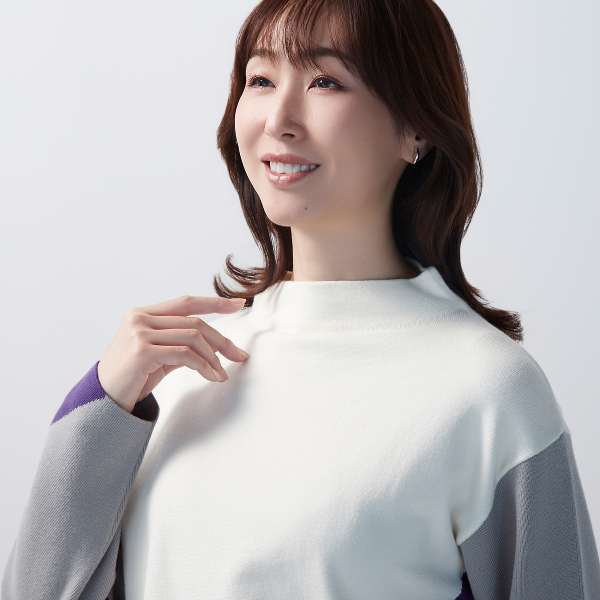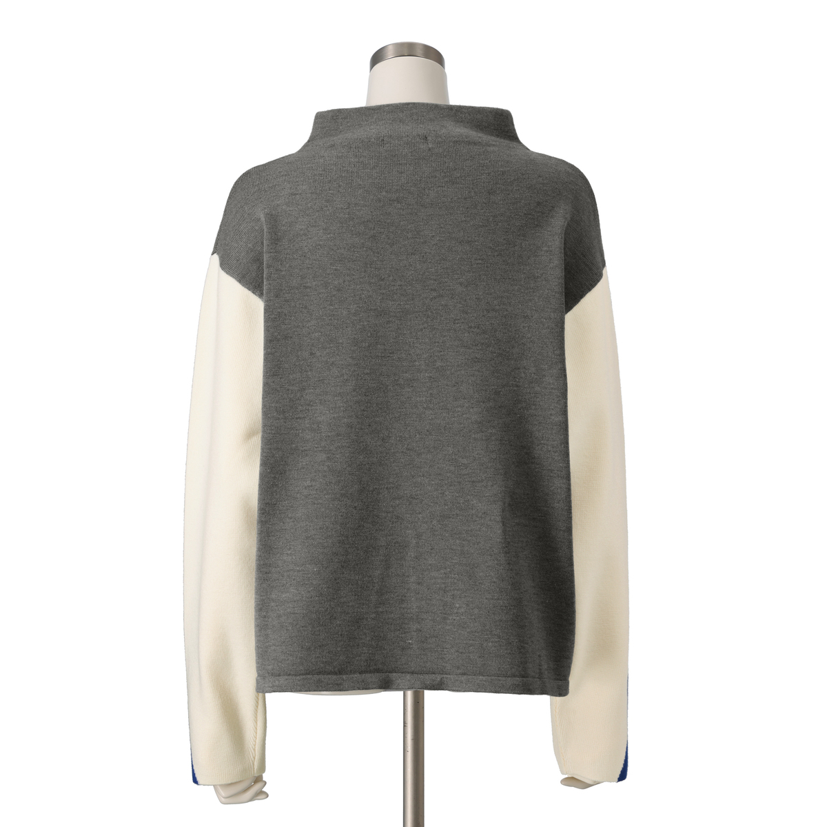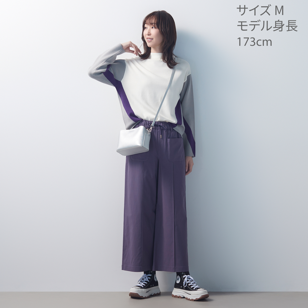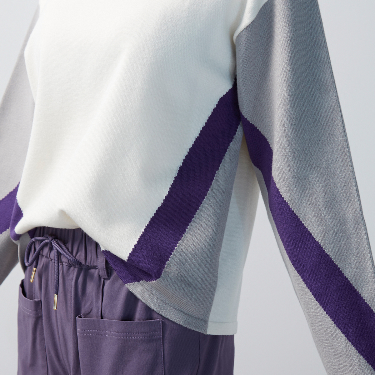 ボトルネックタイプのニットプルオーバー。斜めに入った配色ラインが、視覚的に細見せ効果を演出。裾に向かって流れるデザインが、さりげなくコーディネートに新鮮さをプラスします