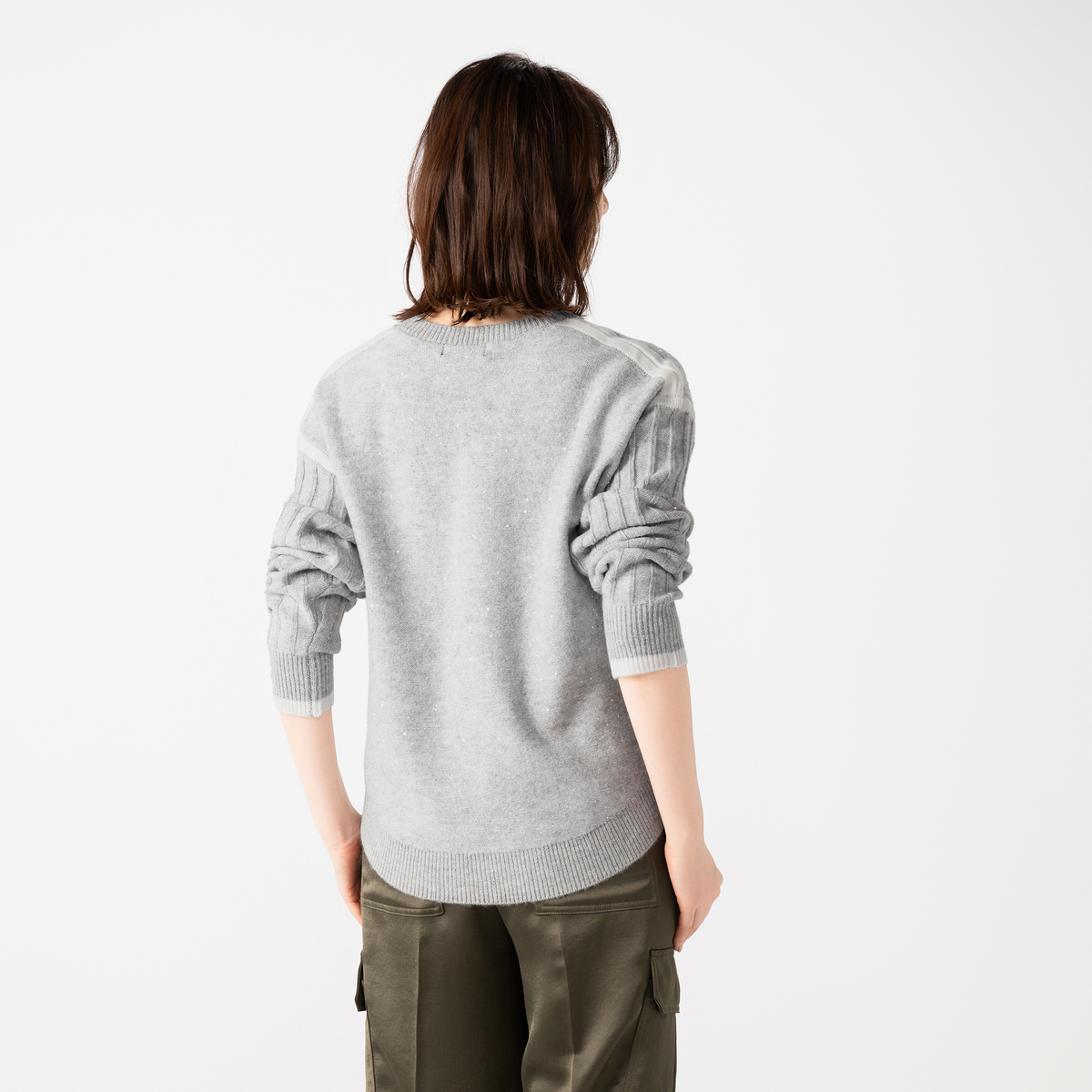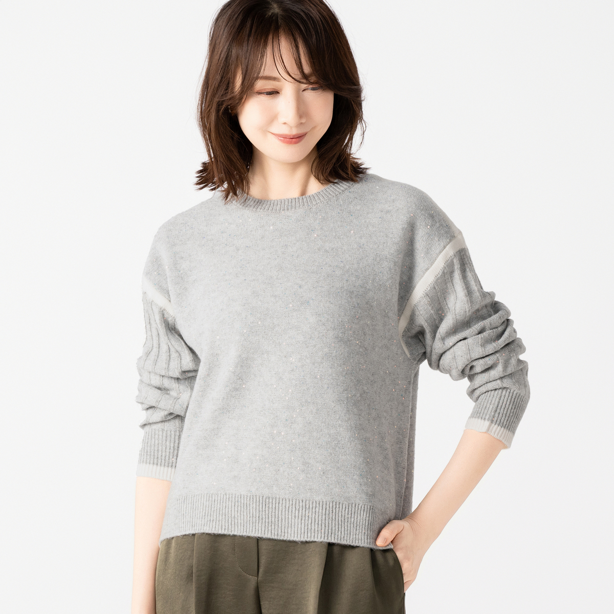 袖山やアームホール、袖口に配色を効かせ、シンプルながら印象的なアクセントを加えました。身頃と袖の編地の変化も楽しんでいただけます