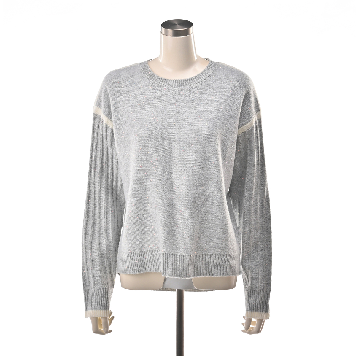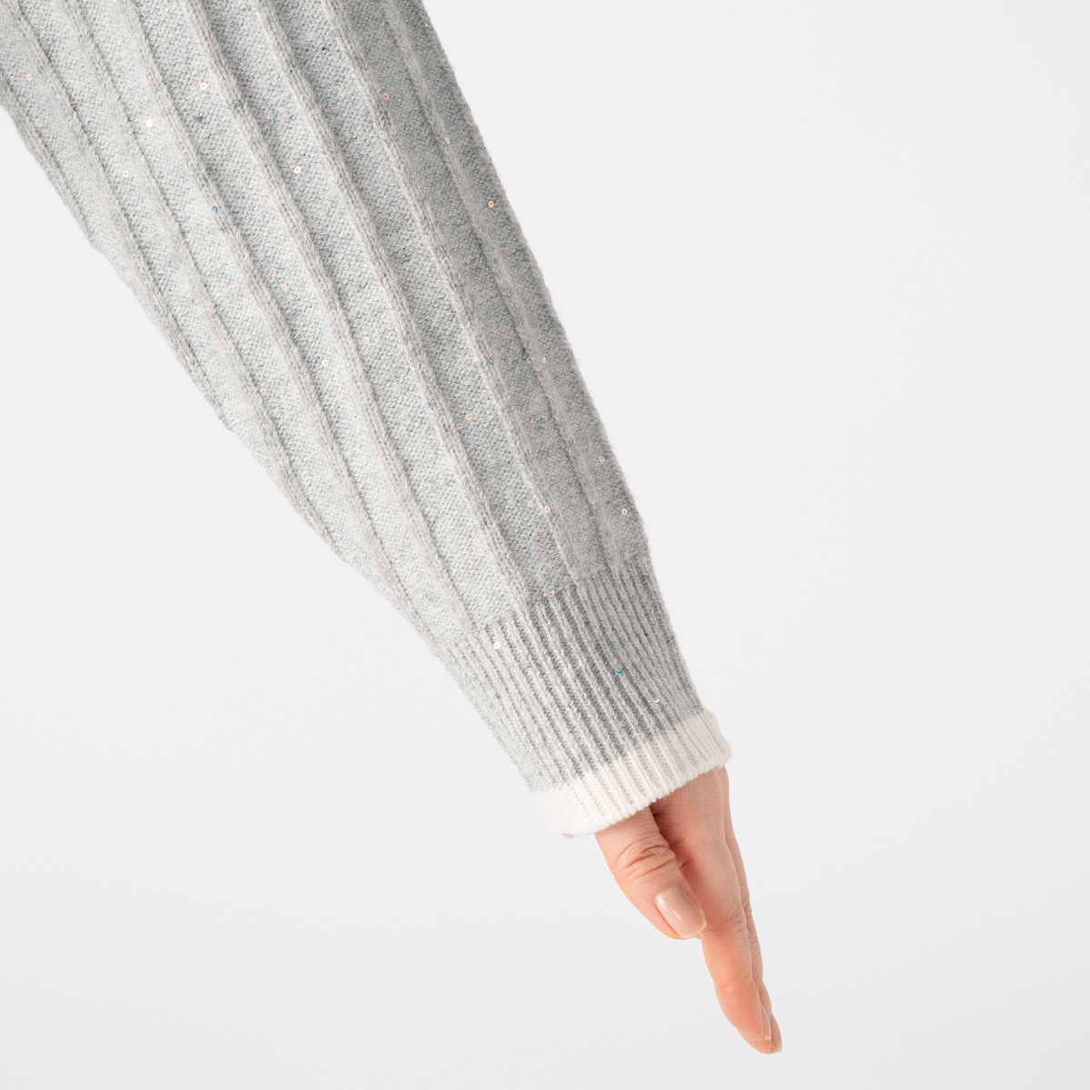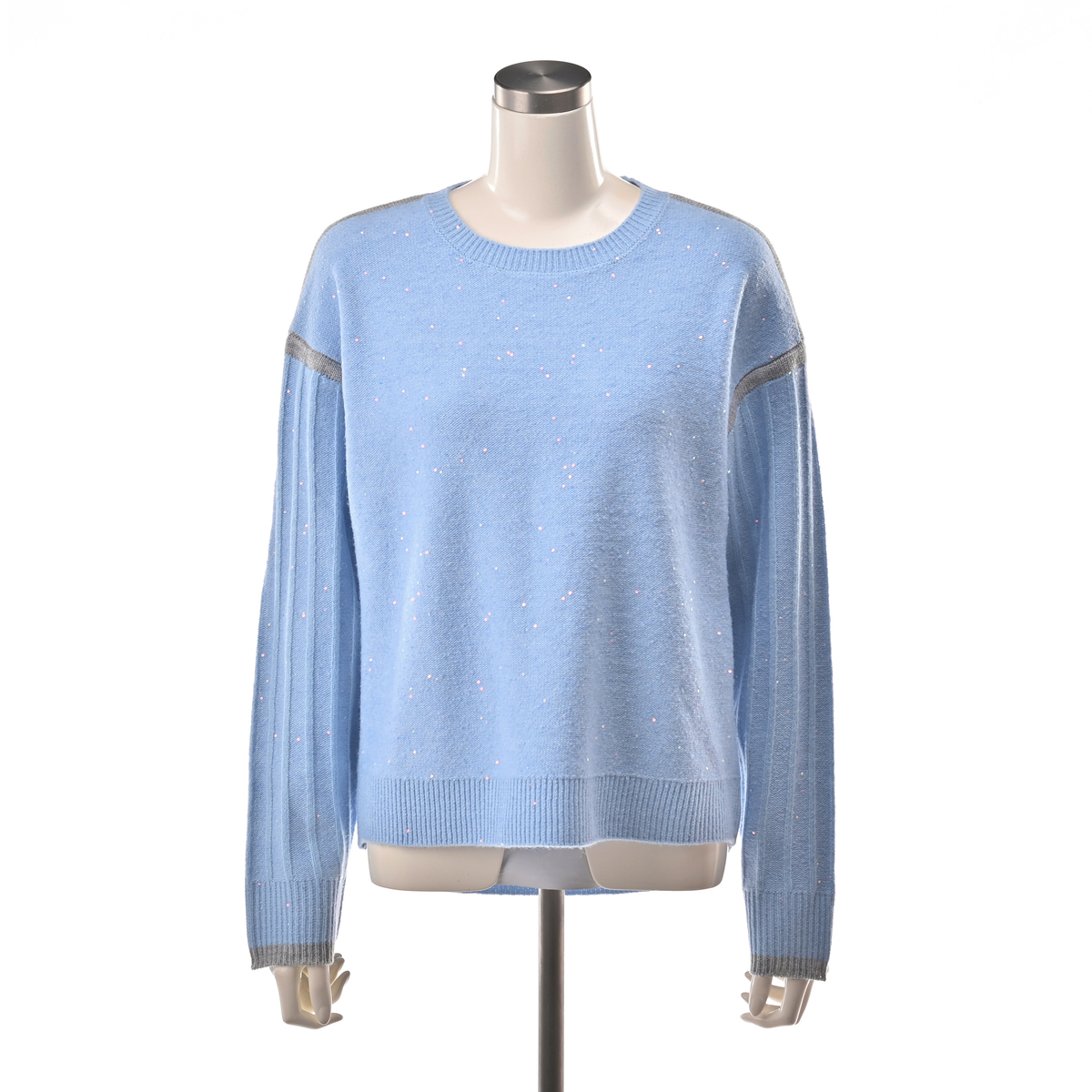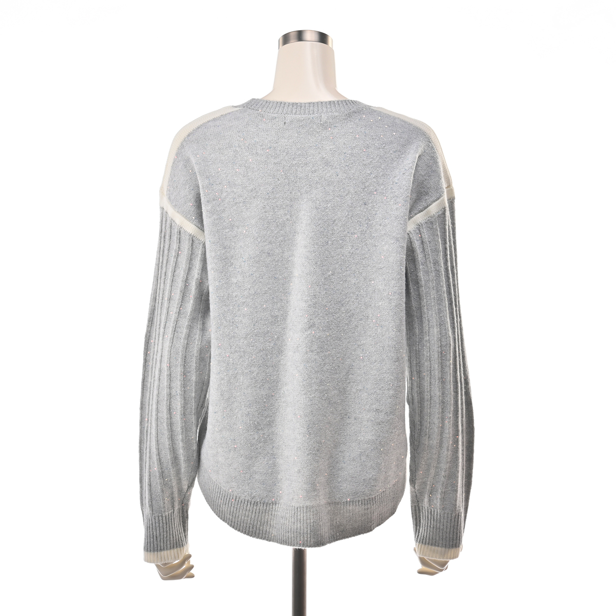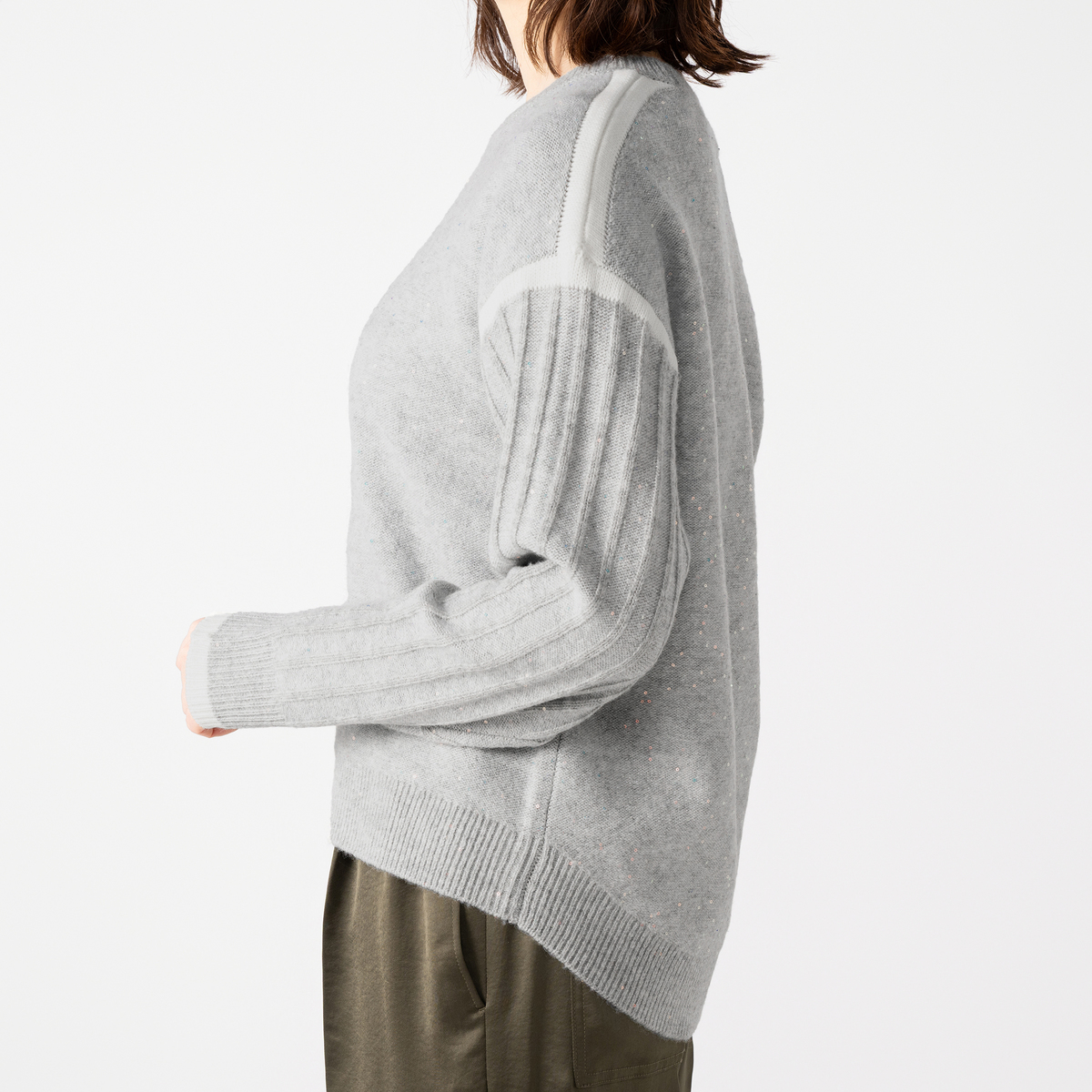 毛混のスパンコール混糸を使ったプルオーバーです。身頃とリブを裏目にして編み上げ、スパンコールの光沢感を引き立てました。カジュアルからオケージョンまで幅広く活躍します