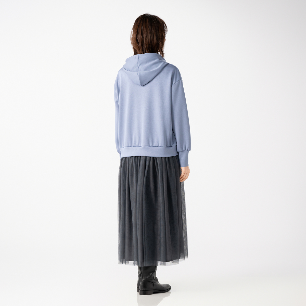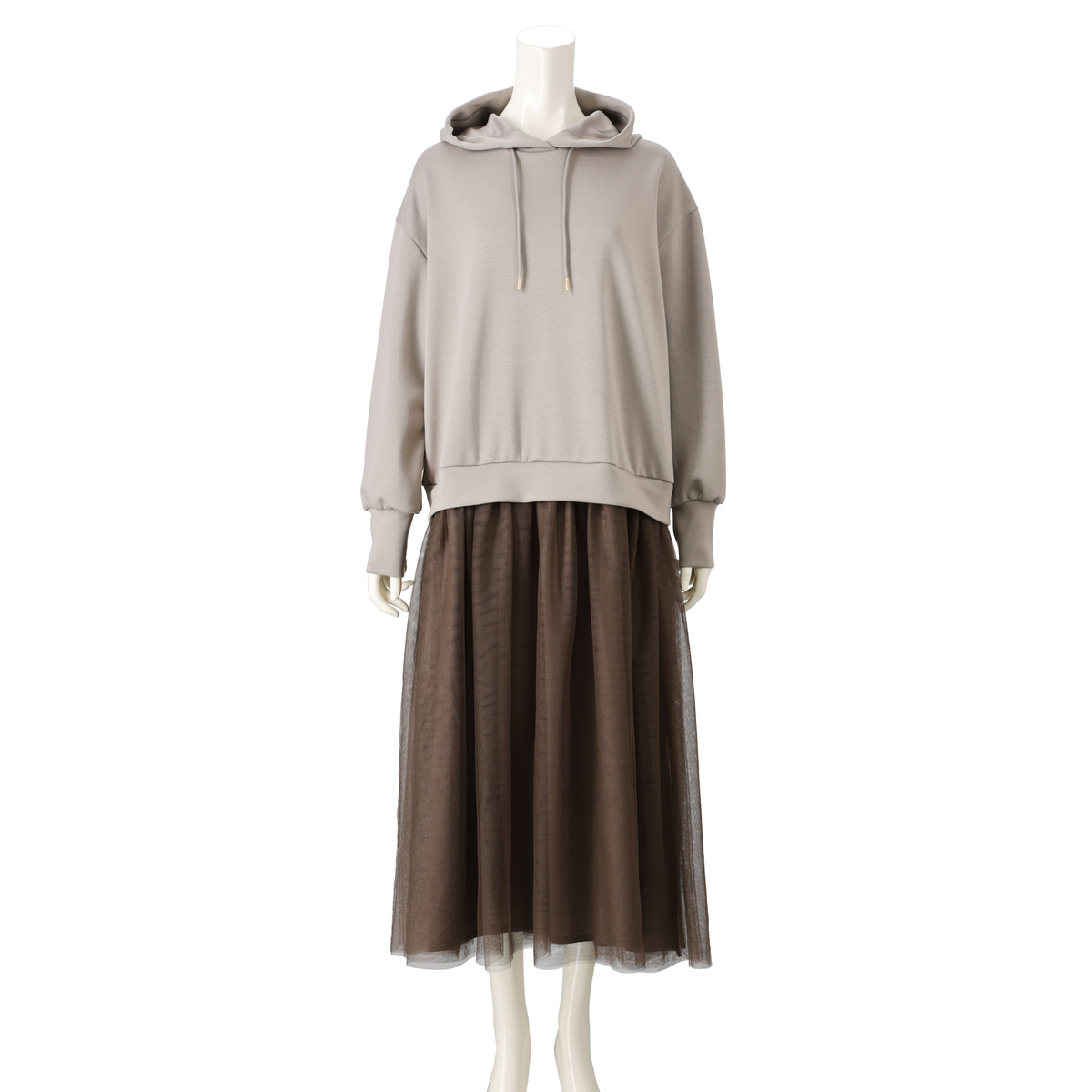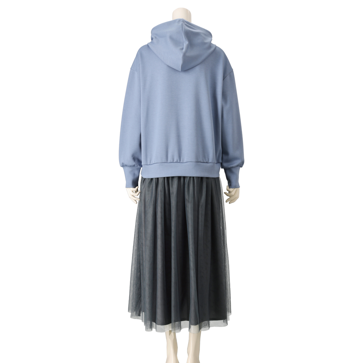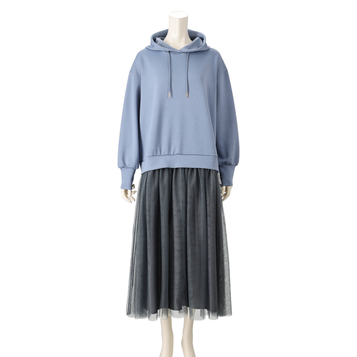 フーディーとスカートが一体になったワンピースです。ふんわり広がるチュールスカートがフェミニンな印象を与え、動くたびに軽快な雰囲気を演出します