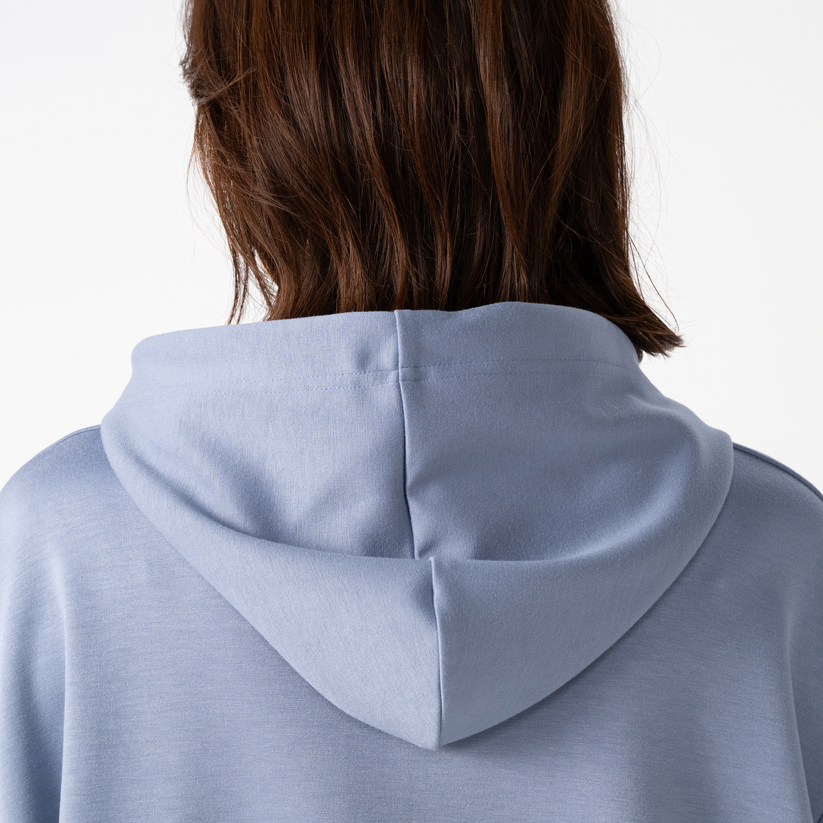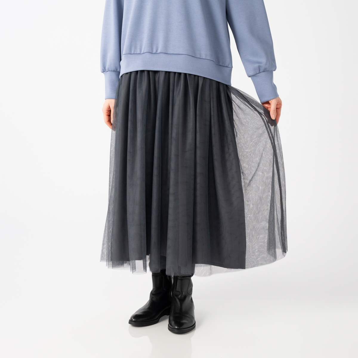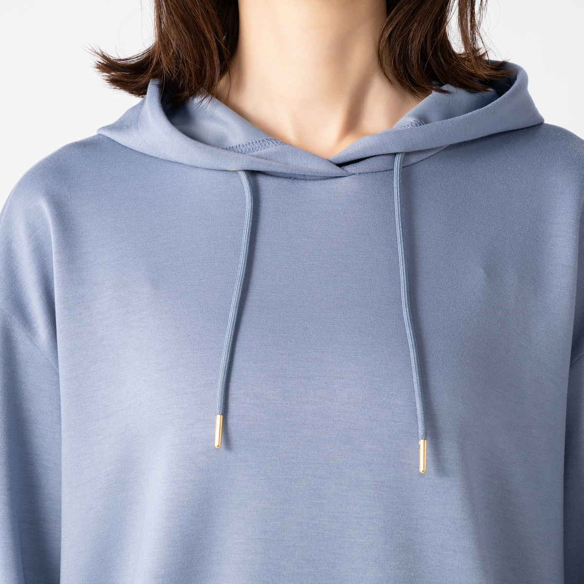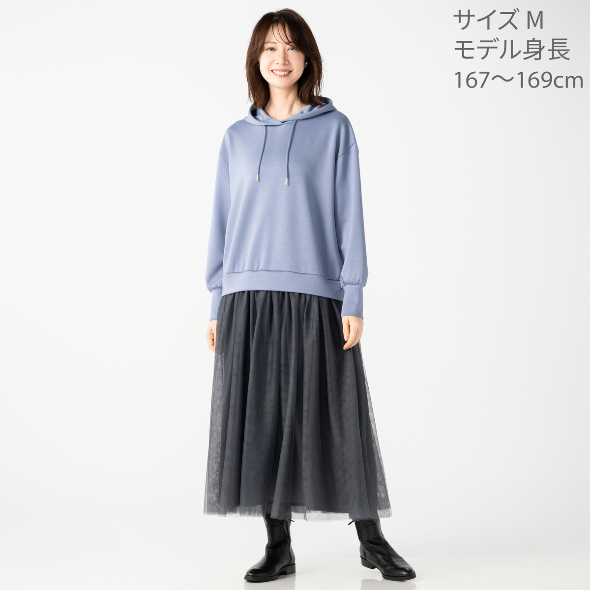 フーディーとスカートが一体になったワンピースです。ふんわり広がるチュールスカートがフェミニンな印象を与え、動くたびに軽快な雰囲気を演出します