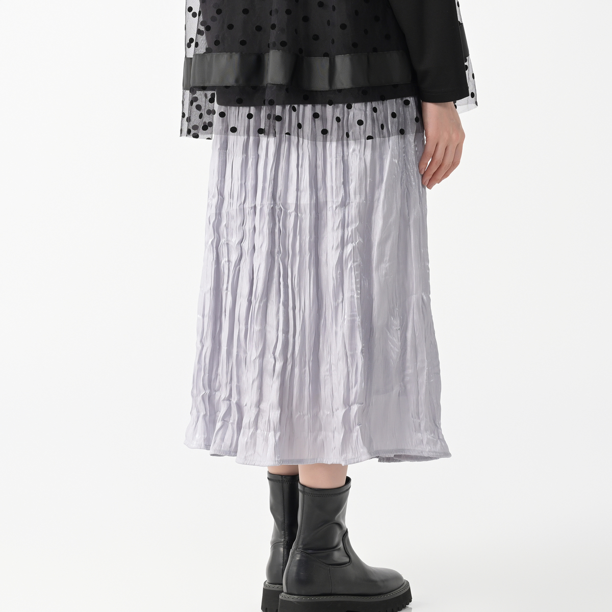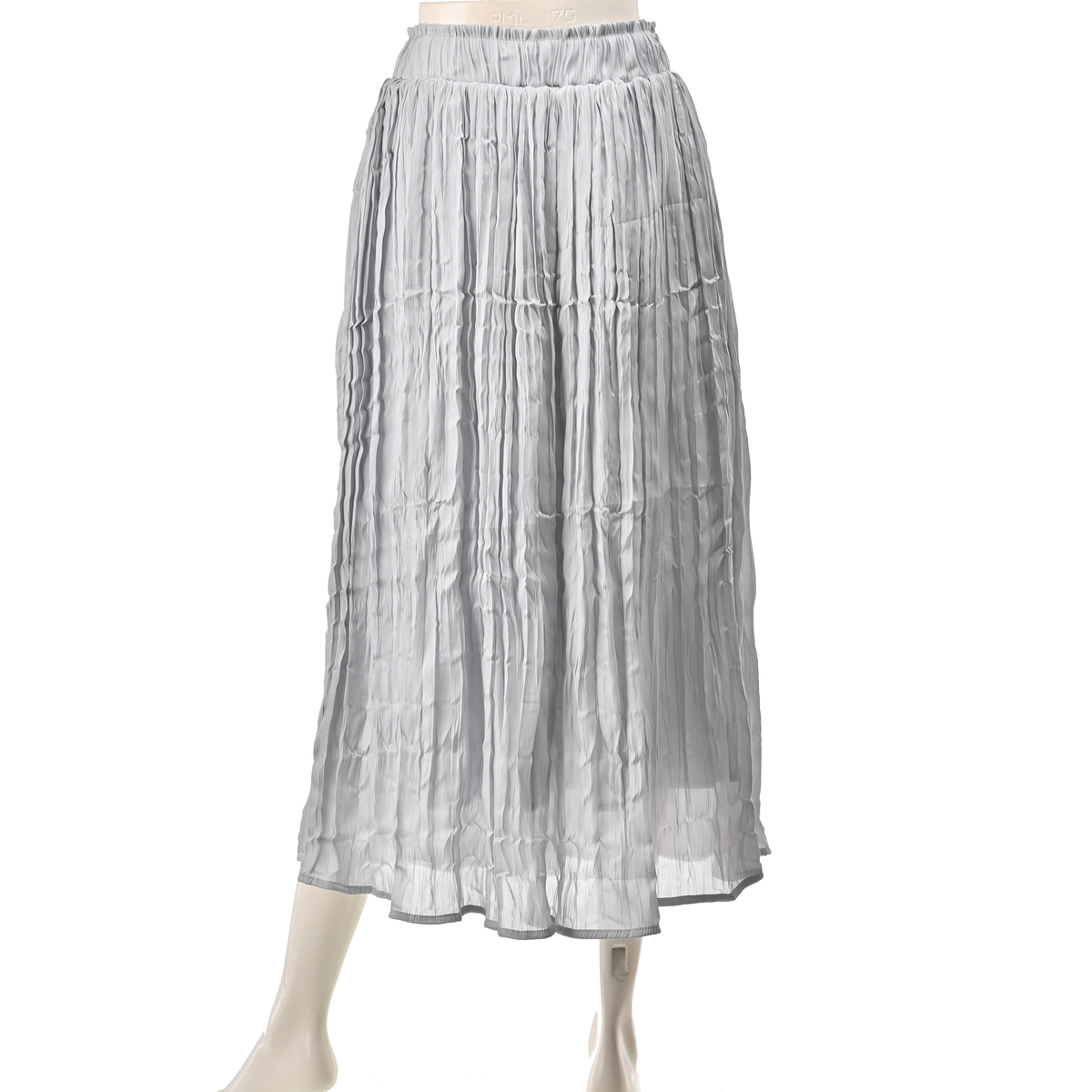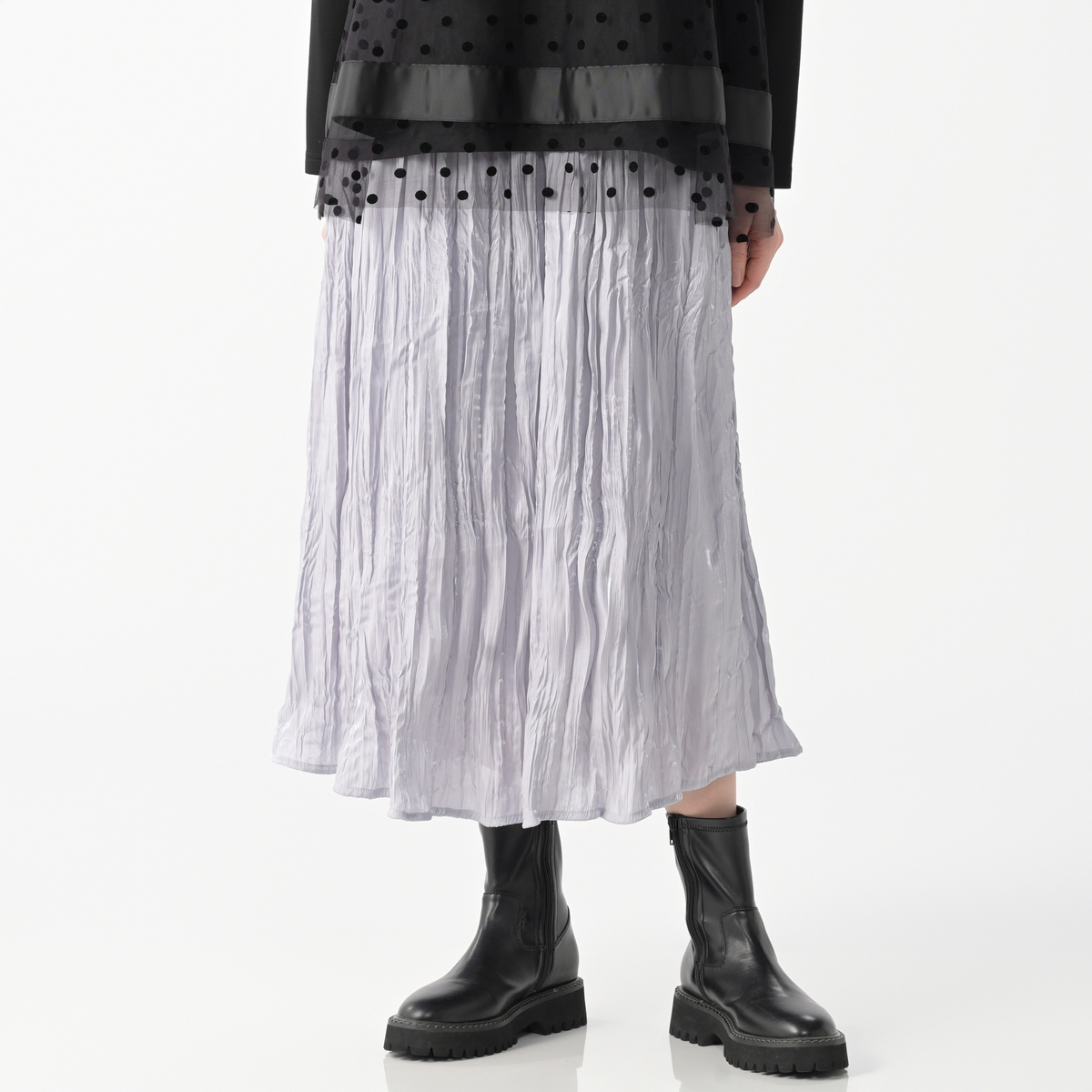ランダムなプリーツがこなれ感を演出するスカート。光沢感のあるラメ糸を使用した布帛を使用。生地生産時にプリーツ加工を施しています