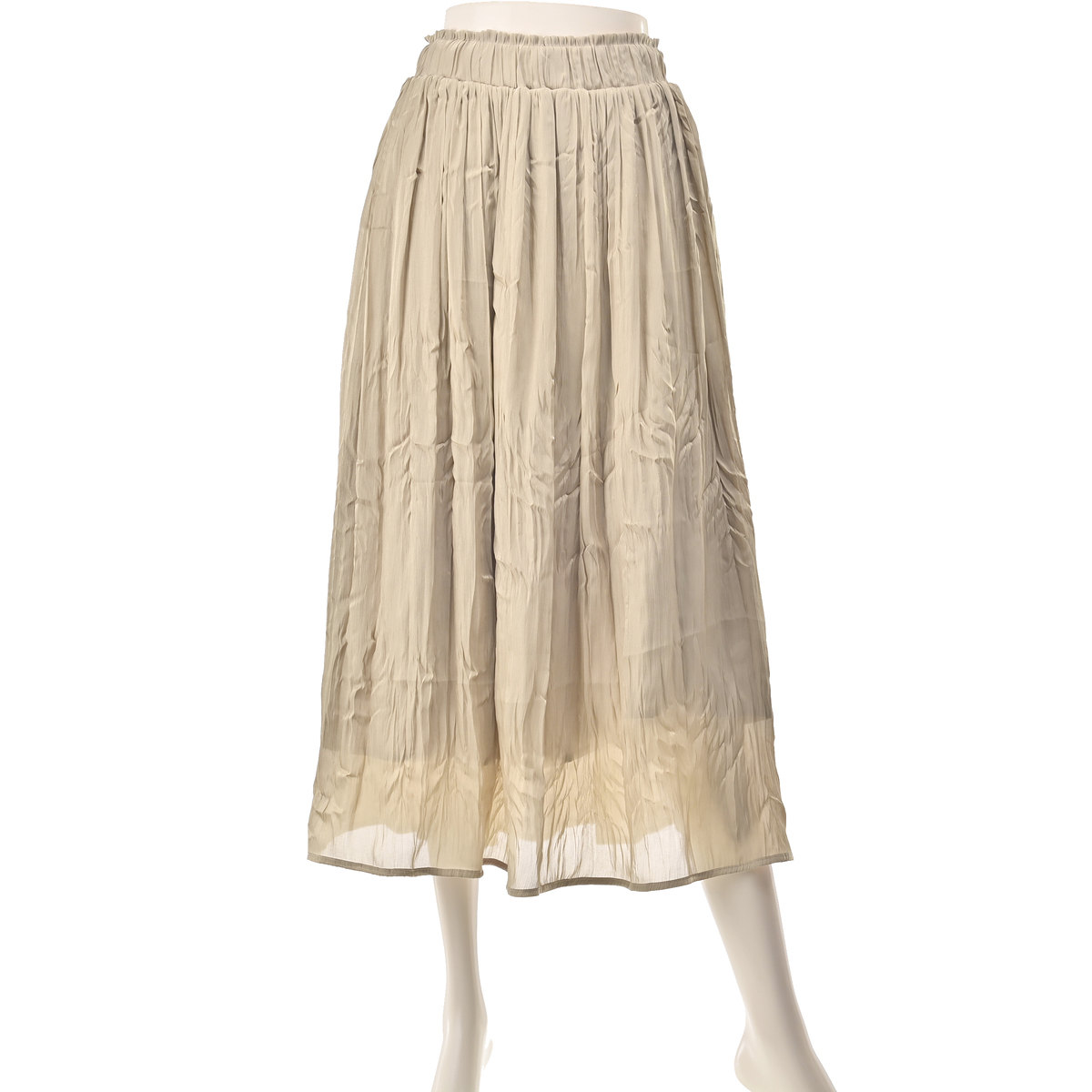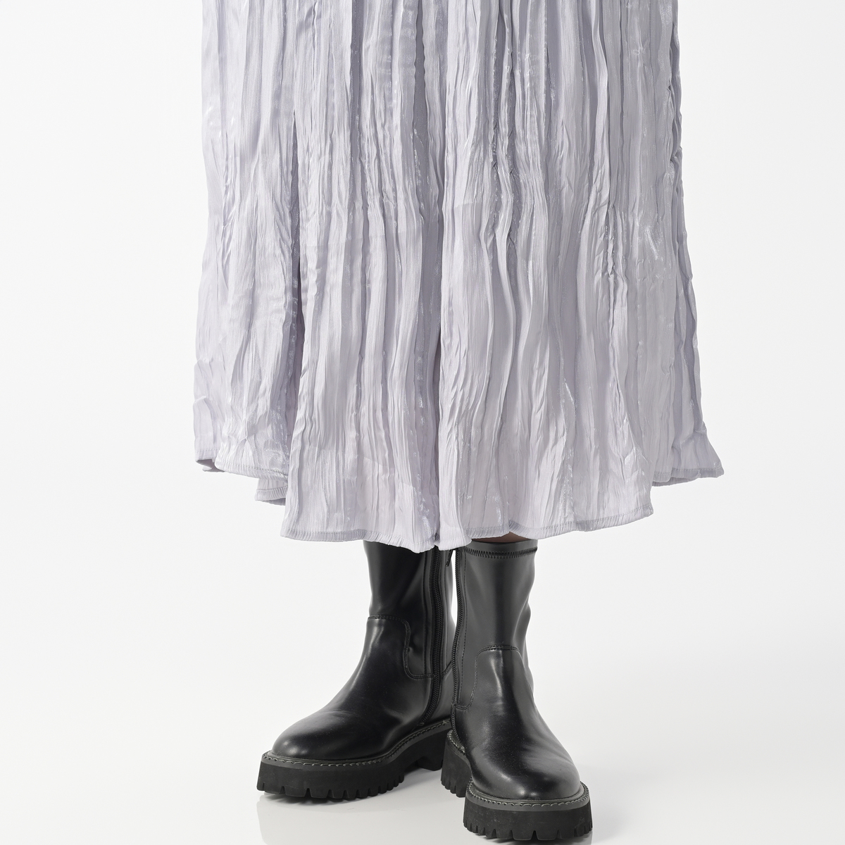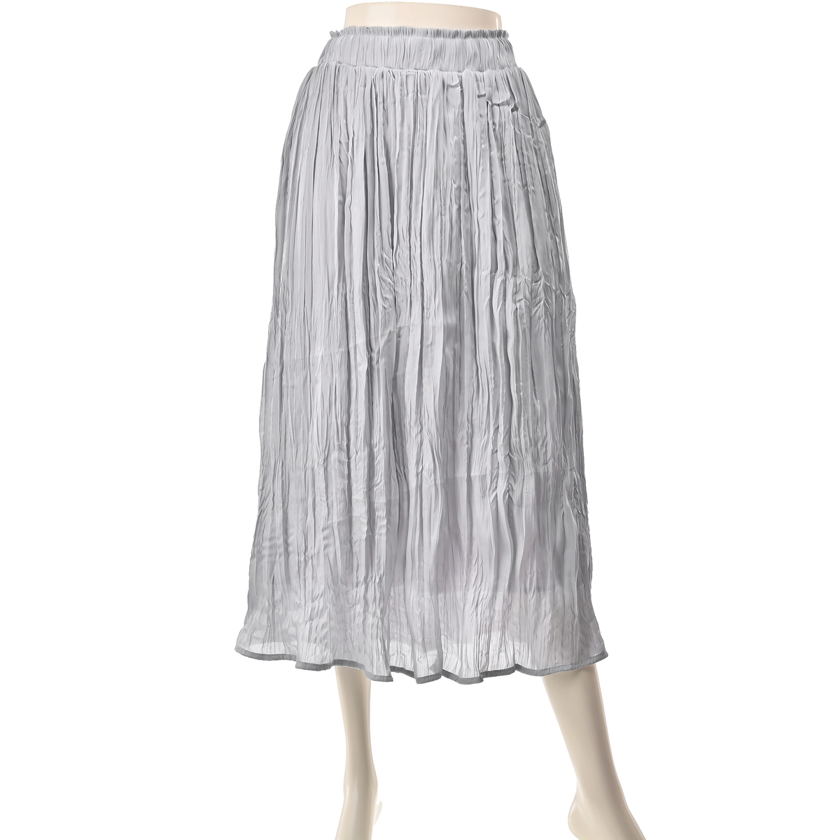 ランダムなプリーツがこなれ感を演出するスカート。光沢感のあるラメ糸を使用した布帛を使用。生地生産時にプリーツ加工を施しています