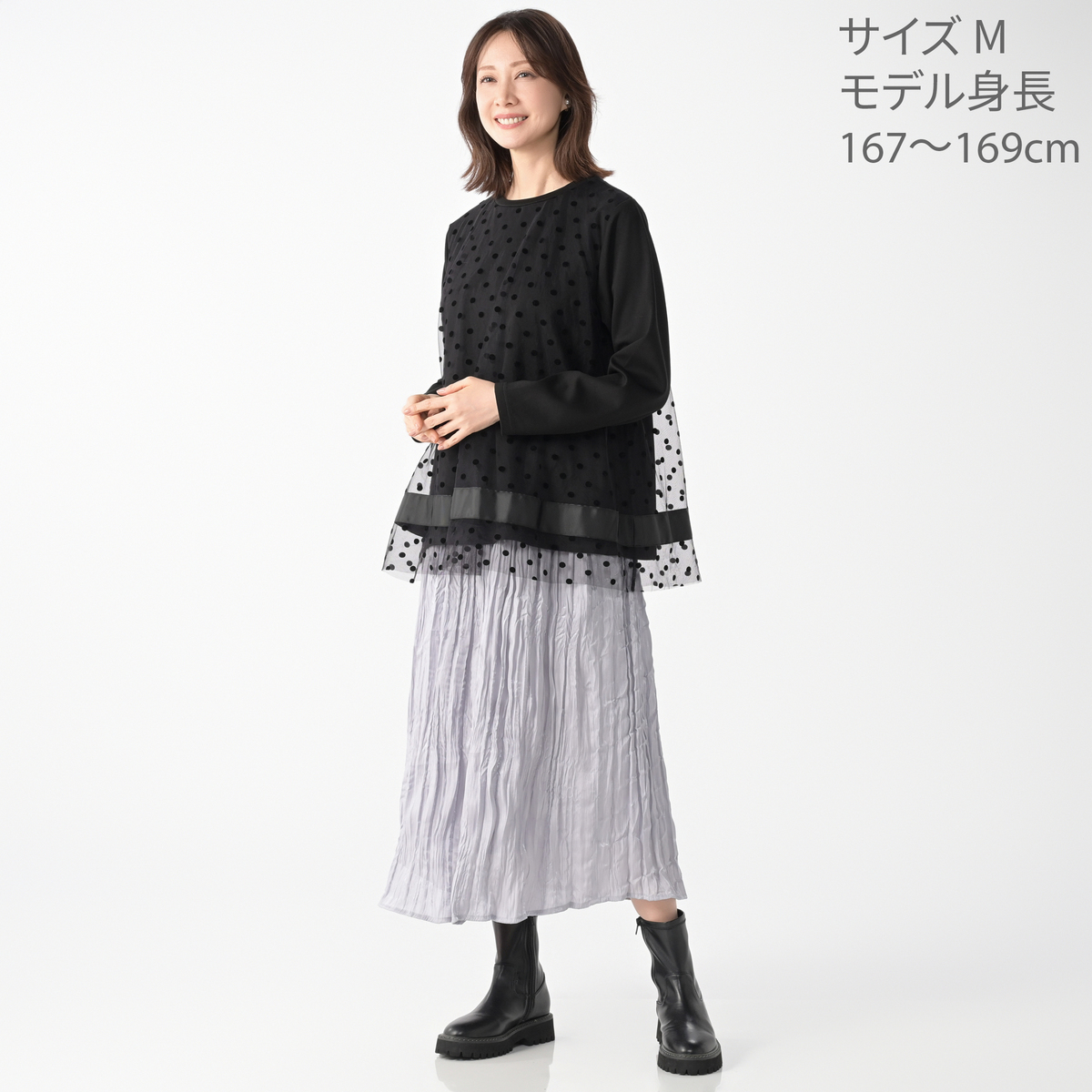 [商品寸法(ヌード)cm] サイズ ウエスト ヒップ 丈 S : 65(58〜64) (82〜90) 83 M : 70(64〜70) (87〜95) 83 L : 75(69〜77) (92〜100) 84 LL : 80(77〜85) (97〜105) 84 3L : 85(85〜93) (102〜110) 84 [ウエストゴム] 全体に有 [素材] 表地・裏地:ポリエステル100% [お手入れ] 手洗い可 [注意事項] ※商品寸法の誤差は多少発生します。ご了承下さい ※洗濯後はすぐに脱水し、形を整えて干して下さい。長時間水につけたままにしないで下さい ※洗濯・クリーニングの際、色落ちすることがありますので他の物と分けて洗って下さい ※濃色製品は着用中の摩擦により色移りすることがあります。また、雨や汗等で濡れた状態で着用すると色移りすることがあります。その際はお早めに洗濯をして下さい ※直射日光や蛍光灯の影響で変色することがありますのでご了承下さい ※デリケートな素材を使用していますので、爪やアクセサリーなどの引っ掛かりによりキズがつきやすくなっております。縫目や生地を強く引っ張らないよう注意して下さい ※無蛍光洗剤使用 ※アイロンの際は、あて布をご使用下さい ※洗濯機での洗濯は行わず、手洗いで軽く押し洗いして下さい ※この製品はプリーツ加工を施していますが、永久的なものではありません。着用やクリーニングによりプリーツが消失する恐れがあります ※すわりじわ、たたみじわなど、ヒダが甘くなった場合は、直ちに乾熱アイロンで押えるようにセットして下さい。ヒダを伸ばした状態での加熱乾燥はおさけ下さい 【中国製】