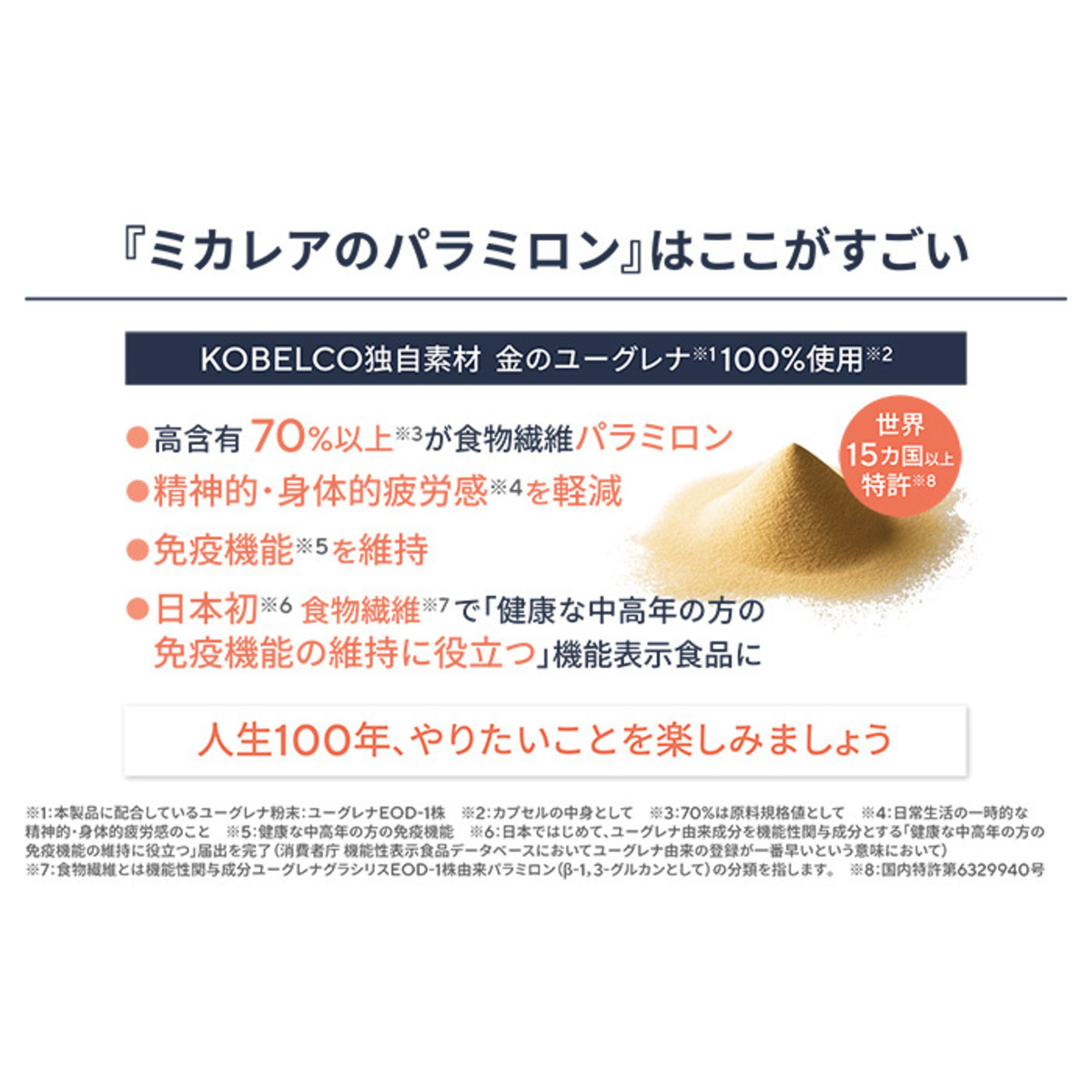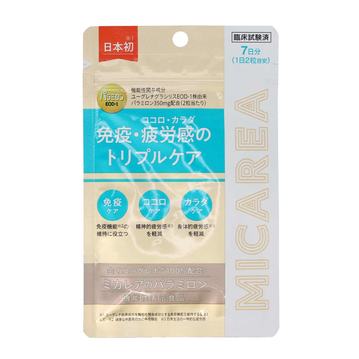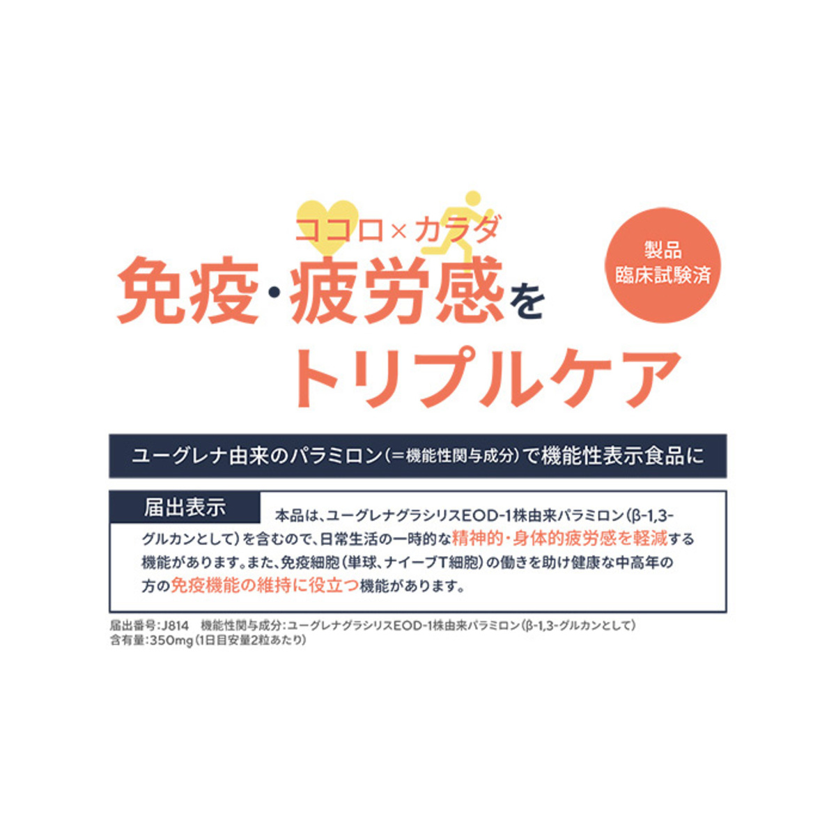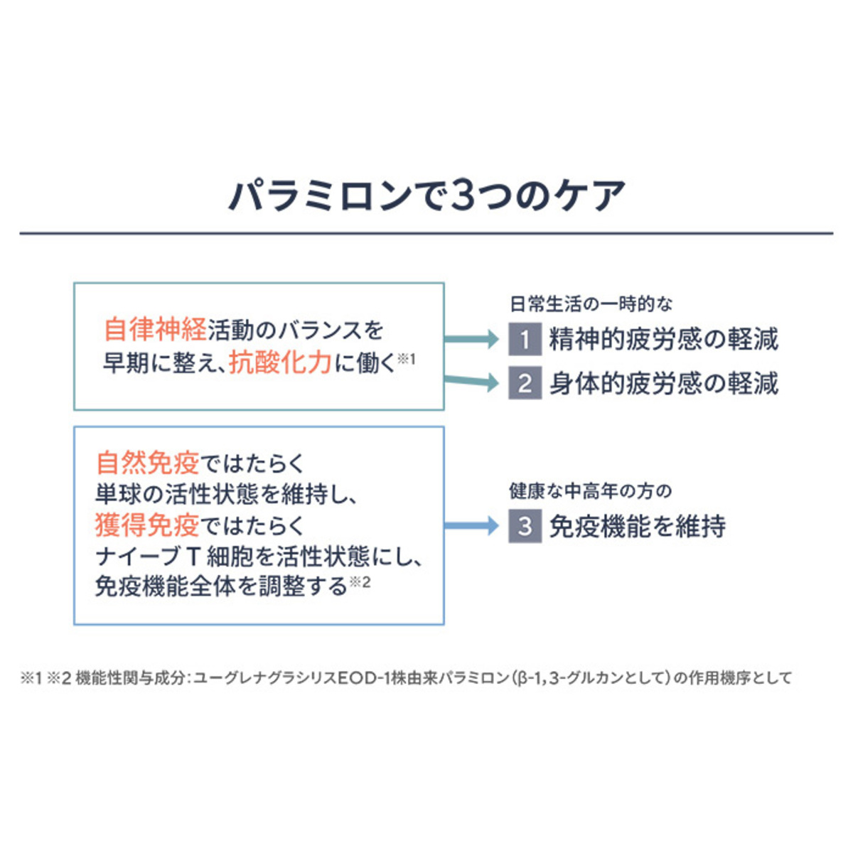日常生活の一時的な精神的・身体的疲労感を軽減する機能、健康な中高年の方の免疫機能の維持に役立つ機能性表示食品。本品は、ユーグレナグラシリスEOD-1株由来パラミロン(β-1、3-グルカンとして)を含むので、日常生活の一時的な精神的・身体的疲労感を軽減する機能があります。また、免疫細胞(単球、ナイーブT細胞)の働きを助け健康な中高年の方の免疫機能の維持に役立つ機能があります