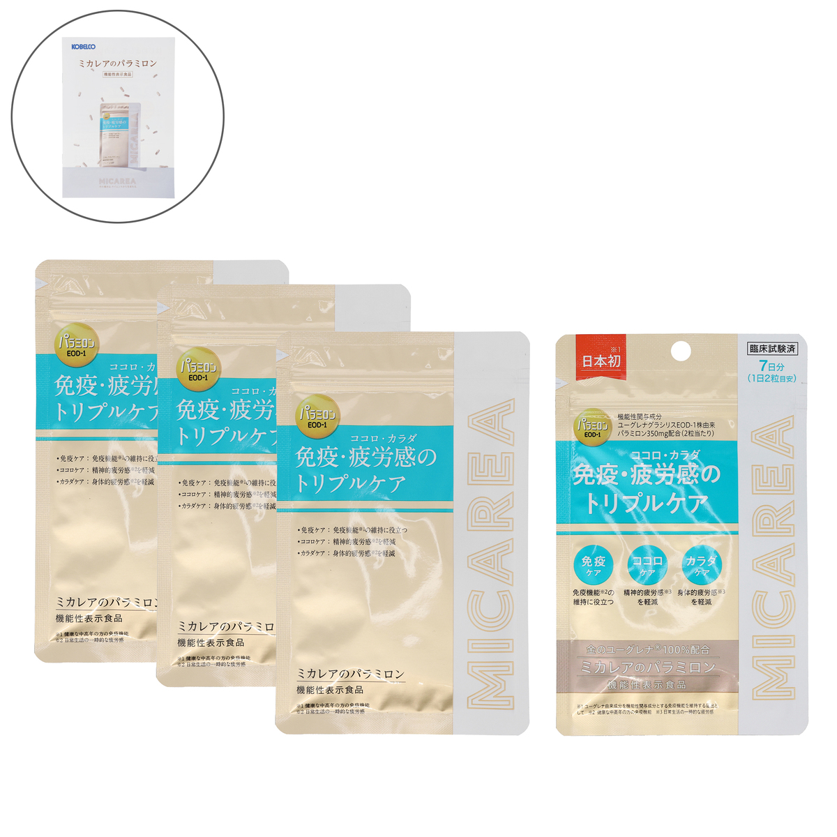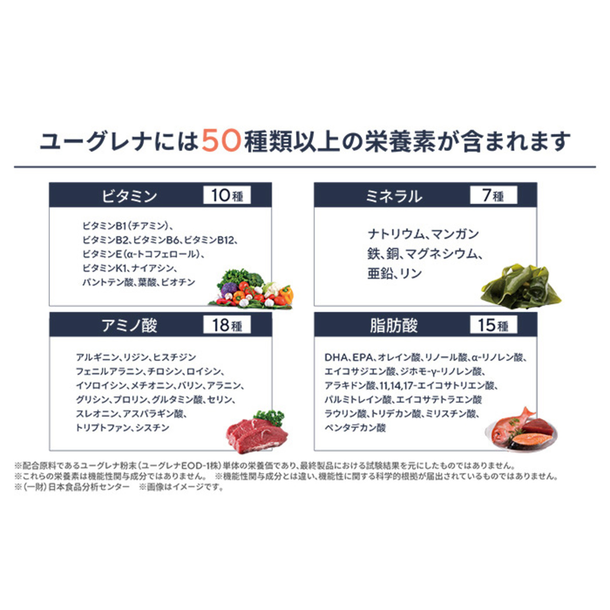 [アレルギー物質特定原材料8品目] なし [内容量] ・60粒×3袋・14粒×1袋 [目安量] 1日2粒 [届出番号] J814 [届出表示] 本品は、ユーグレナグラシリスEODー1株由来パラミロン(βー1.3ーグルカンとして)を含むので、日常生活の一時的な精神的・身体的疲労感を軽減する機能があります。また、免疫細胞(単球、ナイーブT細胞)の働きを助け健康な中高年の方の免疫機能の維持に役立つ機能があります [保存方法] 直射日光・高温多湿を避けて涼しいところに保存してください。乳幼児・小児の手の届かないところに保管してください [栄養成分表示] 2粒(602mg)当たり エネルギー 2.41kcal たんぱく質 0.03〜0.08g 脂質 0〜0.05g 炭水化物 0.49g 食塩相当量 0〜0.001g 機能性関与成分 ユーグレナグラシリスEOD-1株由来パラミロン(β-1.3-グルカンとして):350mg [お召し上がり方] 一日摂取目安量:2粒 摂取方法:水またはぬるま湯とともにお召し上がりください [注意事項] ※1日の摂取目安量を守ってください ※乳幼児・小児の手の届かないところに保管してください ※本品は多量に摂取しても、より健康が増進するものではありません ※本品は、事業者の責任において特定の保健の目的が期待できる旨を表示するものとして、消費者庁長官に届出されたものです。ただし、特定保健用食品と異なり、消費者庁長官よる個別審査を受けたものではありません ※本品は、疾病の診断、治療、予防を目的としたものではありません ※本品は、疾病に罹患している者、未成年者、妊産婦(妊娠を計画している者を含む)及び授乳婦を対象に開発された食品ではありません ※疾病に罹患している場合は医師に、医薬品を服用している場合は医師、薬剤師に相談してください ※体調に異変を感じた際は、速やかに摂取を中止し、医師に相談してください。 ※食生活は、主食、主菜、副菜を基本に、食事のバランスを ■機能性表示食品 ※機能性関与成分 ユーグレナグラシリスEODー1株由来パラミロン(βー1.3ーグルカンとして):350mg [原料原産地] ユーグレナ粉末(国内製造) [原産国] 日本 [原材料] ユーグレナ粉末(国内製造)/プルラン