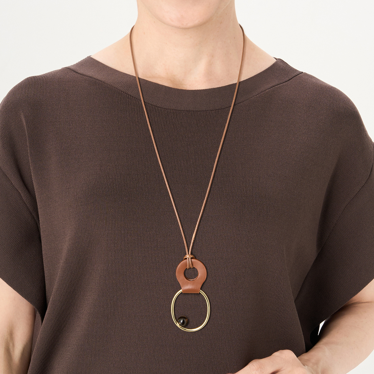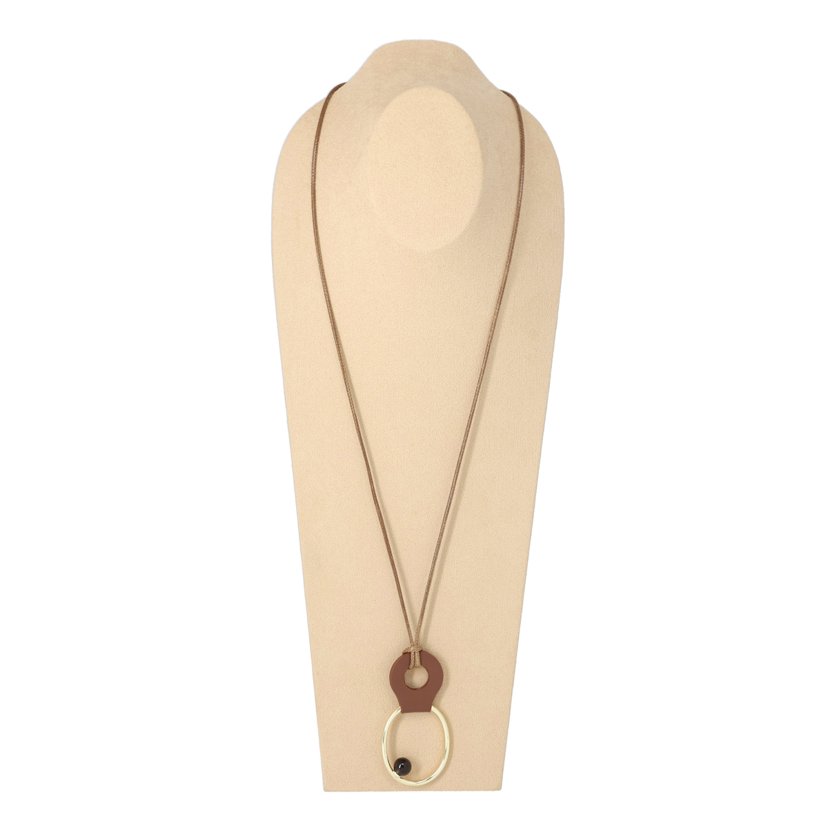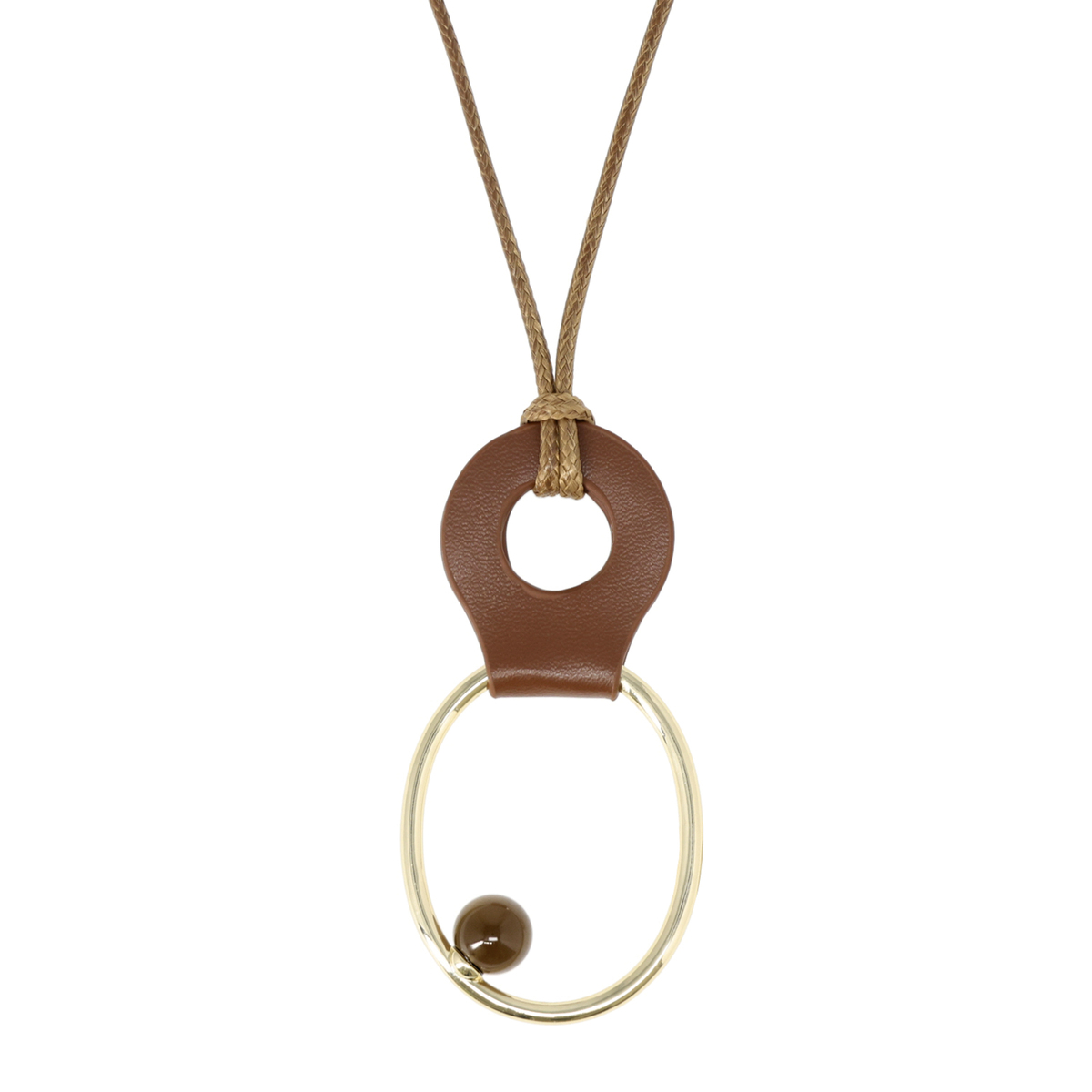 金属リングの内側に、天然石を配置。リングは合皮のパーツに固定された、ナチュラルな風合いのデザインです。茶色の紐を使うことで、全体に温かみと落ち着きを与えています