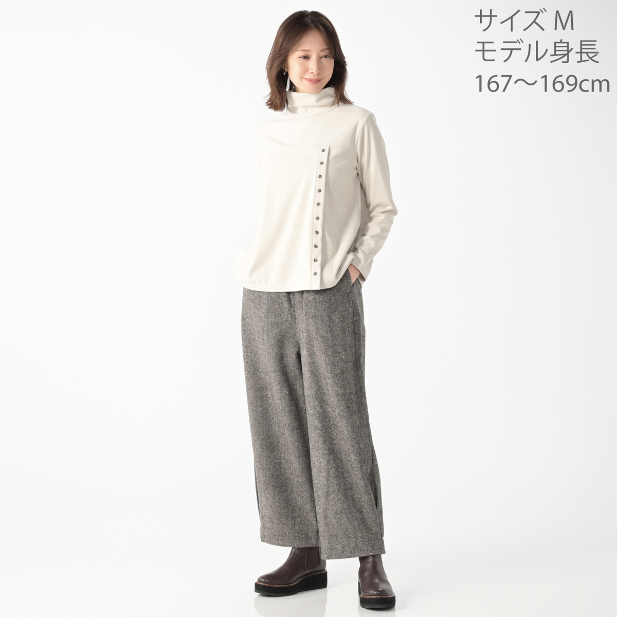 ワイドな裾タックがポイントのデザイン。ゆったりとしたサイズ感で体のラインを拾いにくく、裾のタックでボリュームを抑えた丸みのあるシルエットが上品な印象を演出します