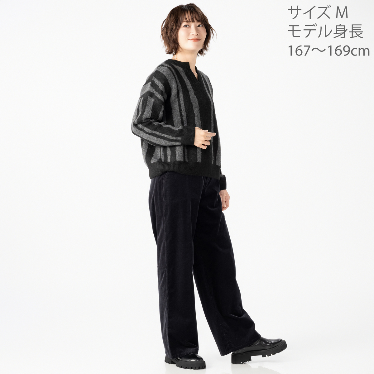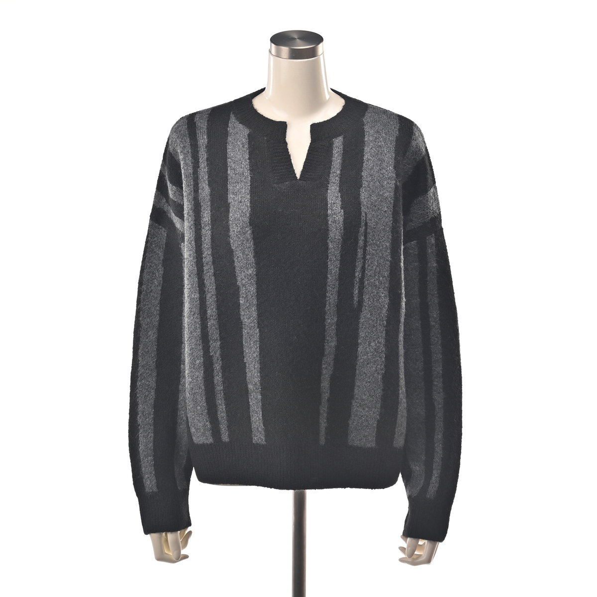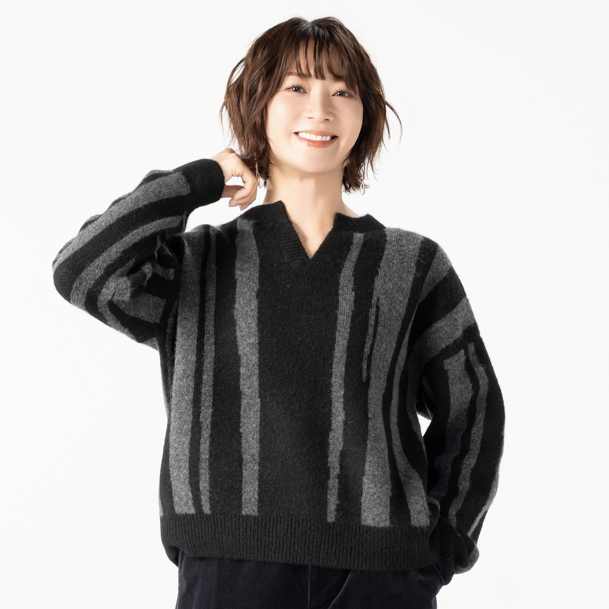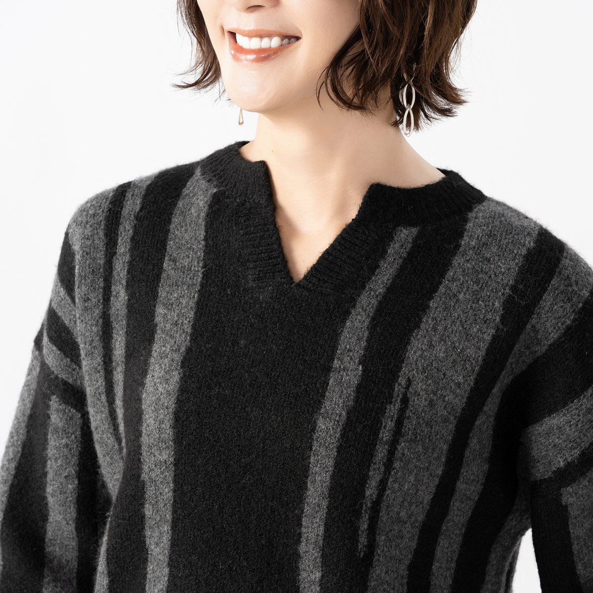 手書き風のランダムなストライプ柄のニットプルオーバー。もちもちの肌触りで暖かく、シャープな印象で着こなせるアイテムです