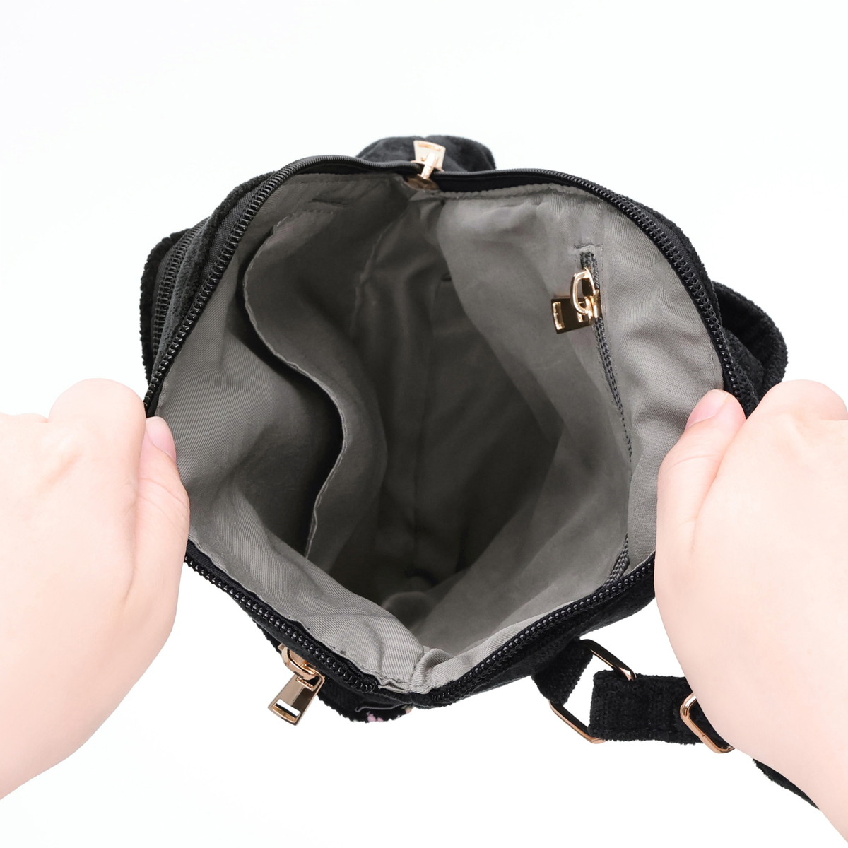 [サイズ(約)] 縦22×横17×マチ4cm ショルダー立ち上がり:30〜60cm [重量]約155g [素材] <表地> 本体柄部分:綿(シェニール織) 本体無地部分:ポリエステル ショルダー紐:ポリエステル100% ※裏地有 [仕様] 開閉:ファスナー式 底ビョウ:無 [ポケット] 内側:オープンポケット×1、ファスナーポケット×1 外側:ファスナーポケット×1、オープンポケット×1 【中国製】