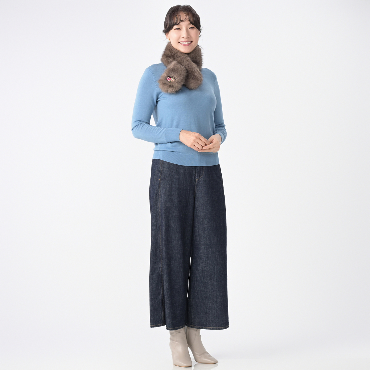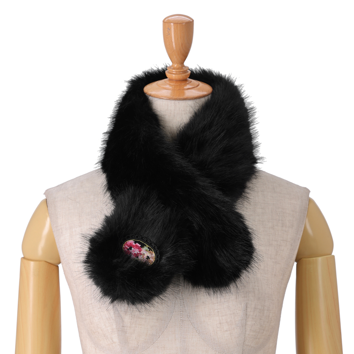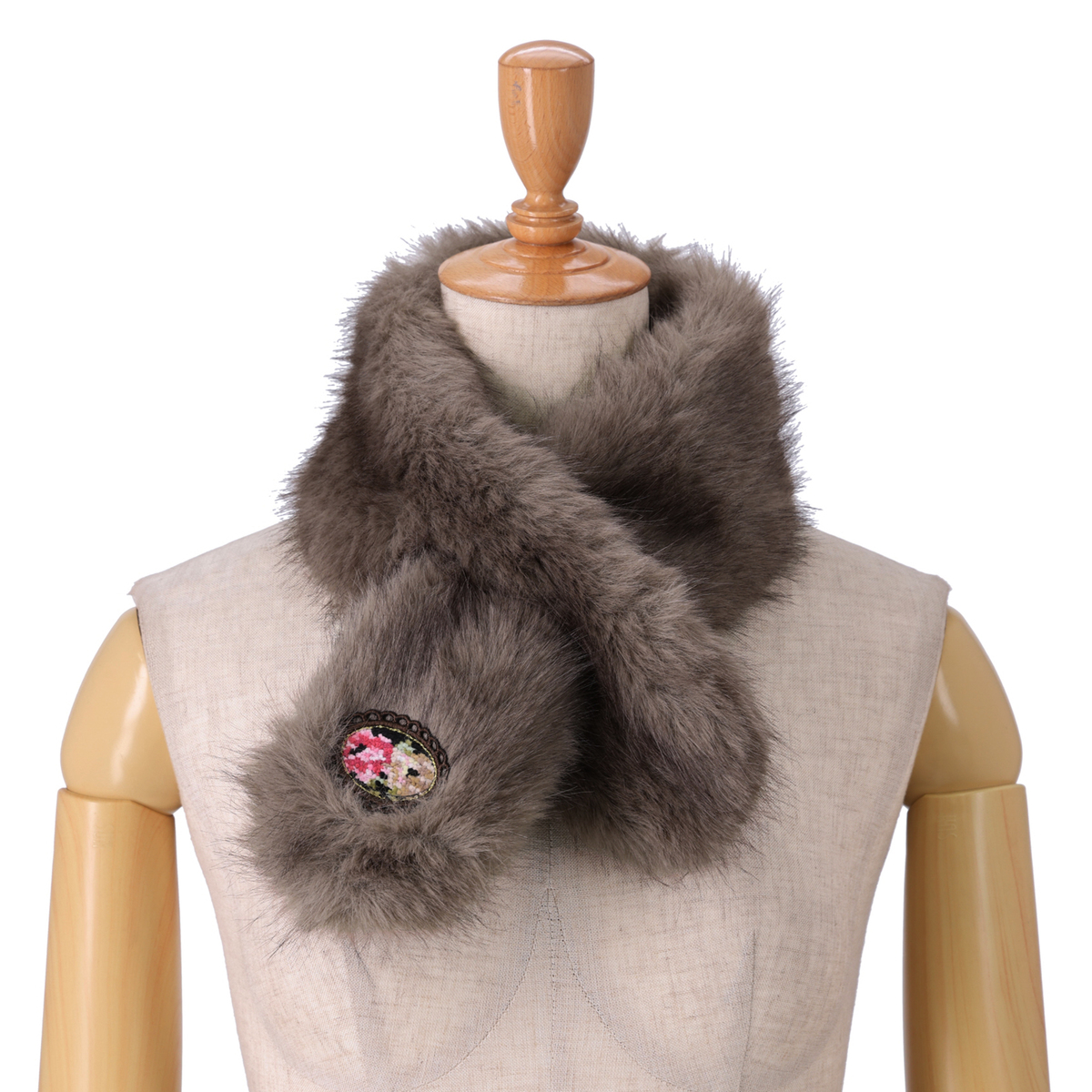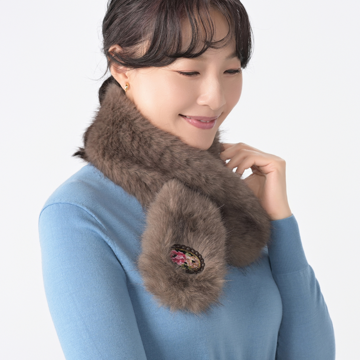 ふんわりとしたエコファー素材に、シェニール織のワッペンをあしらったマフラー。切れ込み部分に差し込むだけで首周りをしっかり包み込みながら、スタイルが決まります