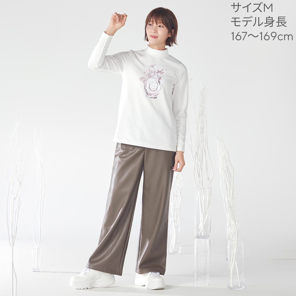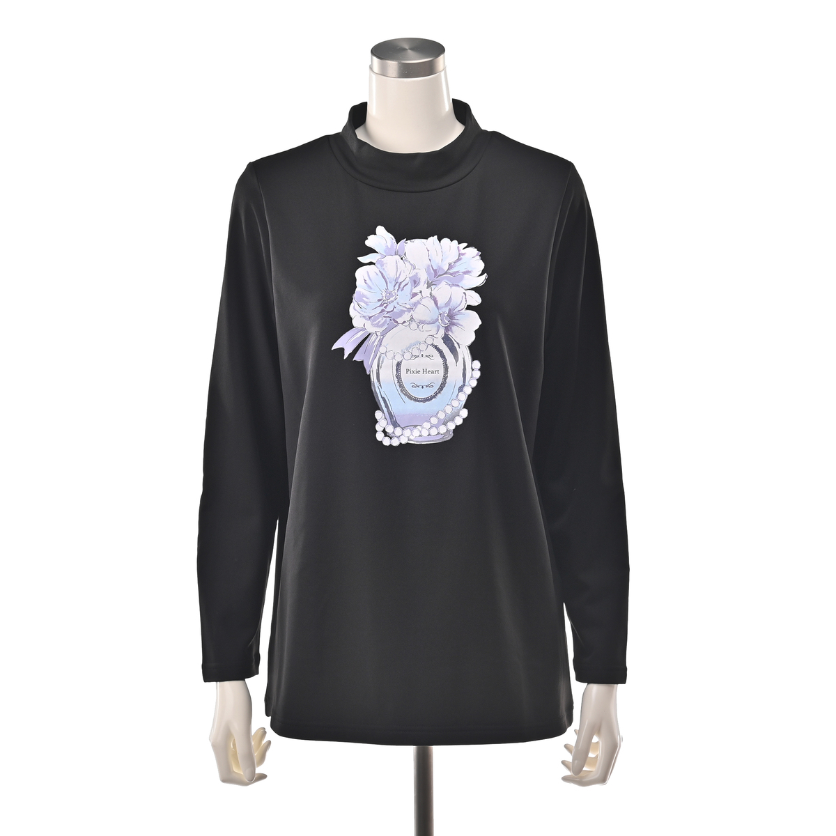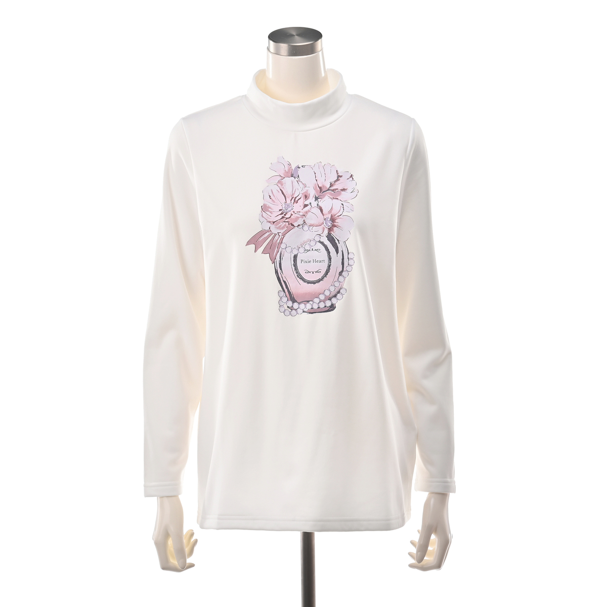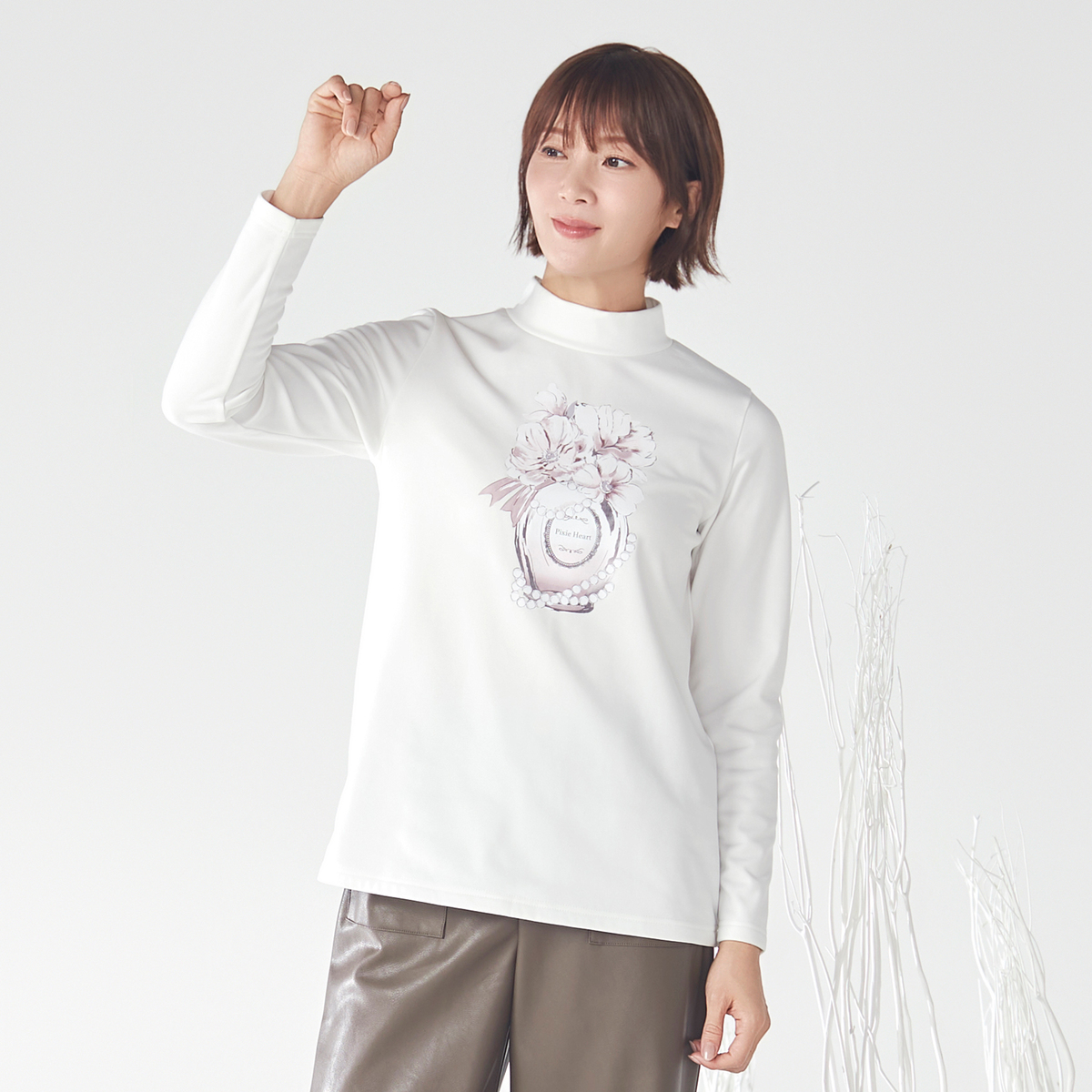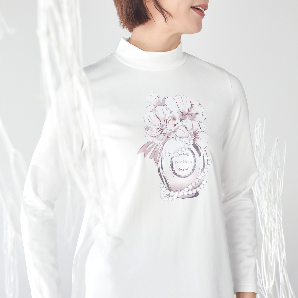 前身頃にプリントしたパフュームボトルが目を引くプルオーバー。モックネックとセットインスリーブが組合わさり、自然に裾へ落ちるシルエットでボディラインを拾いにくい仕上がりです
