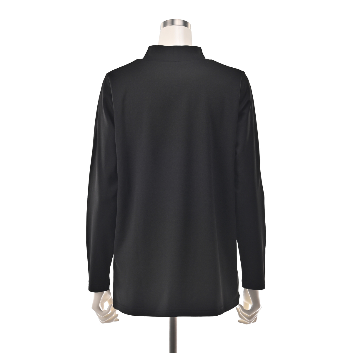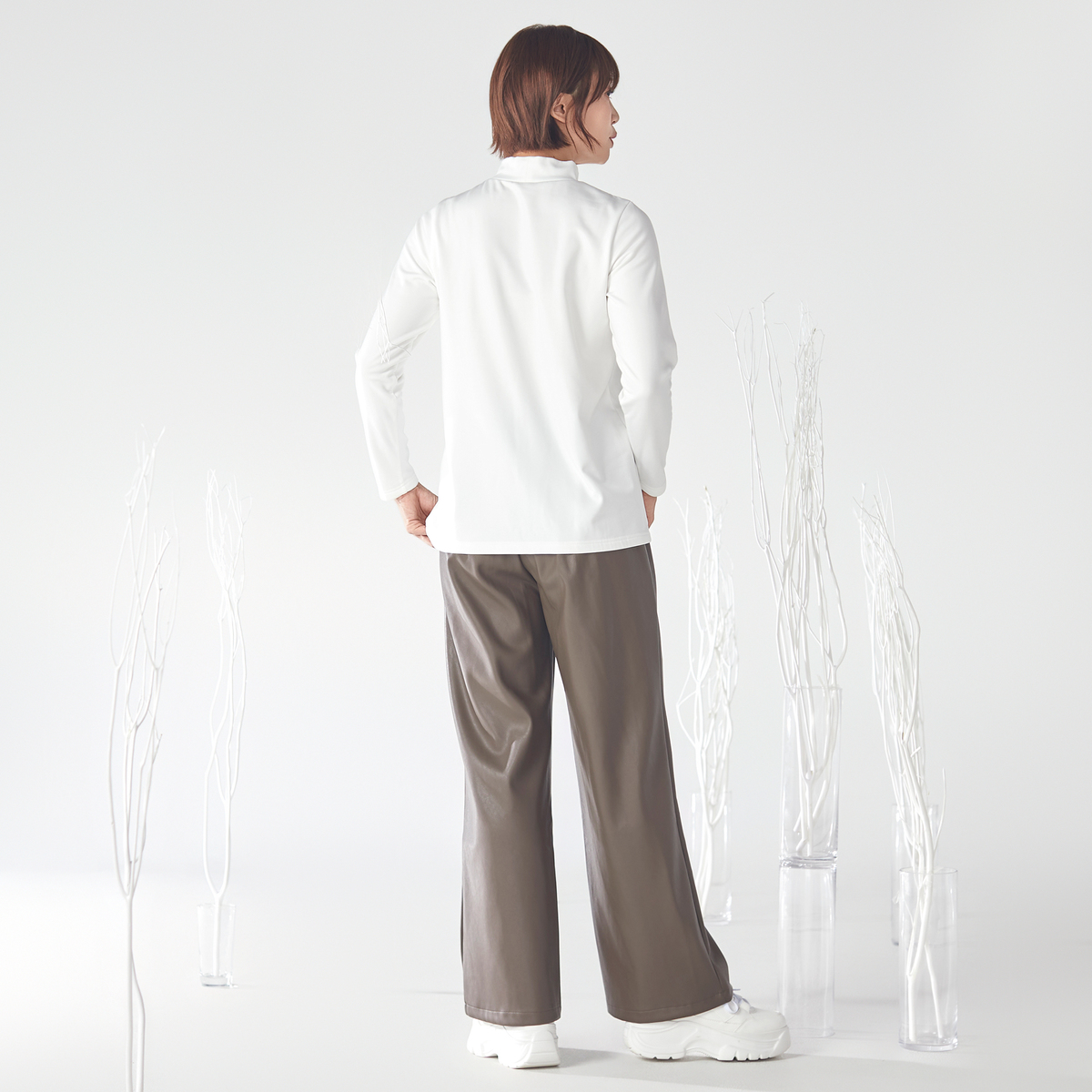 ポリウレタン混のスムース素材を使い、裏起毛の滑らかな着心地が魅力。また、ストレッチ性があり、洗濯後もシワになりにくく、紫外線を防ぐ機能も備えています