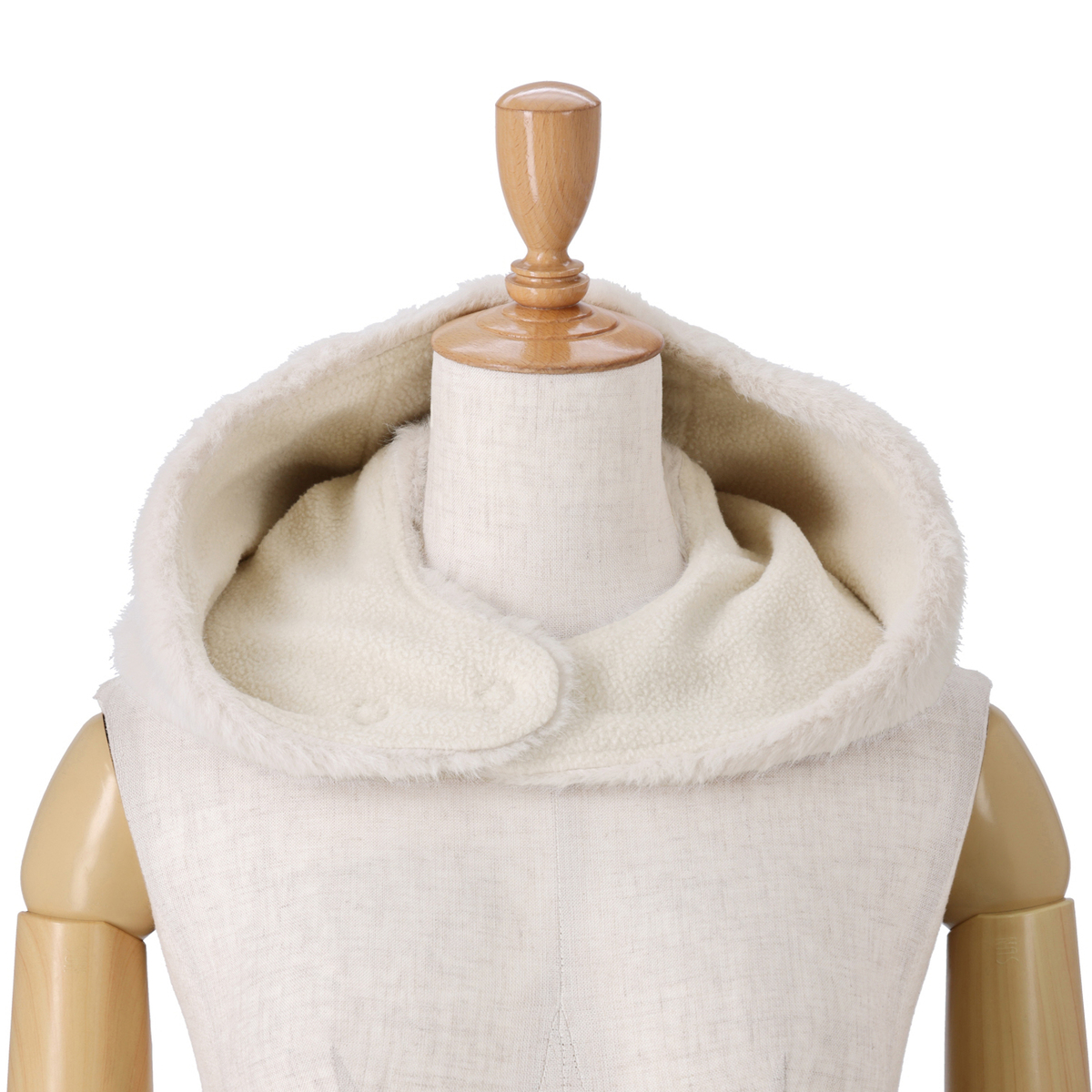 すっぽりと覆う形で、スナップボタンによるサイズ調整が可能。被っても首に掛けても使えるので、冬のコーディネートに幅を持たせます