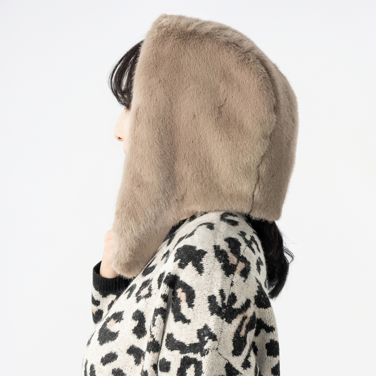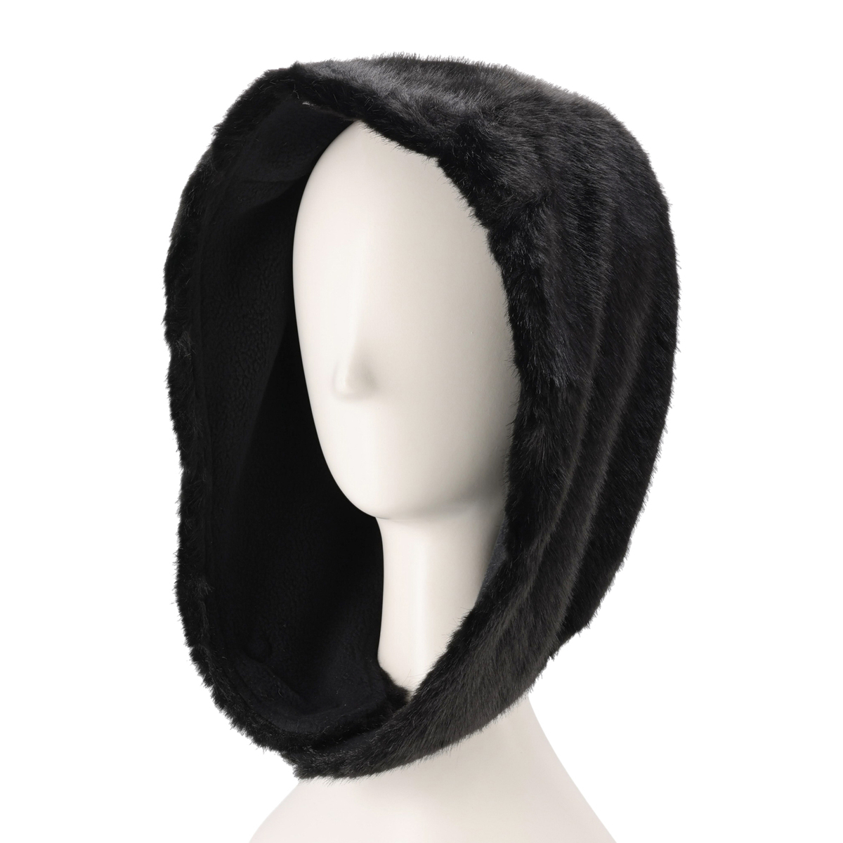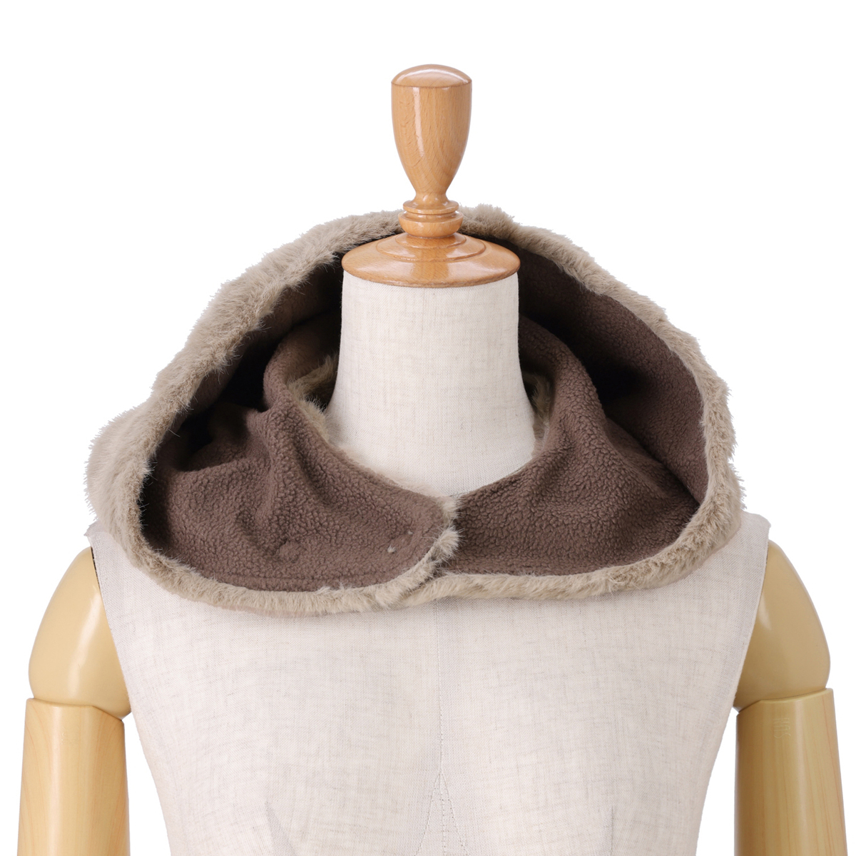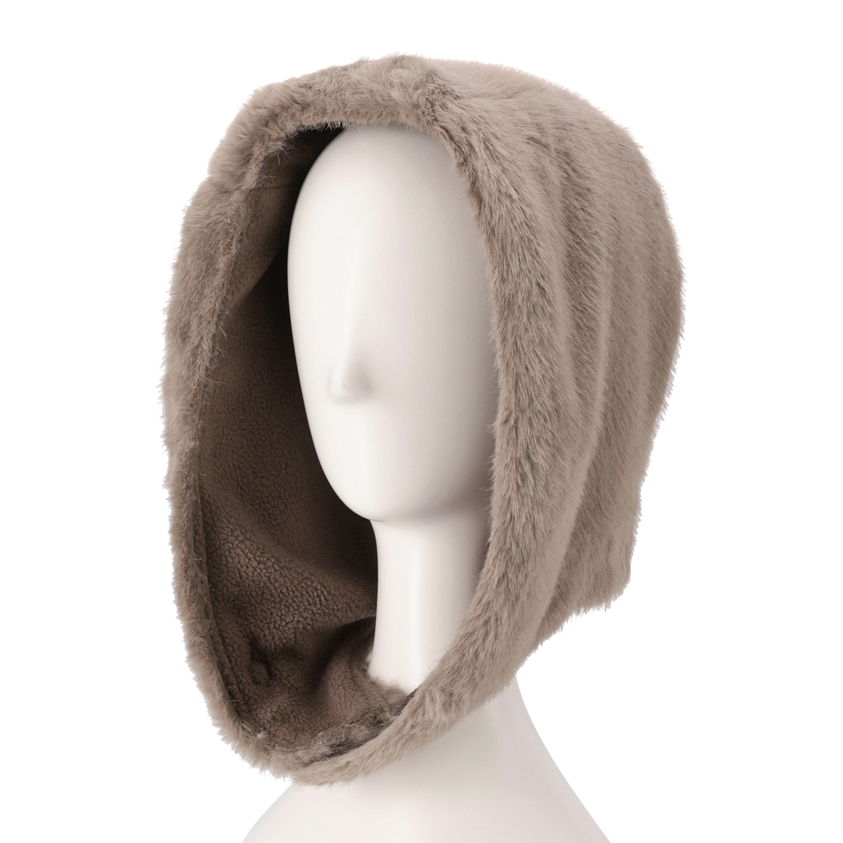 ミンク風のフェイクファー素材を使用したファー調フード。もこもこした見た目とやわらかな肌触りが特徴で、内側にはフリース素材を使った、暖かい仕様です