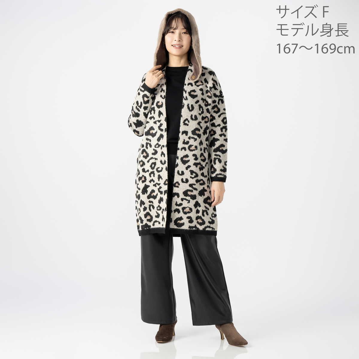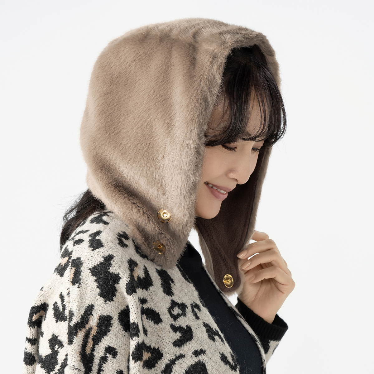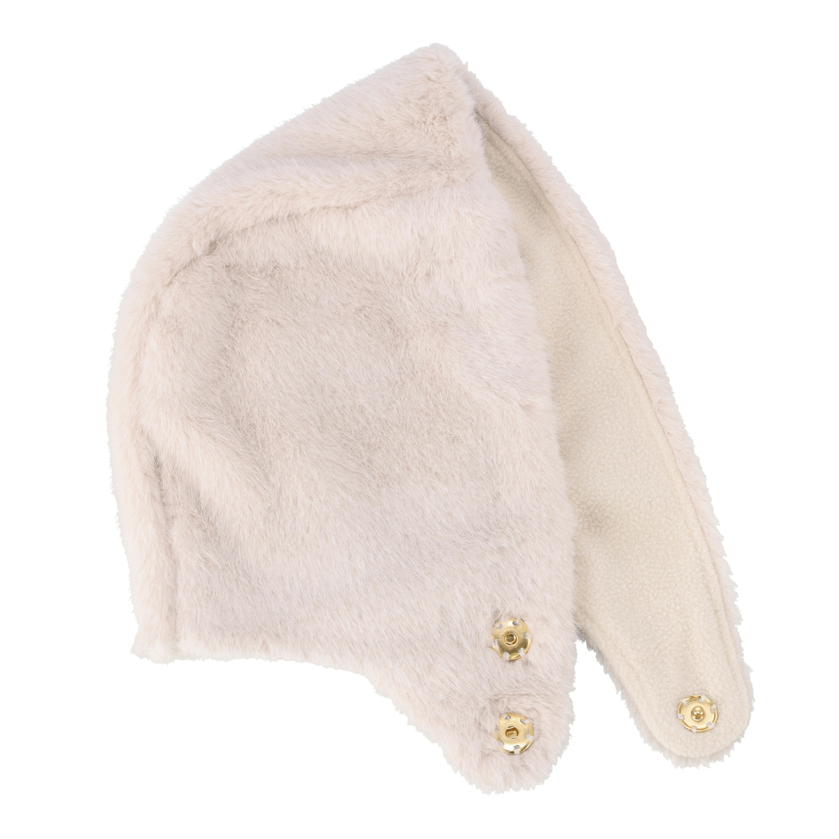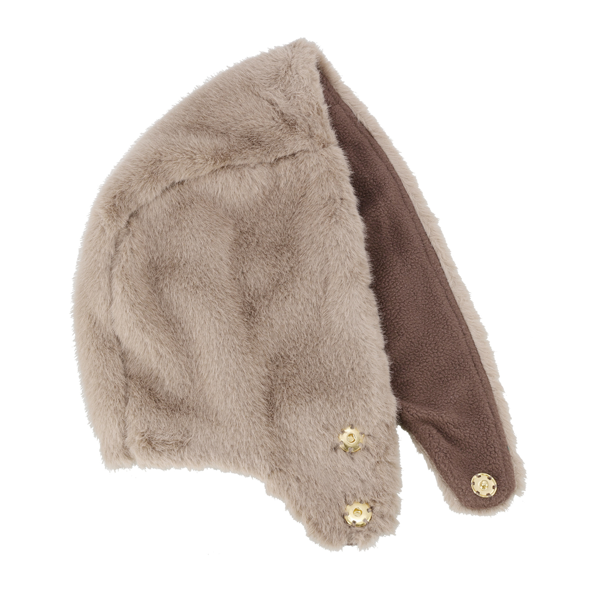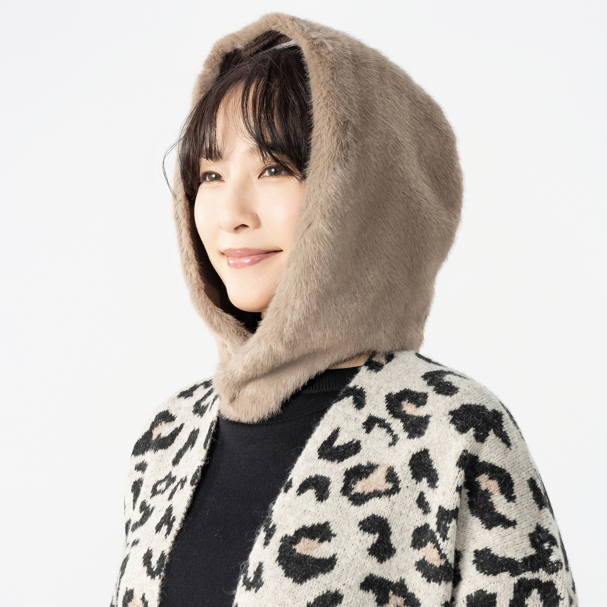 ミンク風のフェイクファー素材を使用したファー調フード。もこもこした見た目とやわらかな肌触りが特徴で、内側にはフリース素材を使った、暖かい仕様です
