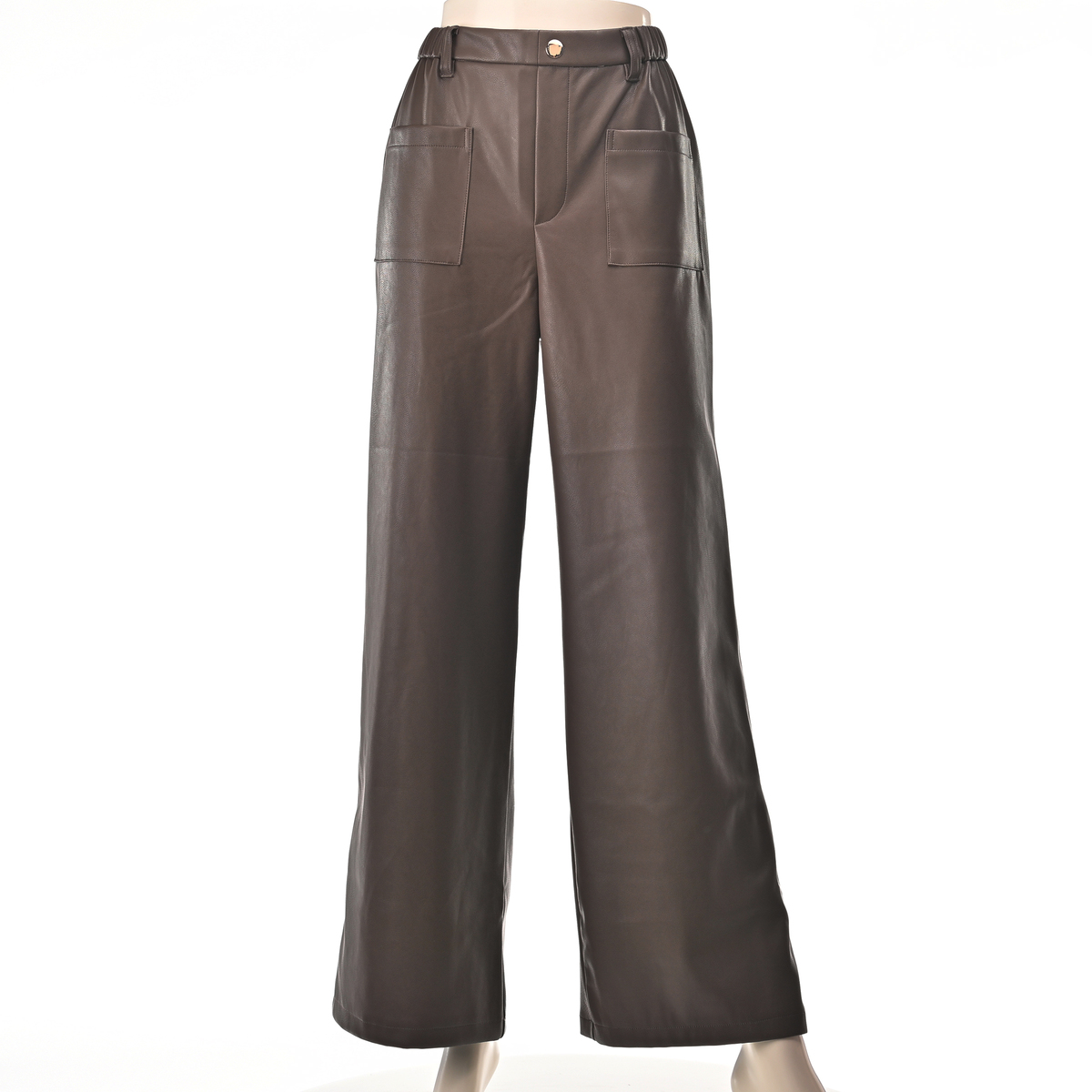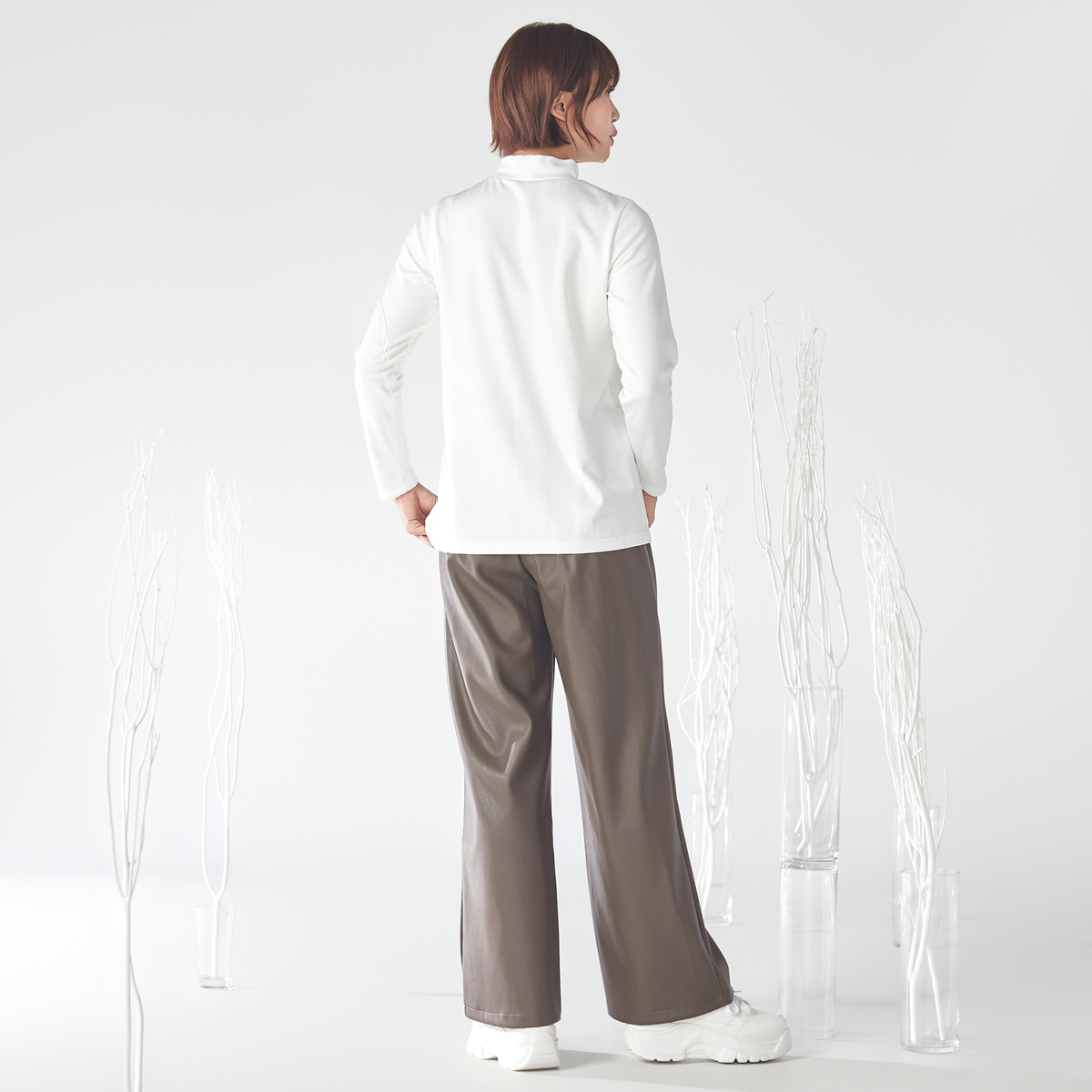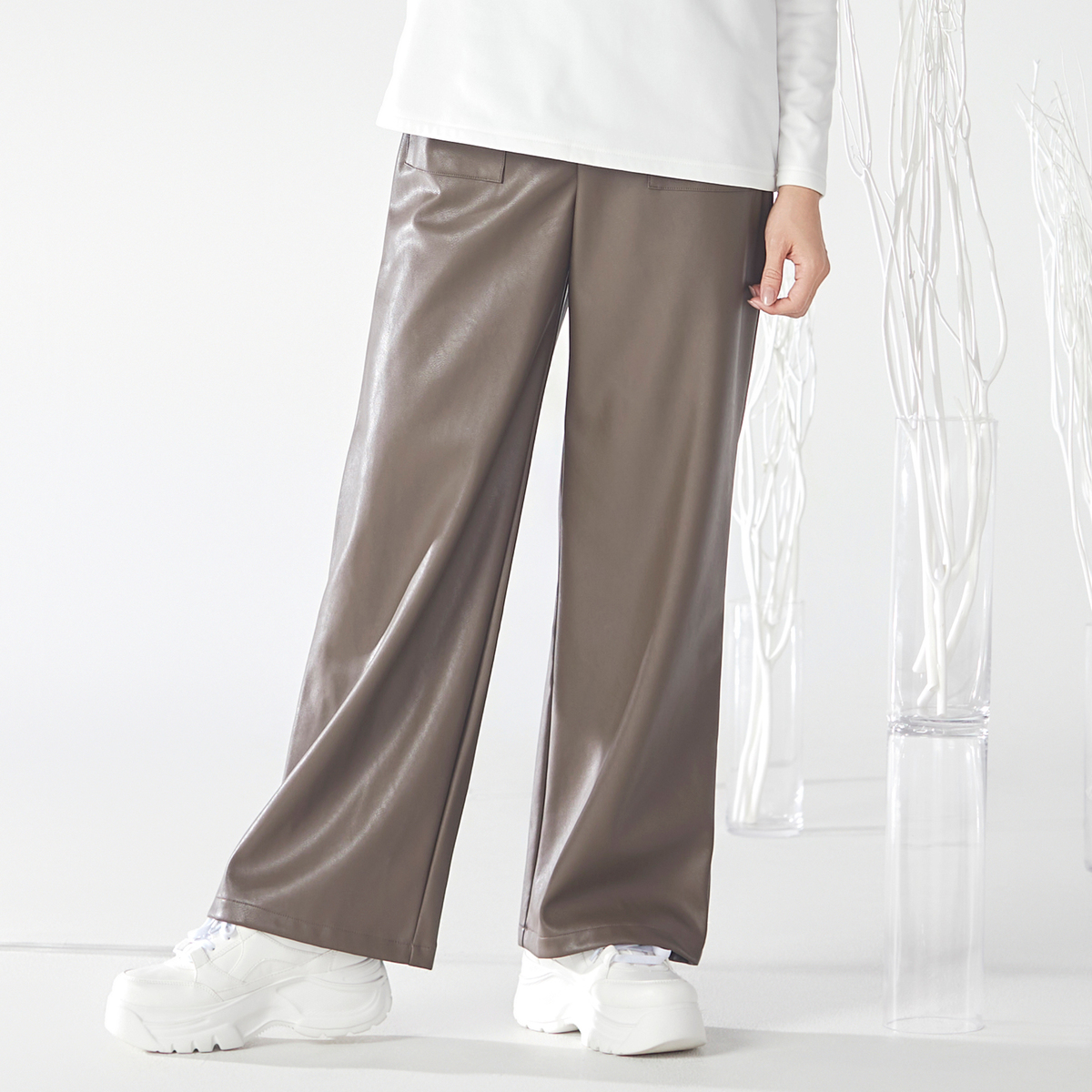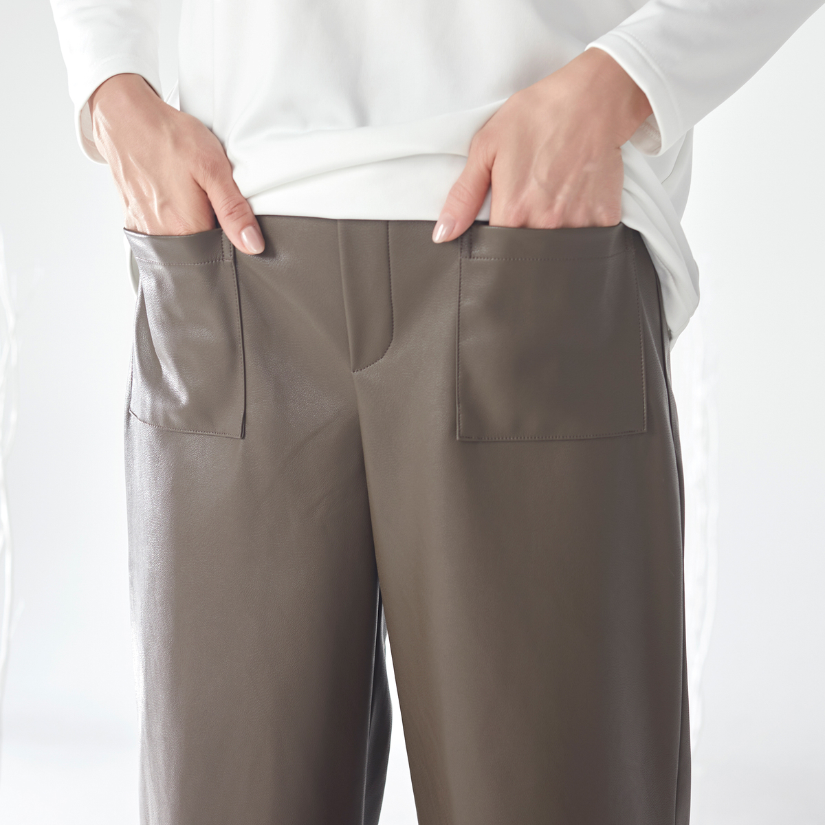 高級感あるフェイクレザー(合成皮革)を表面に、裏面には起毛のトリコットをボンディングしたワイドパンツです。暖かく、ストレッチ性があり、ヒップまわりをすっきり見せる立体的なパターンで、脚のラインもきれいに見えるシルエットに仕上げました