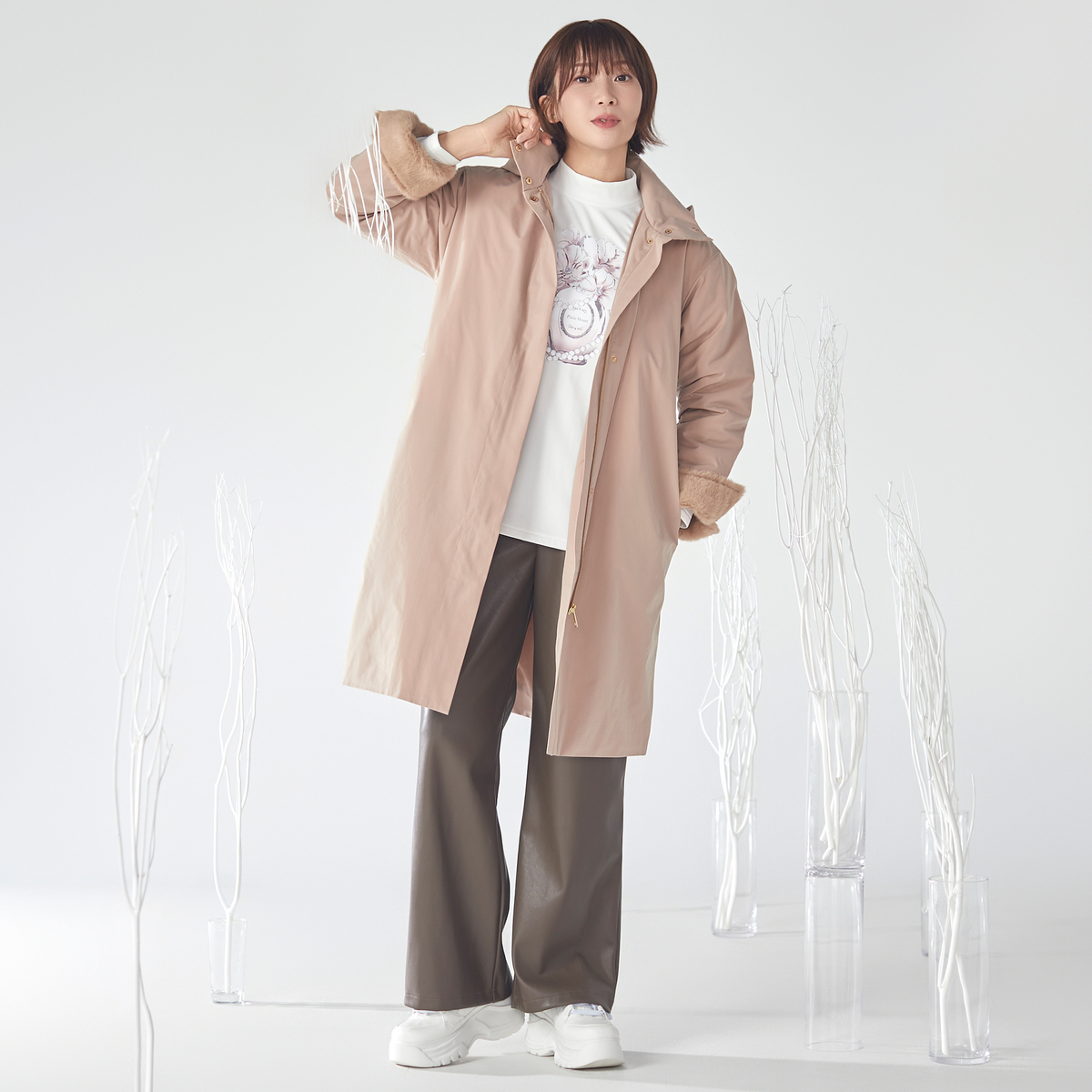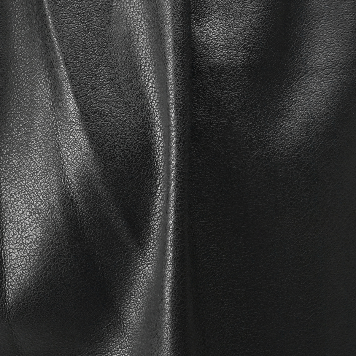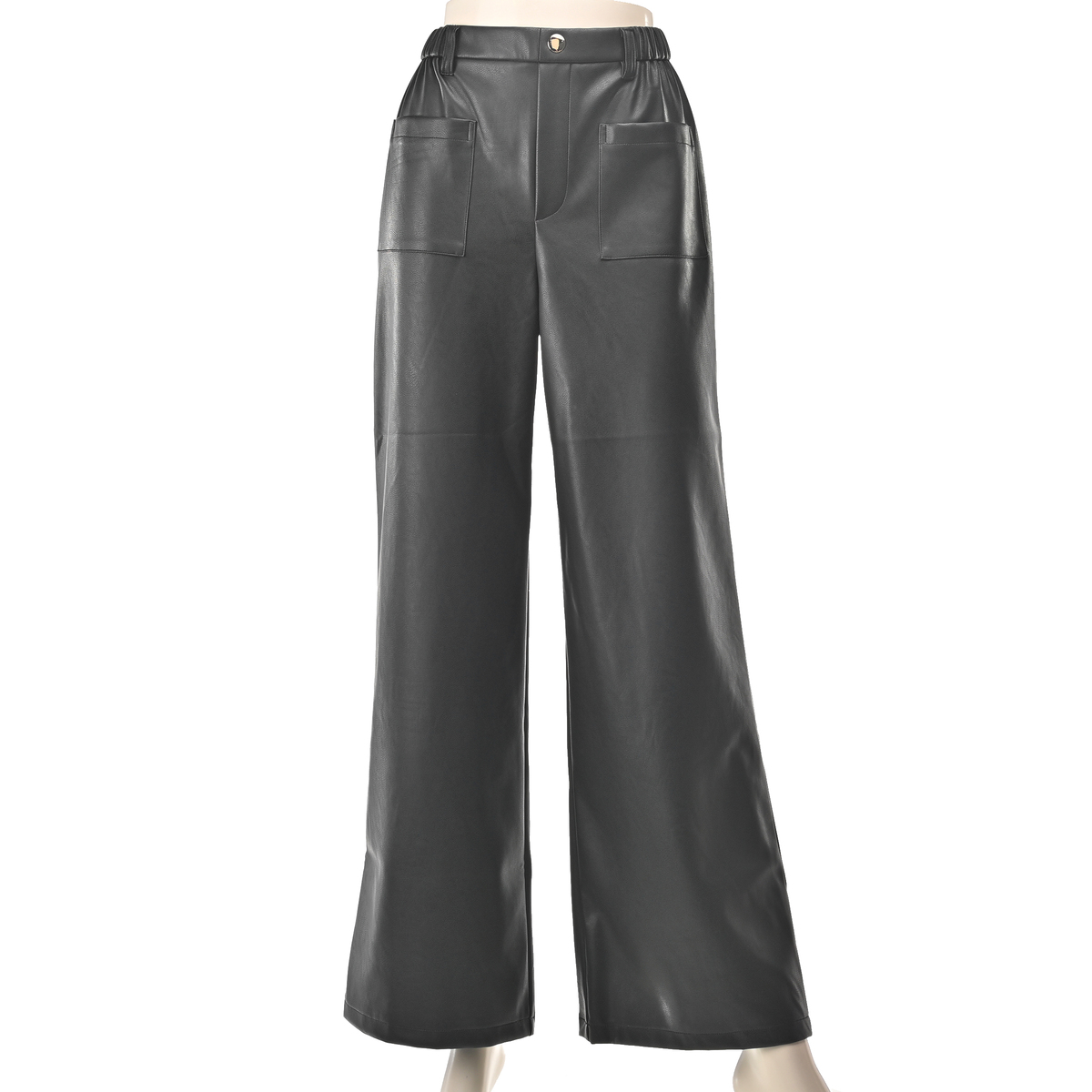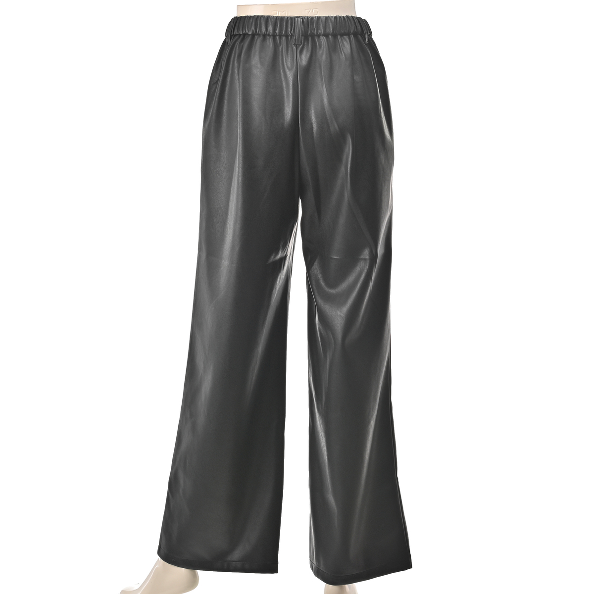 高級感あるフェイクレザー(合成皮革)を表面に、裏面には起毛のトリコットをボンディングしたワイドパンツです。暖かく、ストレッチ性があり、ヒップまわりをすっきり見せる立体的なパターンで、脚のラインもきれいに見えるシルエットに仕上げました