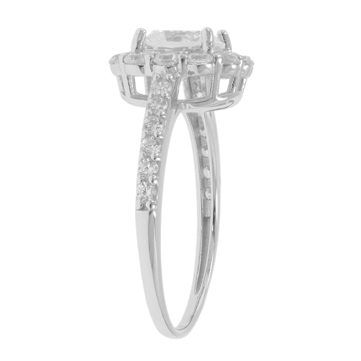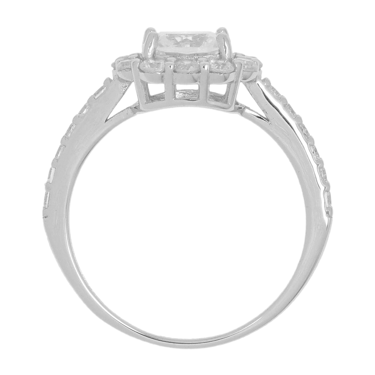 クッションカットのダイヤモニークCZをあしらったリング。周囲にはラウンドカットのダイヤモニークCZを贅沢に24石あしらい、クッションカットのダイヤモニークCZを美しく引き立てています