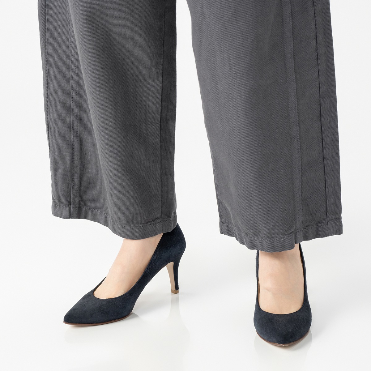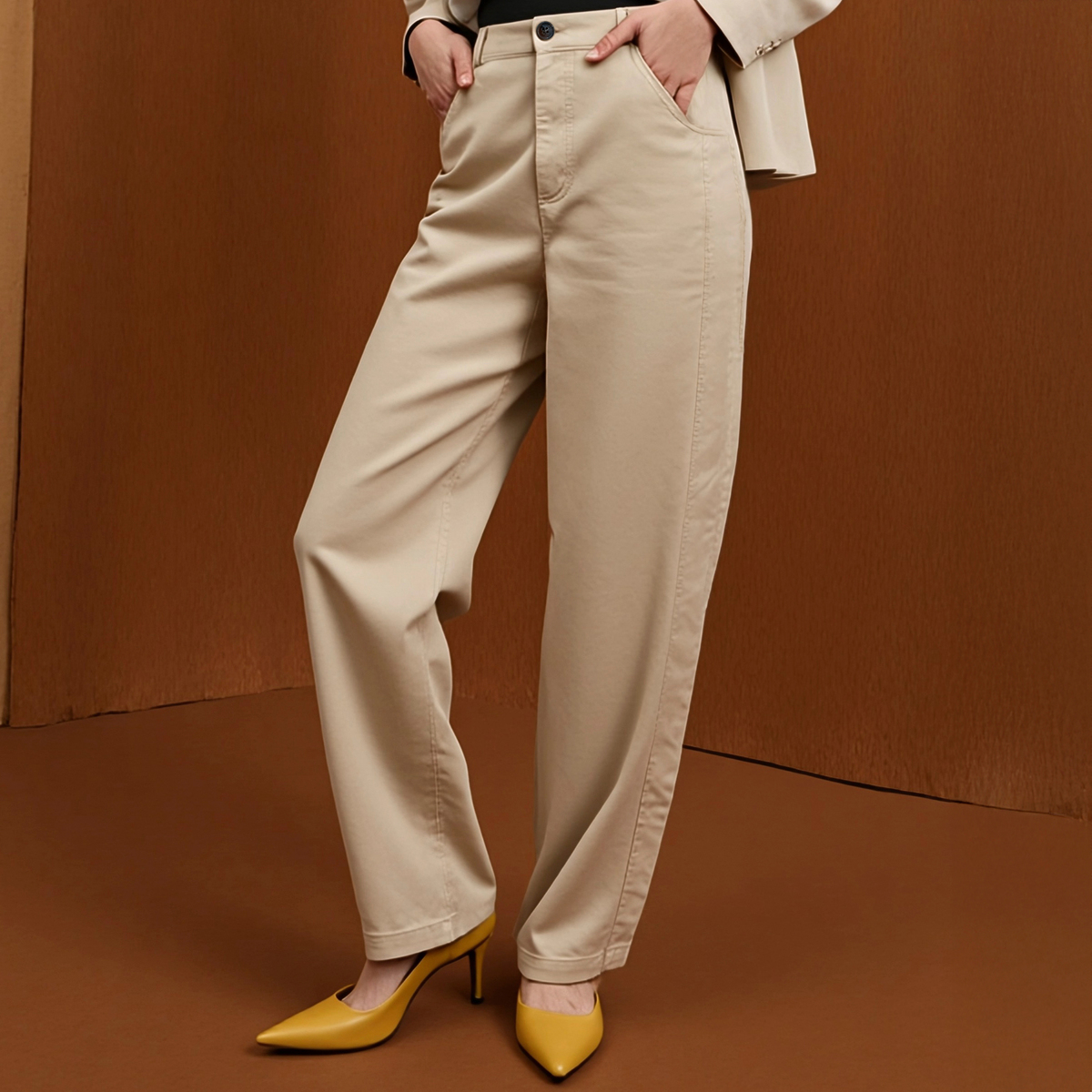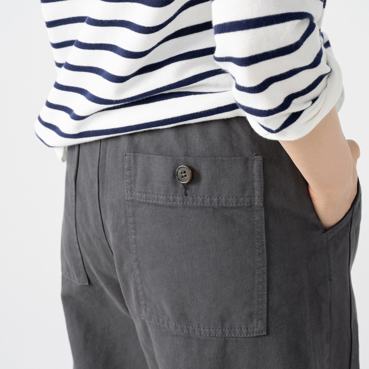 綿混素材で仕立てたコクーンパンツ。ストレッチ性はない素材ですが、製品洗いによる柔らかな見た目と洗いざらし感が魅力です。ウエストは後ろにゴムを配し、窮屈感を感じにくく快適に。腰から裾に向けて丸みのあるカーブシルエットが、カジュアルなコーディネートに自然になじみます