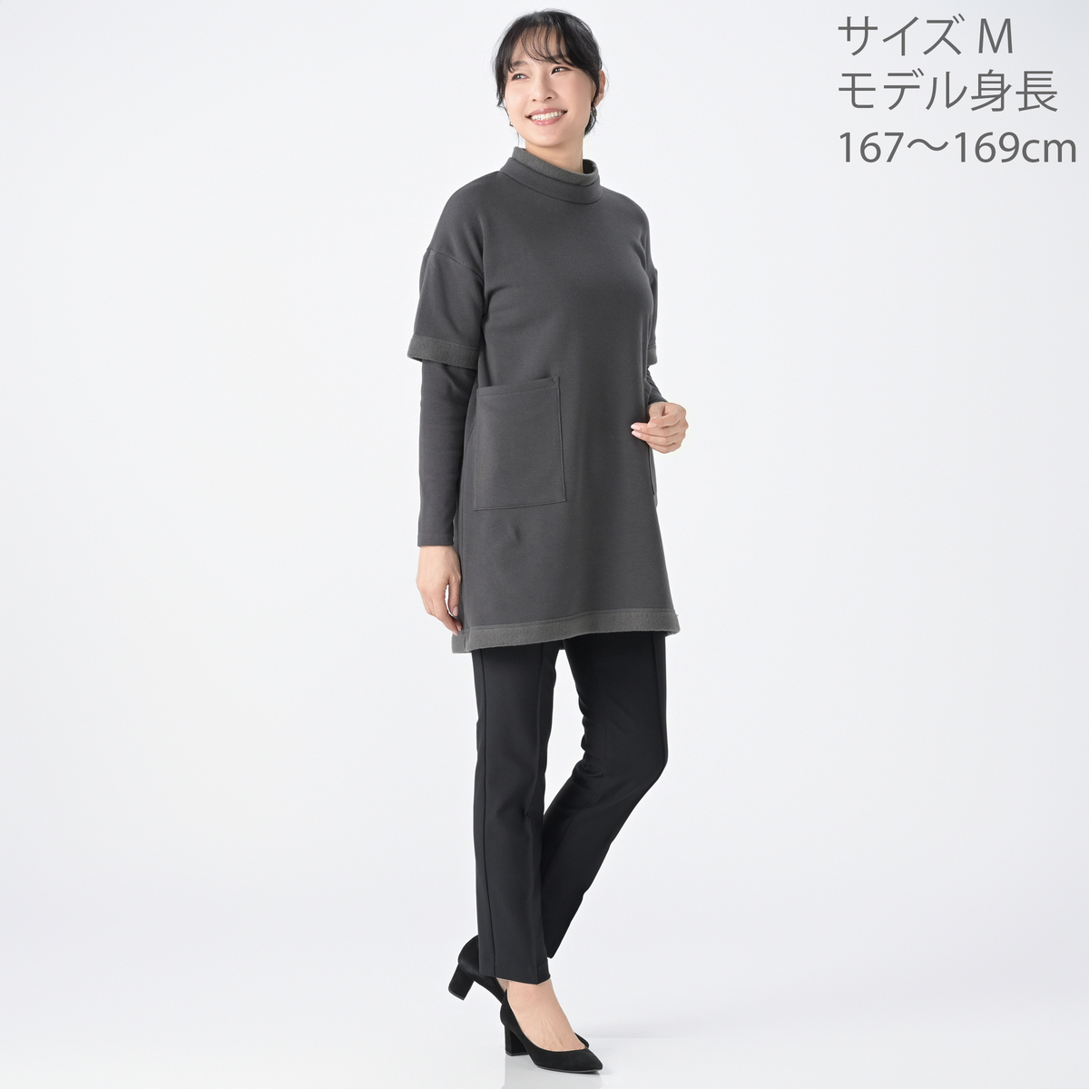 前身頃の大きめポケットは、実用的でアクセントにも。本体には吸湿発熱性と保温性があり、寒い季節もあたたかく着用できます