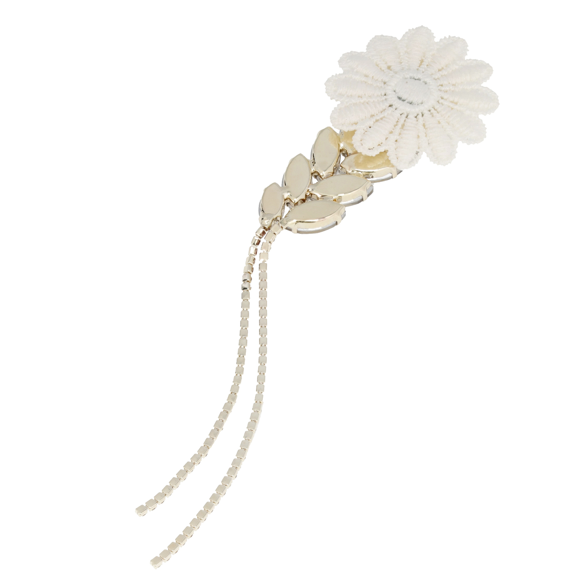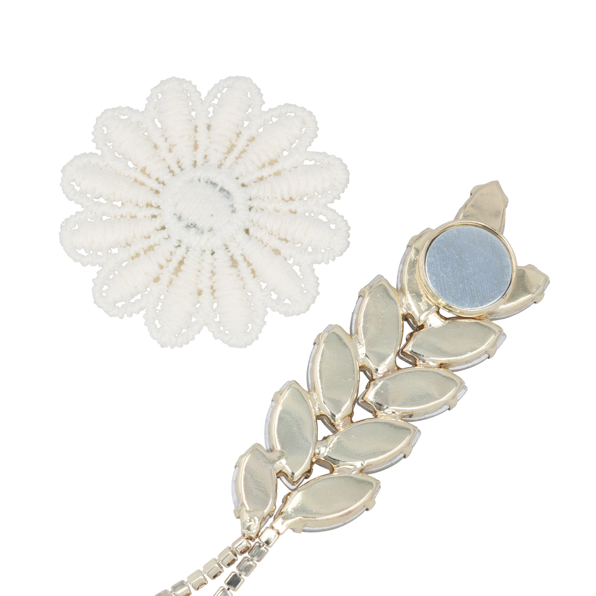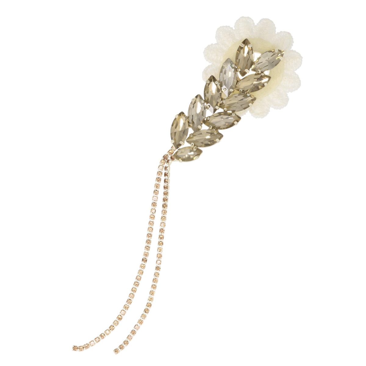 ガラスストーンでリーフ(葉)をモチーフにしたマグネットタイプのコサージュ。葉の部分に楕円形のナベット型ガラスストーンを使用し、枝部分は小さめのガラスストーンのチェーンで表現しました