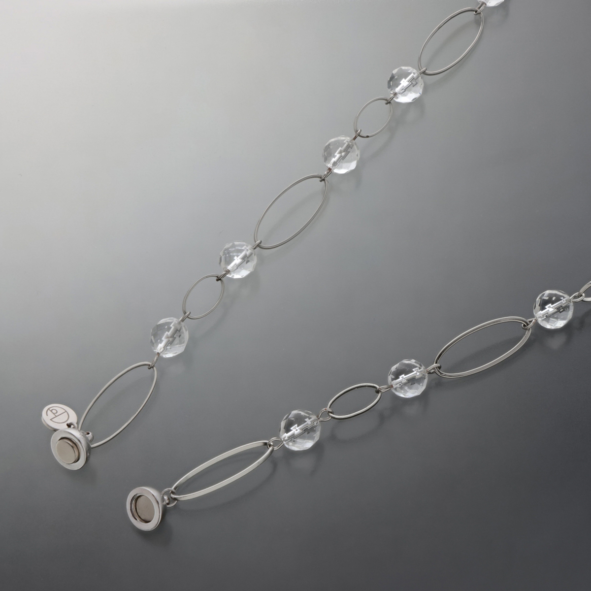マグネット式の留め具を採用し、着脱がスムーズ。おそろいのブレスレットとつなげてコンバーチブルとしても楽しめます