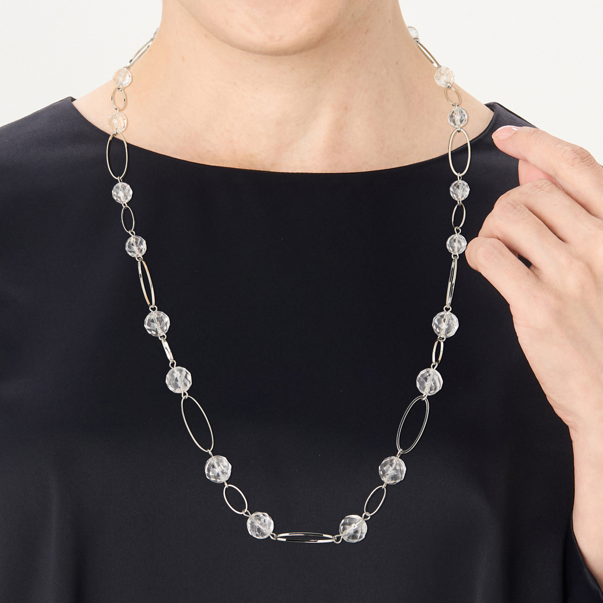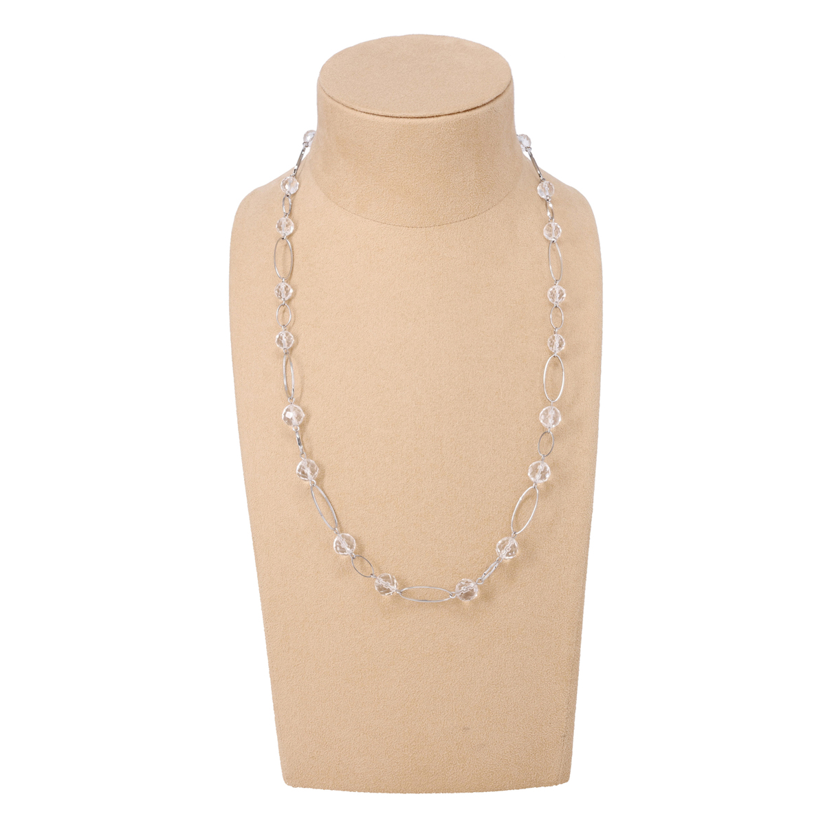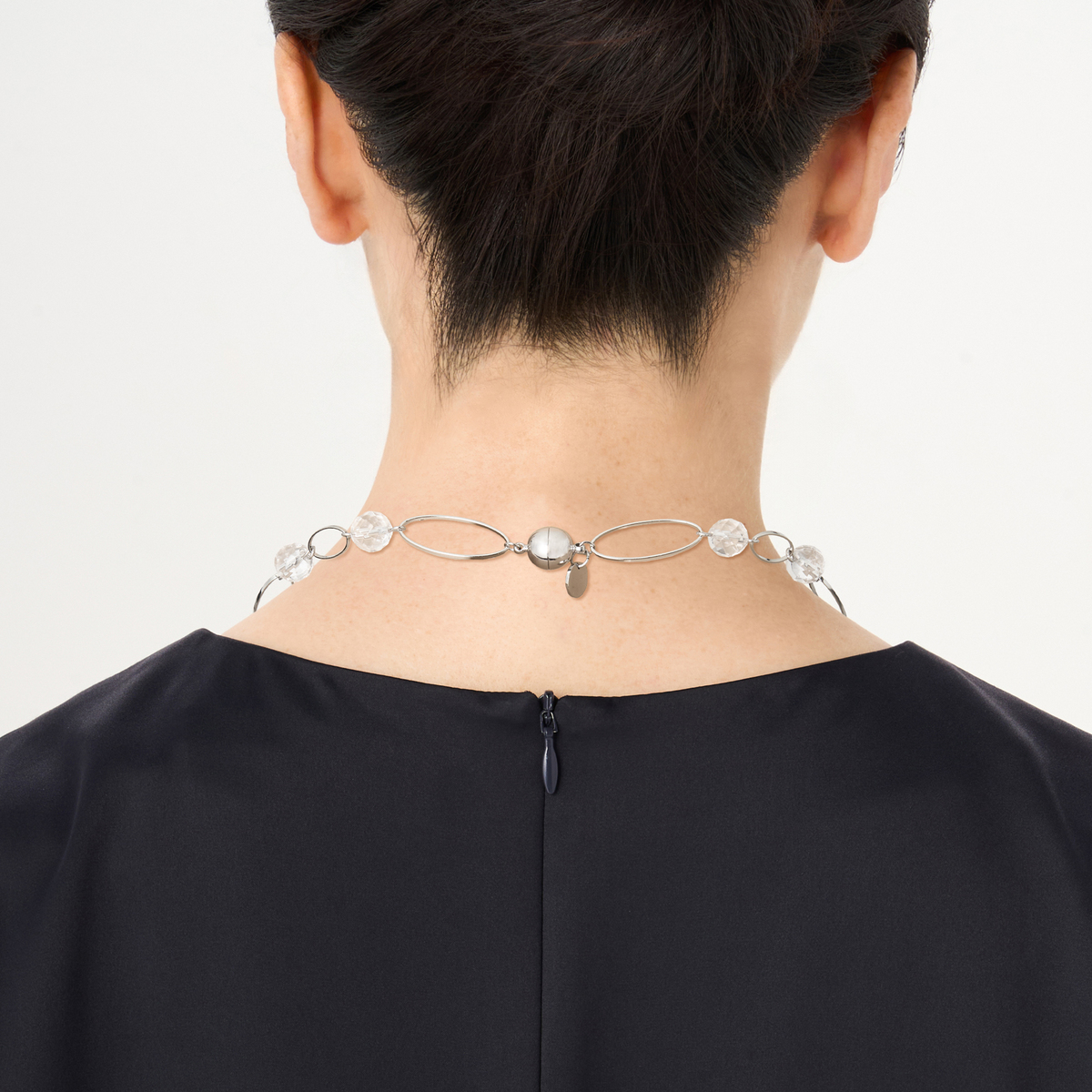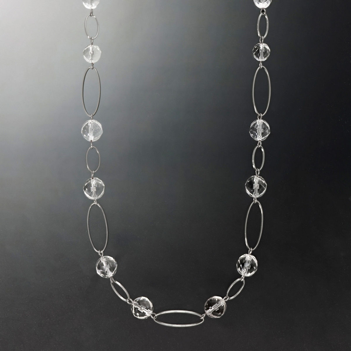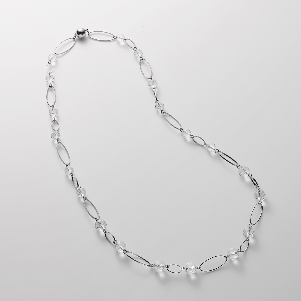 透明なロッククリスタルビーズと楕円形の銀色パーツを交互に連ねたネックレス。シンプルながらも華やかに胸元を彩ります