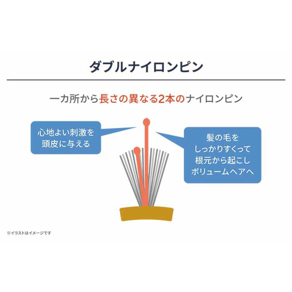 ブラッシングによりツヤのある髪へ導き*1、長さの異なるダブルのナイロンピン(一箇所から2本のナイロンピン)が髪の毛をしっかりすくって根元から起こし、ふんわりしたボリュームヘアに導きます