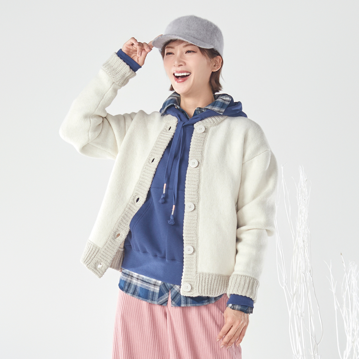 様々なコーデに活躍してくれるカウチン風ニットブルゾン。無地見えのジャガード編地を採用し、すっきりとしたデザインに仕上げました