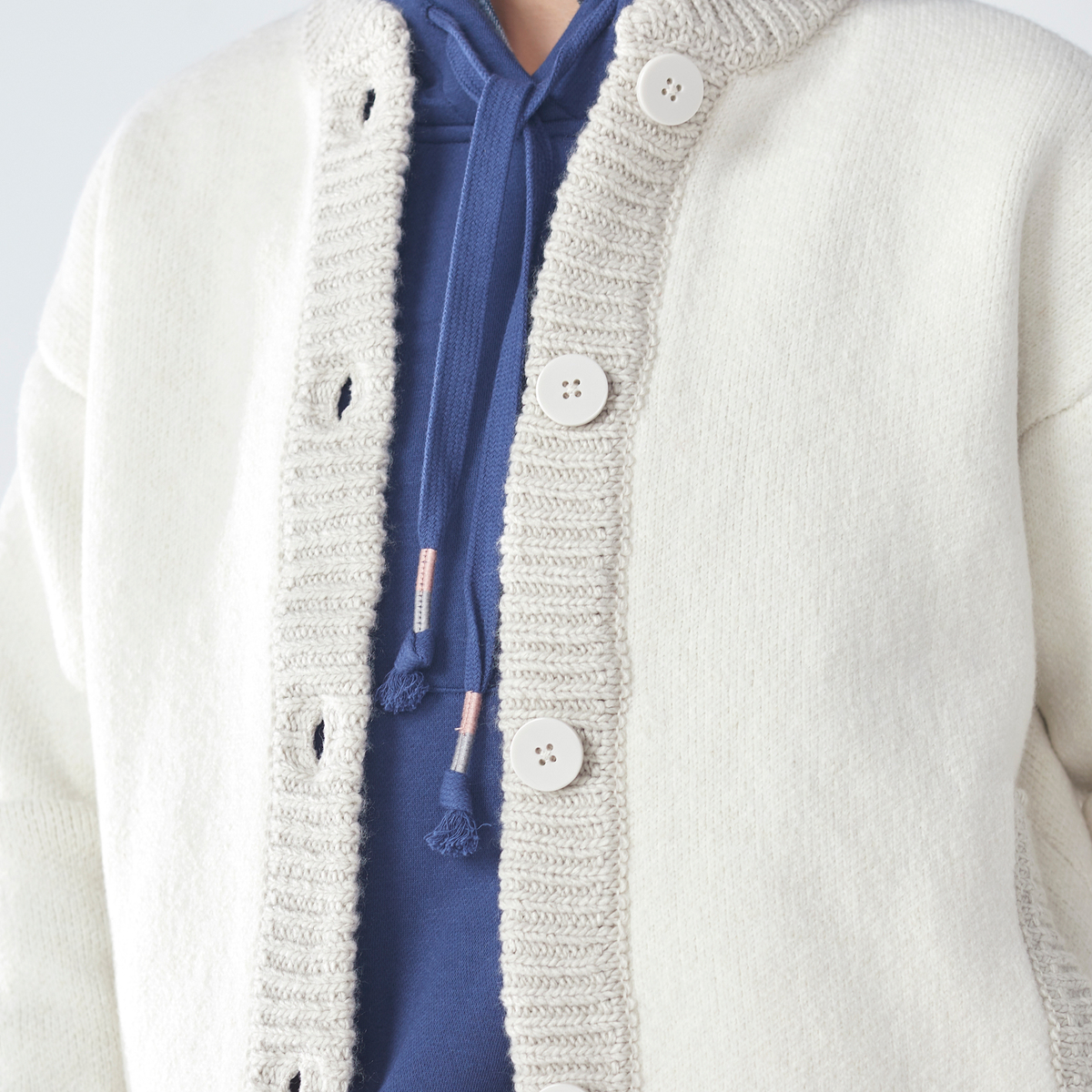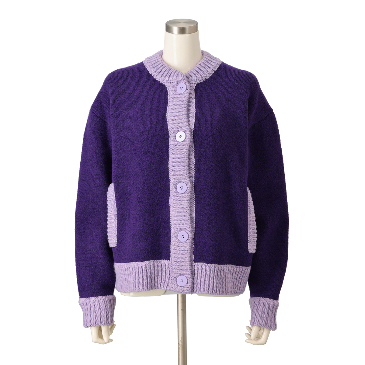 他では手に入らなそうな色なのでこれにしました。あと、以前購入したラベンダーのベロアワンピとワントーンコーデしたかったので。ピーチやレッド、グレーの時にお話があったような、単色じゃない糸だったらもっと良かった。例えばリブ部分だけでも。サイズは莉子ちゃんのオススメに従って1サイズ上げましました。普通に試着した時はジャストサイズの方がよかったかなと後悔。中にハイネックを入れてボタンを上まで留めた時は、サイズアップして正解と思いました。サイズ表を見る限りそこまで大きく変わらないようなので、交換はせずこのまま着ます。莉子ちゃんの推奨の着方のうち、下のボタンを留めて胸元を開けるならジャストサイズの方が良かったかも。もうひとつの、下にGジャンを入れる着方は新鮮でカッコよくて、サイズアップして良かったと思いました。ただ、Gジャンによっては、袖がもこもこするかもなので、これは2サイズくらいアップした方が良いかもしれません。まとめると、カーディガンとして上にコート等を着るのを想定している方はジャストサイズ、これをアウターとして考える方はサイズアップが良さそうです。糸を2倍使っているとの事なので、重さはこんなもんじゃないでしょうか。着てしまえば、私は何も気になりませんでした。