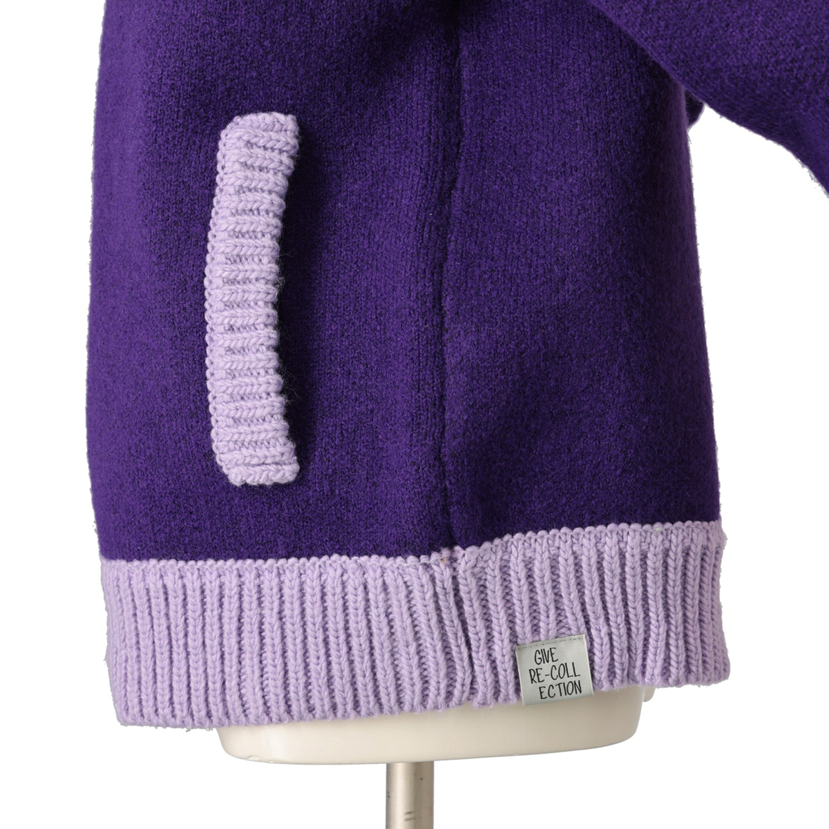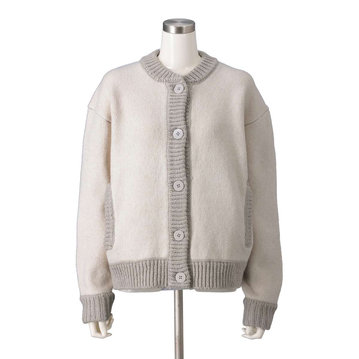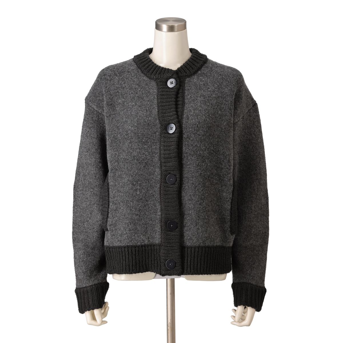 アウターらしい肉厚なニット素材。リブ部分はローゲージ風に編地変化をつけ、ニットらしい温もり感のある雰囲気に。カラーによって本体とリブを配色デザインに仕上げています