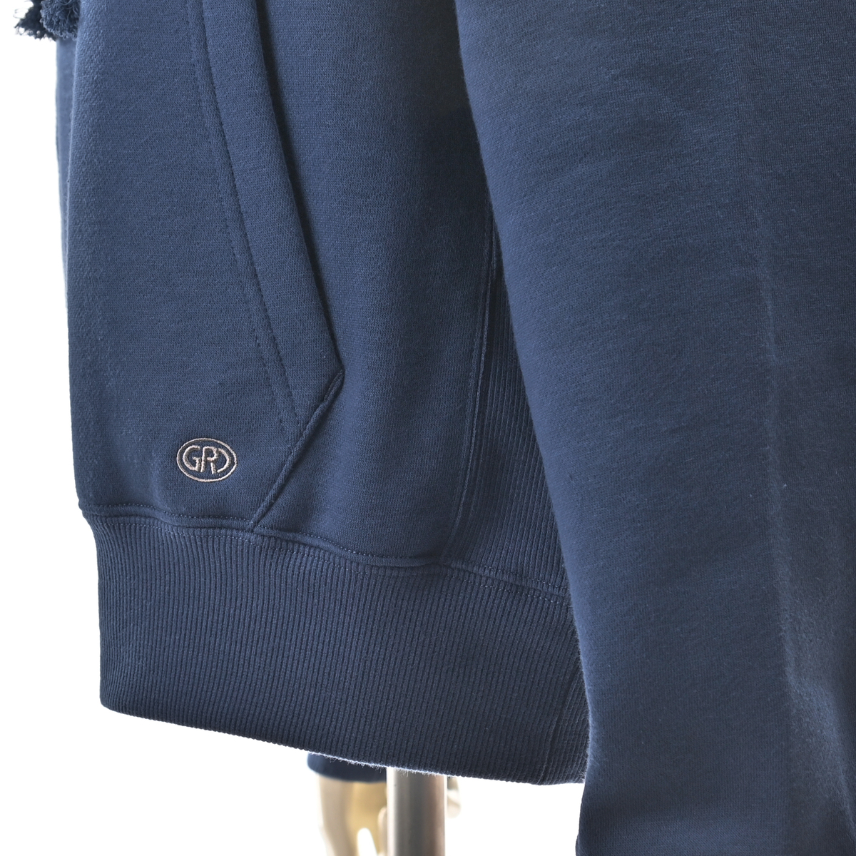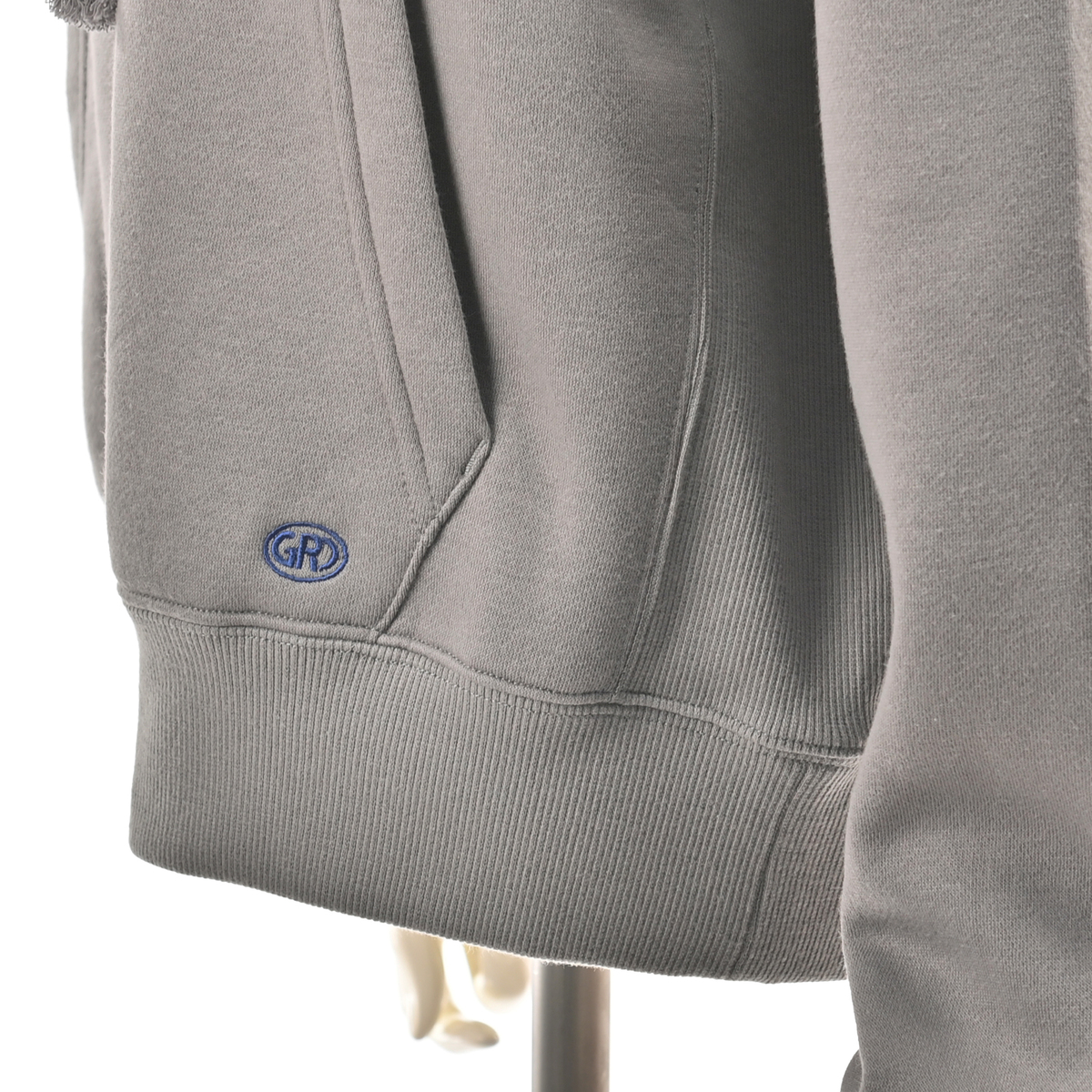 フードの紐の先には飾り巻き刺繍を施し、クラフト感をプラス。また、フロントポケットにはGRCマークの刺繍を入れ、さりげないアクセントになっています