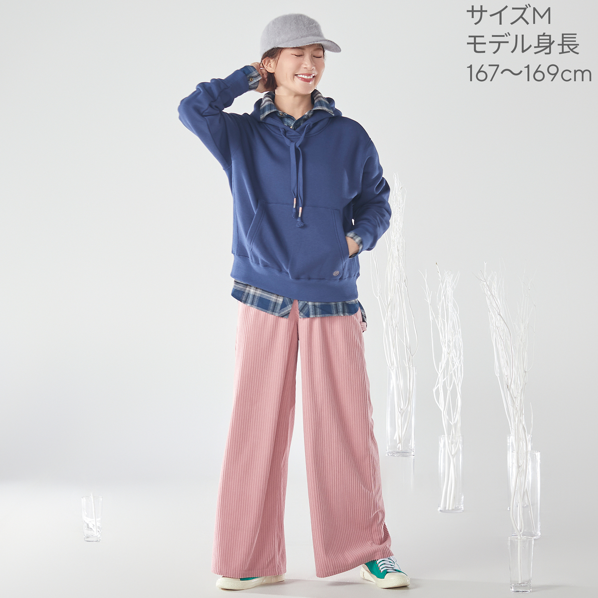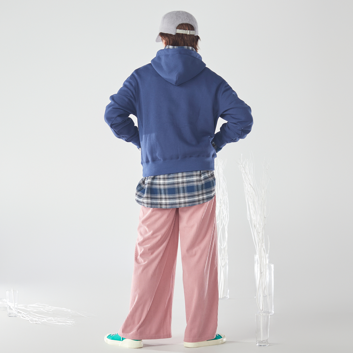 脇にリブ切替を施したシンプルなデザイン。こなれ感のあるゆったりとしたシルエットで、大きめのフードとフロントのカンガルーポケットによりバランスよく着こなせます