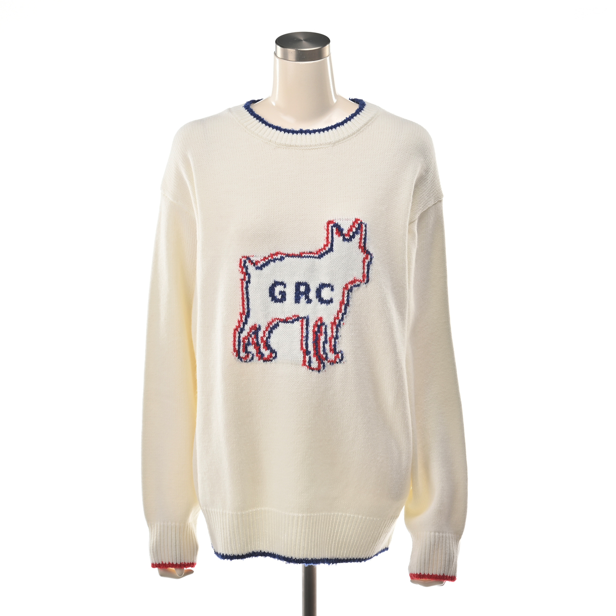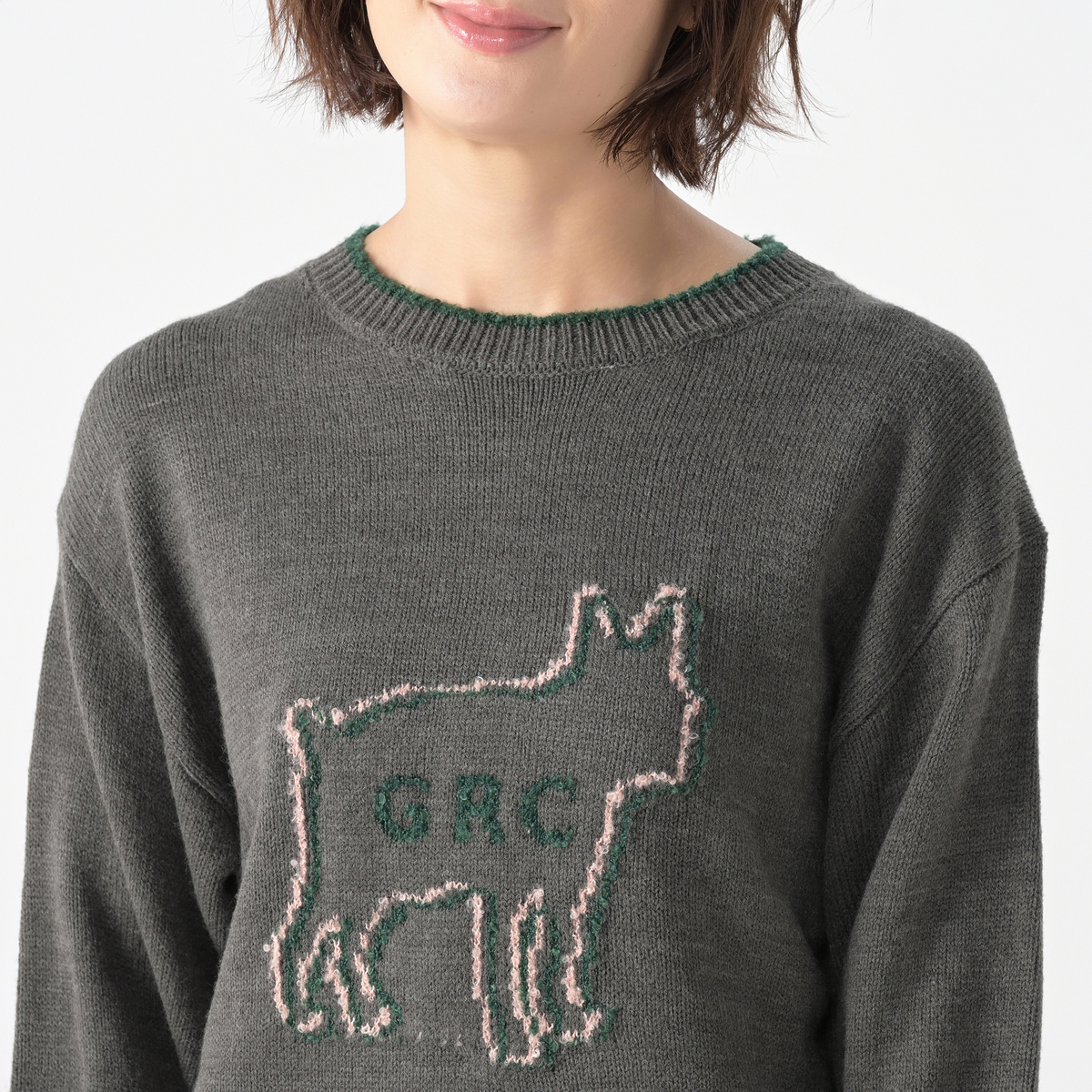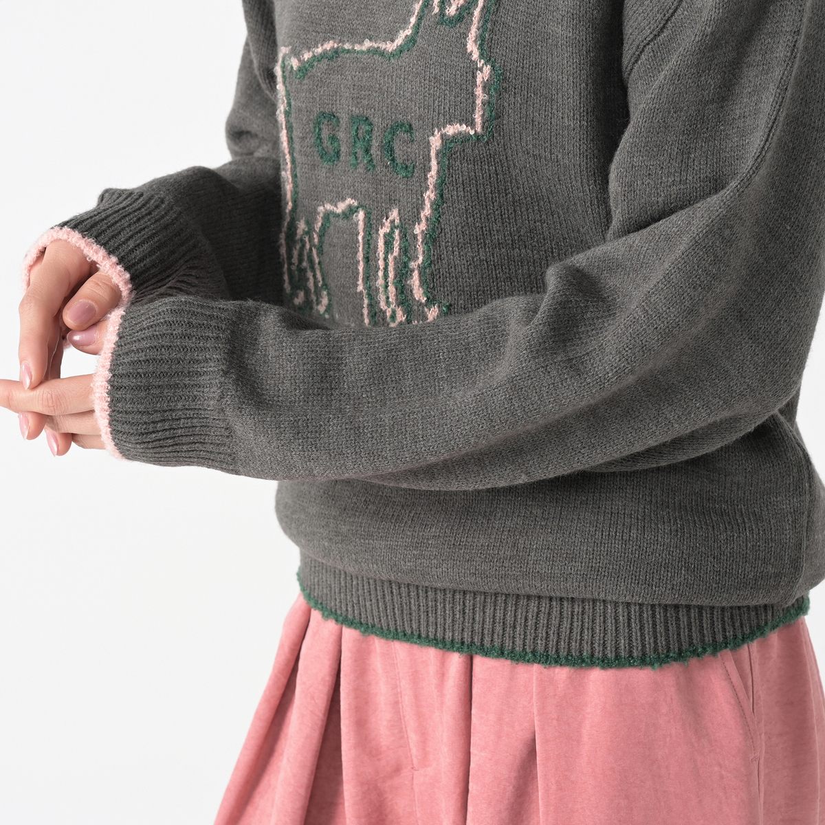 ホット君のシルエットモチーフとGRCロゴがキュートなジャガードニットプルオーバー。クルーネックと袖口、裾口には柄と連動した配色ラインがアクセントになり、ベーシックな形ながら個性を引き立てます